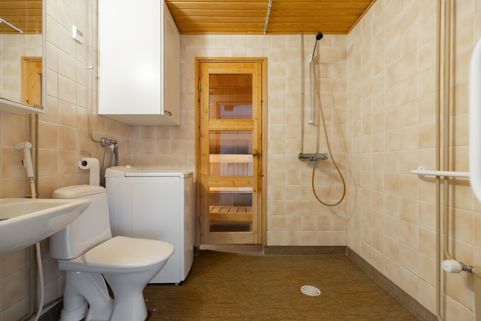 - Sauna, sähkökiuas, kylpyhuone, suihku, peilikaappi, kaapit, pesukoneliitäntä, kiinteät valaisimet.
