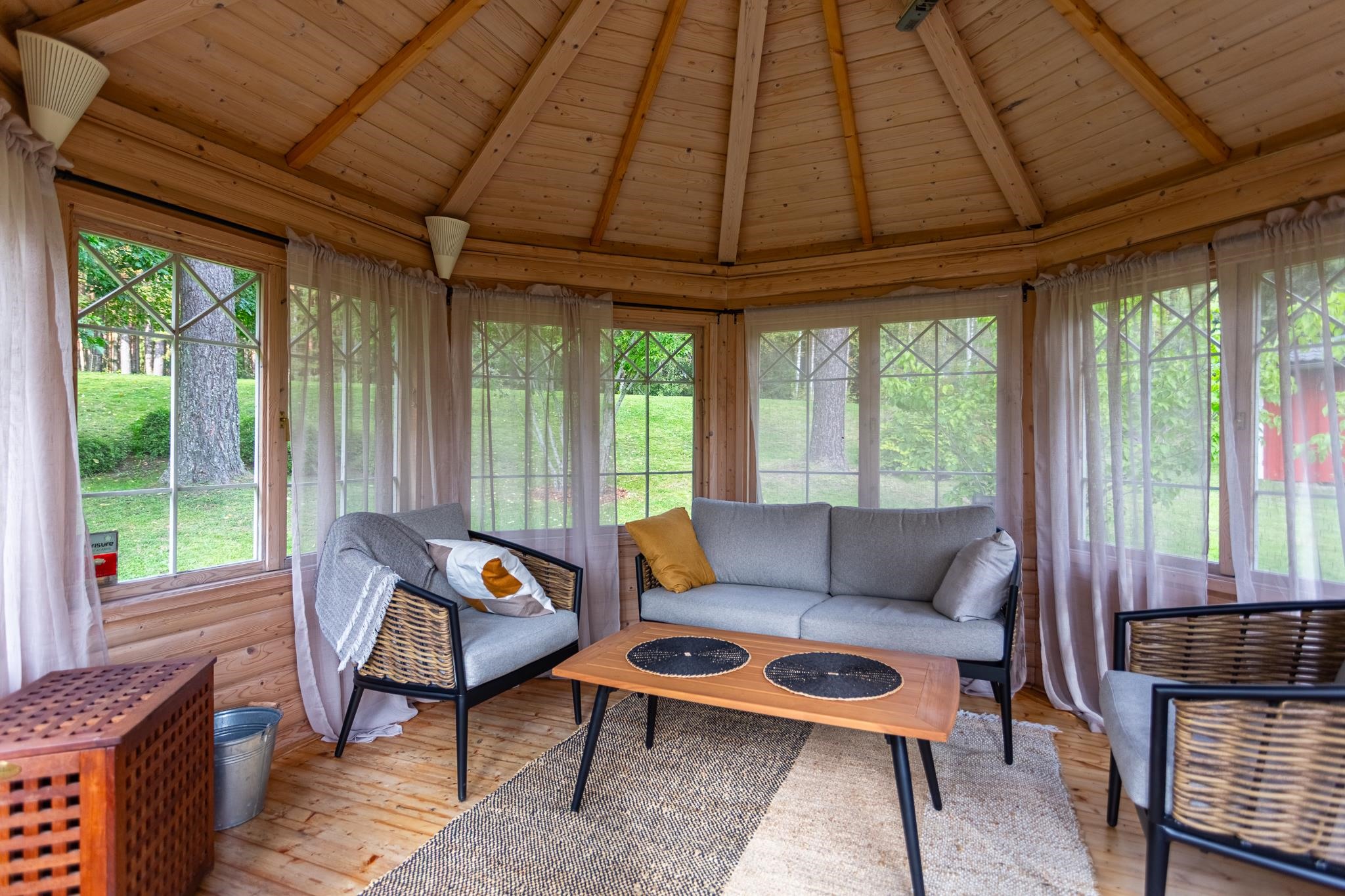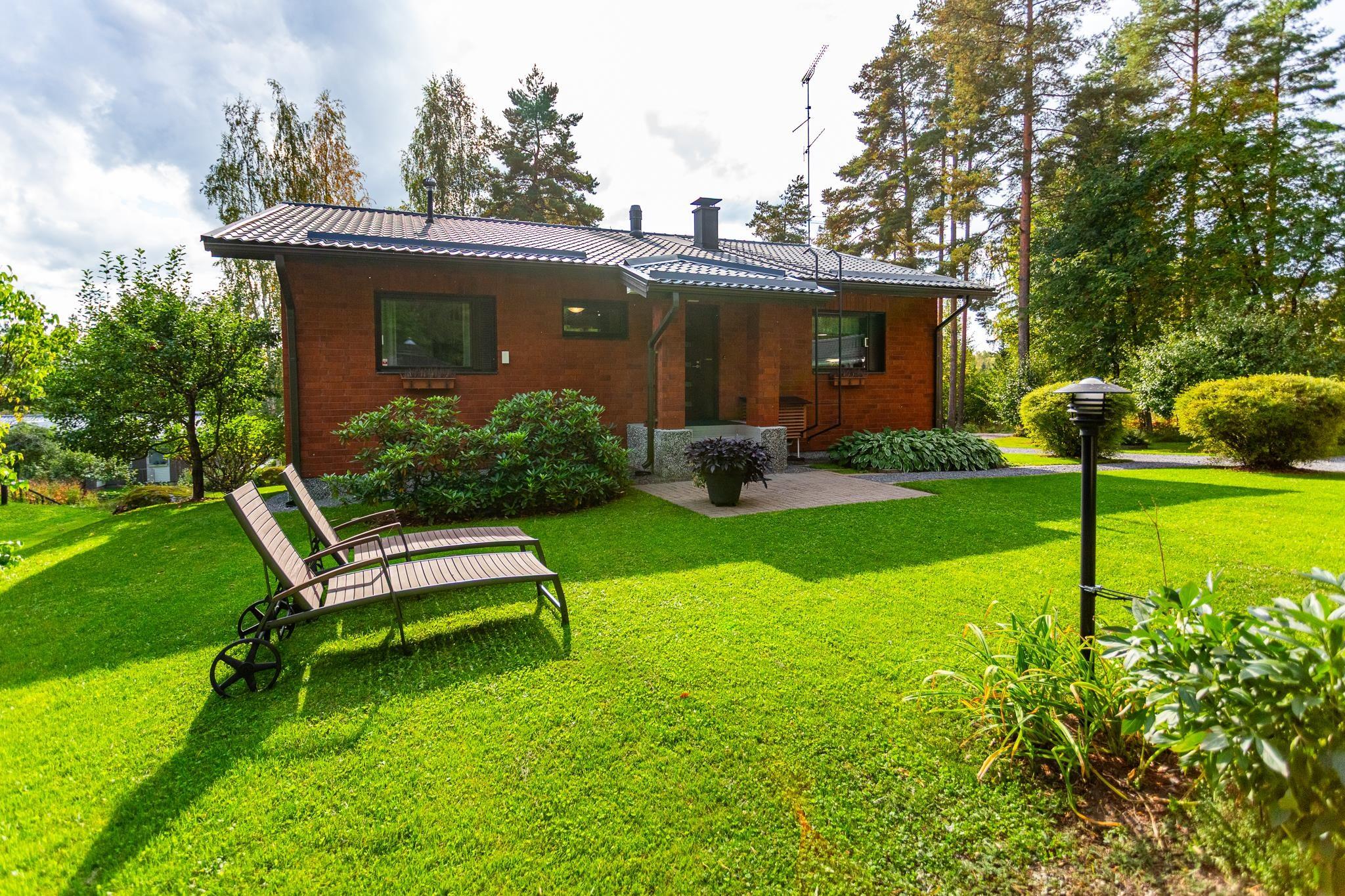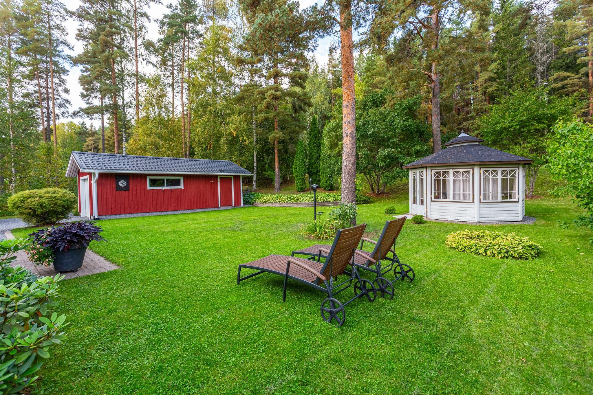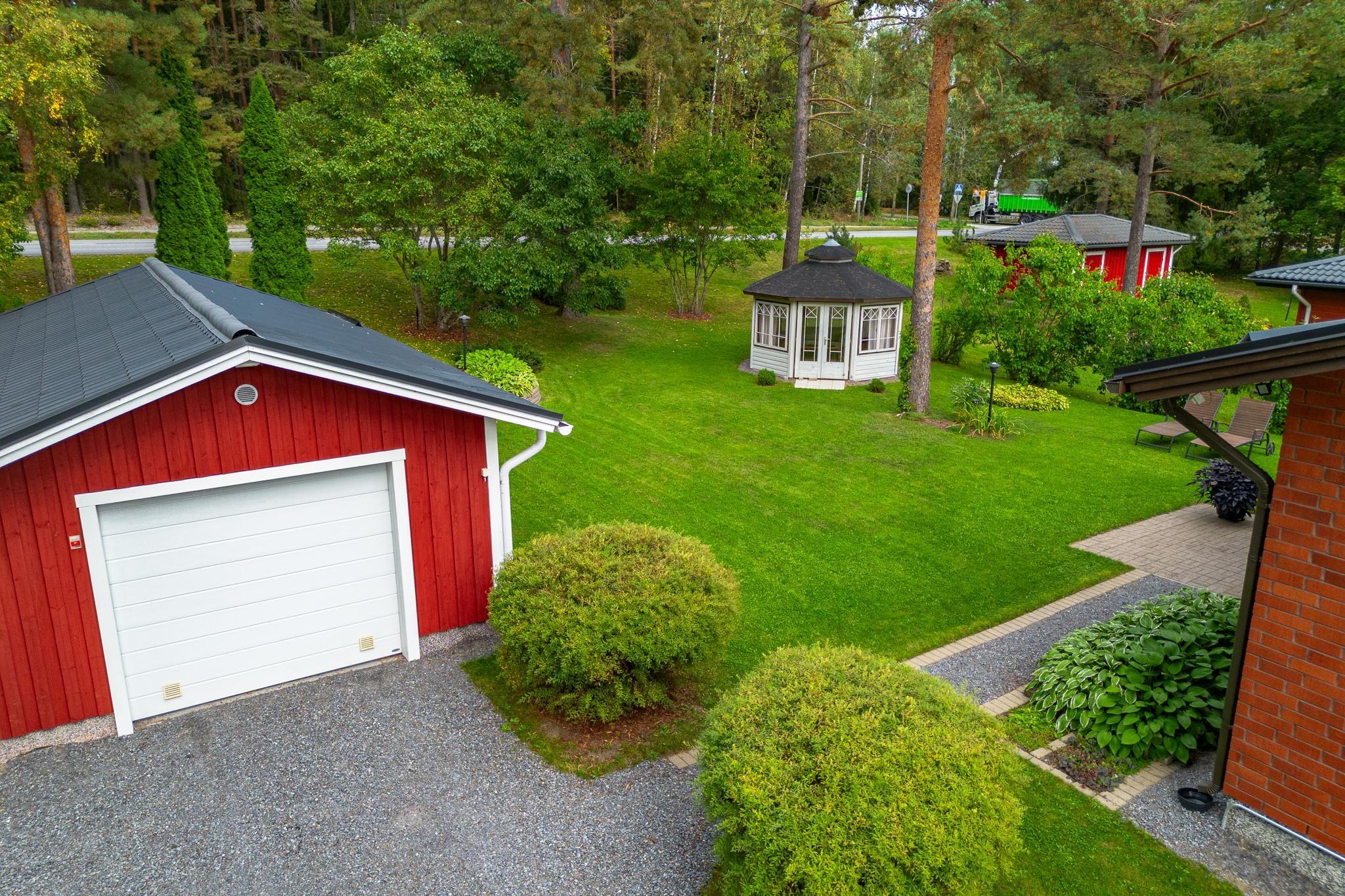 Molemmissa autotalleissa sähköauton latausmahdollisuus ja huvimajassa voi viettää mukavia syksyn iltoja.