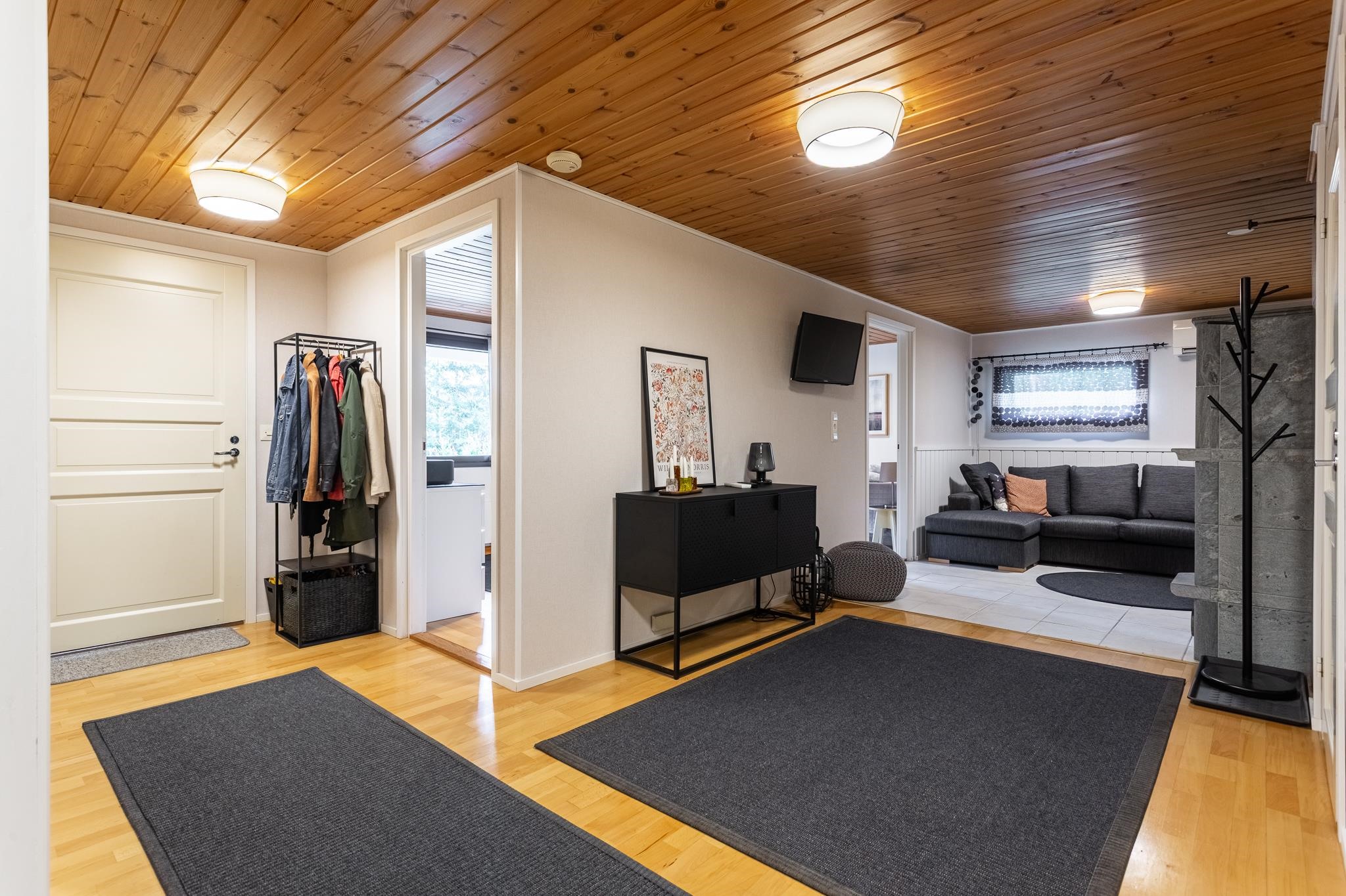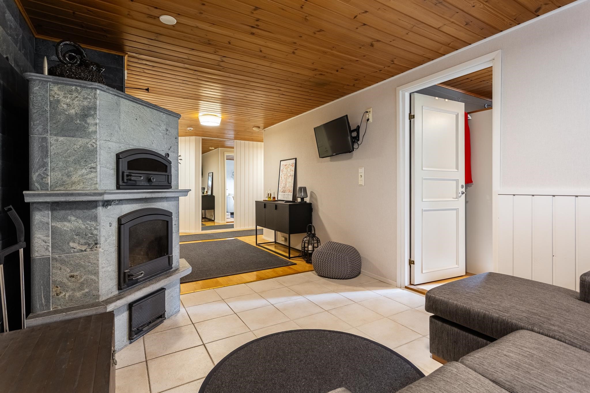 Keittiö: Lattia parketti, seinät maali/puupaneeli, väliseinä kaakeli. Olohuone: Lattia parketti, seinät tapetti. Kodinhoitohuone: Lattia laatta, seinät maali, välitila laatta. Sauna: Lattia laatta, seinät puupaneeli/kivilaatta. Kylpyhuone: Suihkutila lattia laatta, seinät kaakeli. Wc: Wc:t lattia laatta, seinät kaakeli. Makuuhuoneet: Lattia parketti, seinät tapetti. Takkatila: Lattia laatta, seinät tapetti/puupaneeli/vuolukivilaatta.