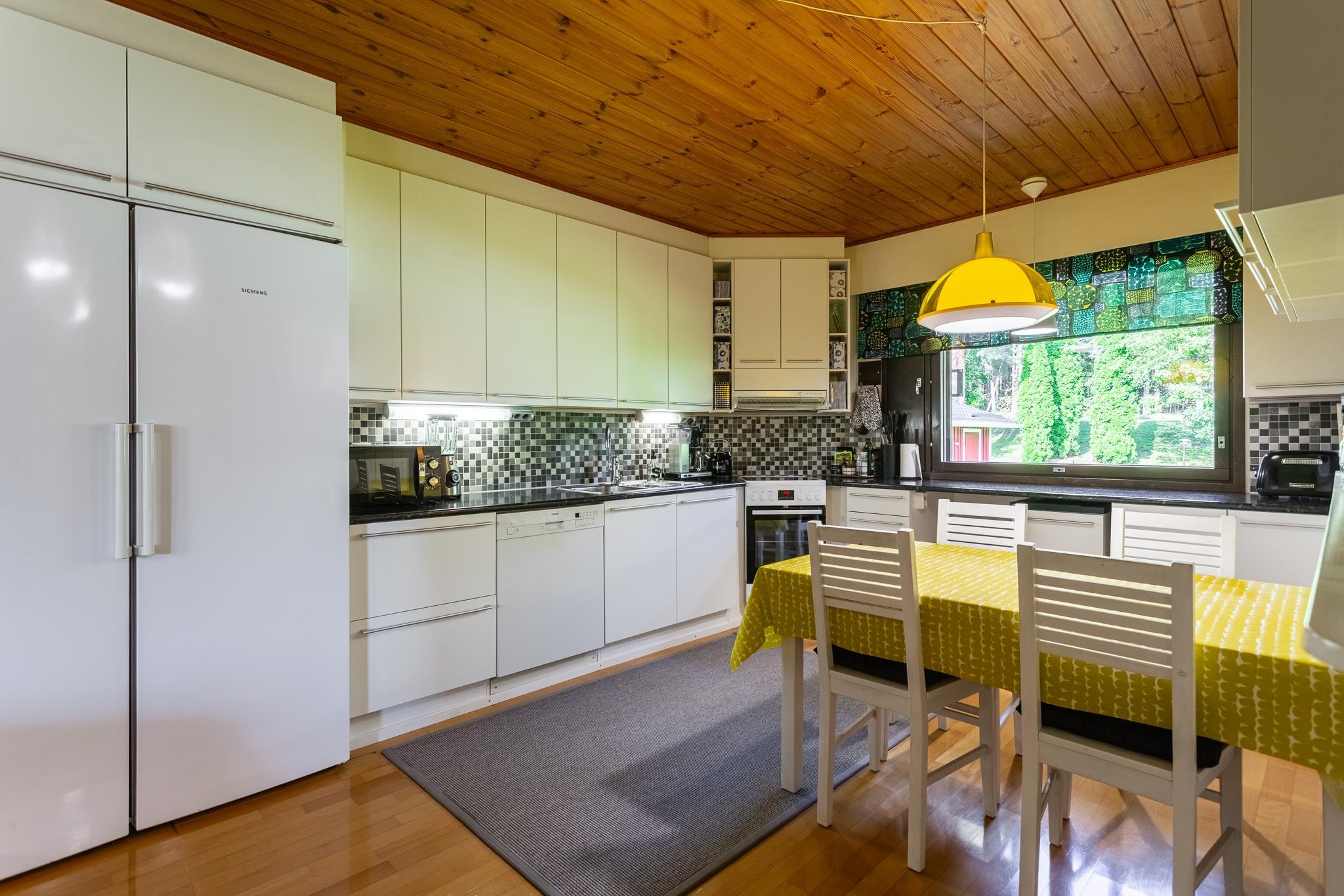 - Jääkaappi, pakastekaappi, liesituuletin, astianpesukone, irralliset saarekkeet Aputaso, pöytätasojen materiaali Laminaatti.