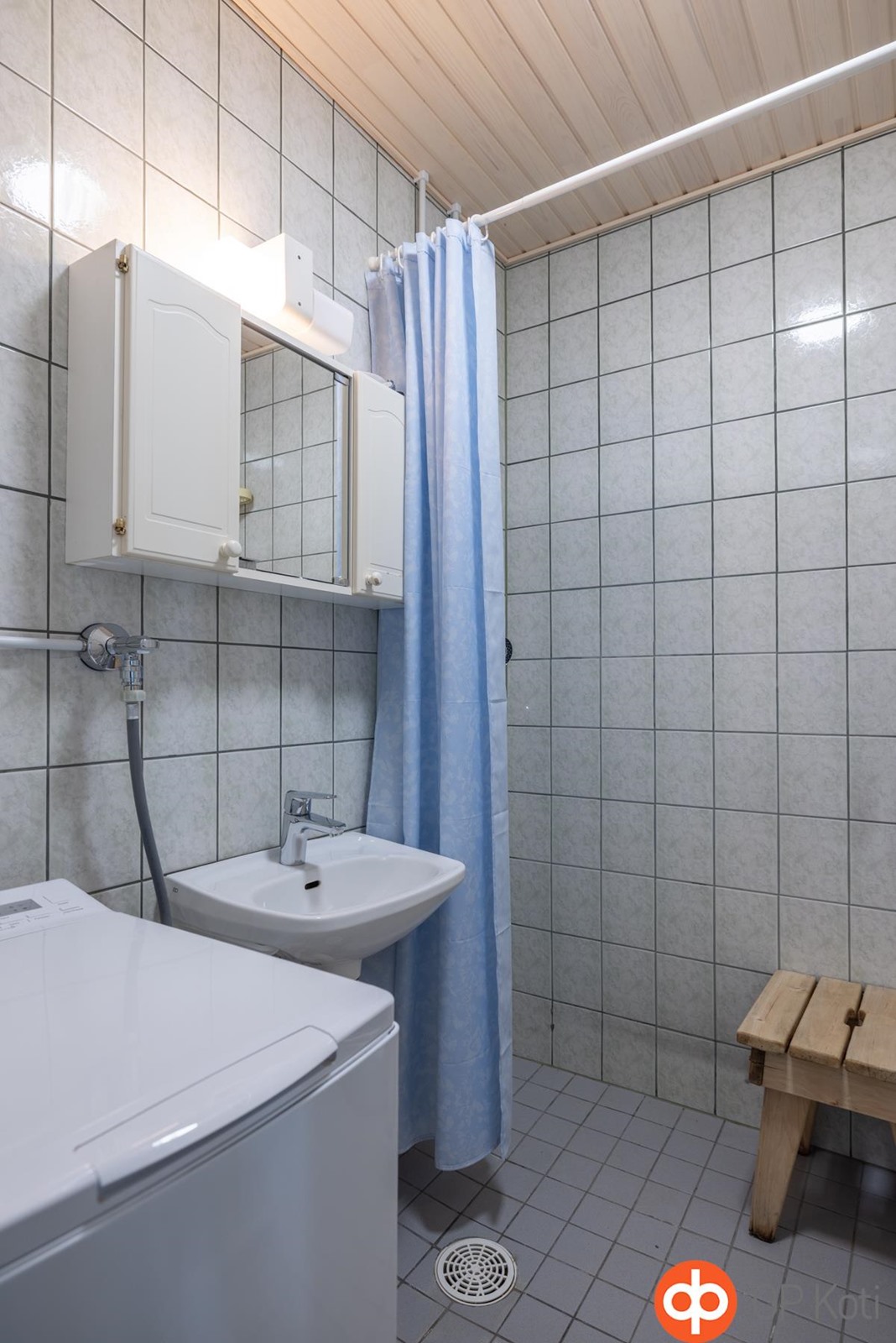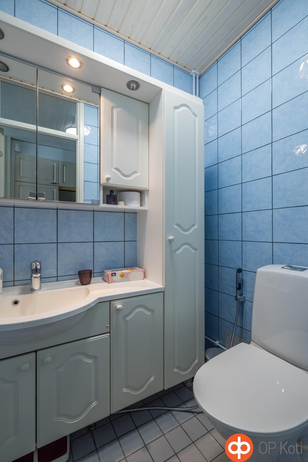 - Kylpyhuone, erillinen wc, suihku, peilikaappi, pesukoneliitäntä. WC: allaskaappi, peilikaappi