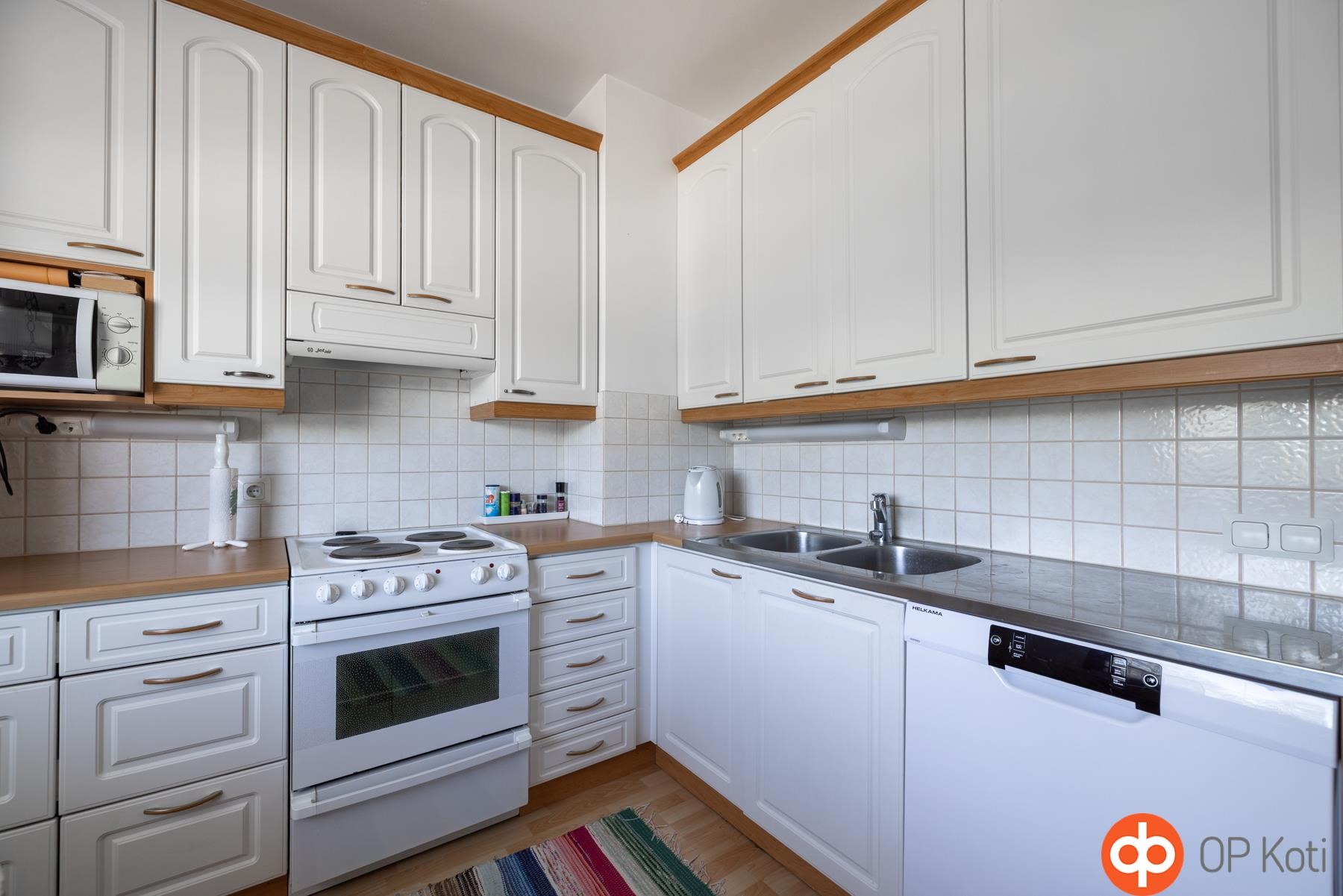 - Jääkaappipakastin, sähköliesi, liesituuletin, astianpesukone, kaapistot, kiinteät valaisimet.