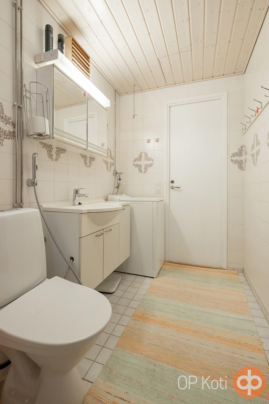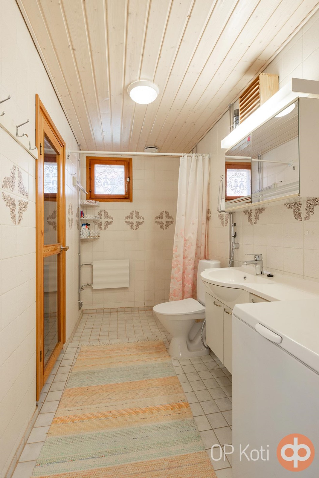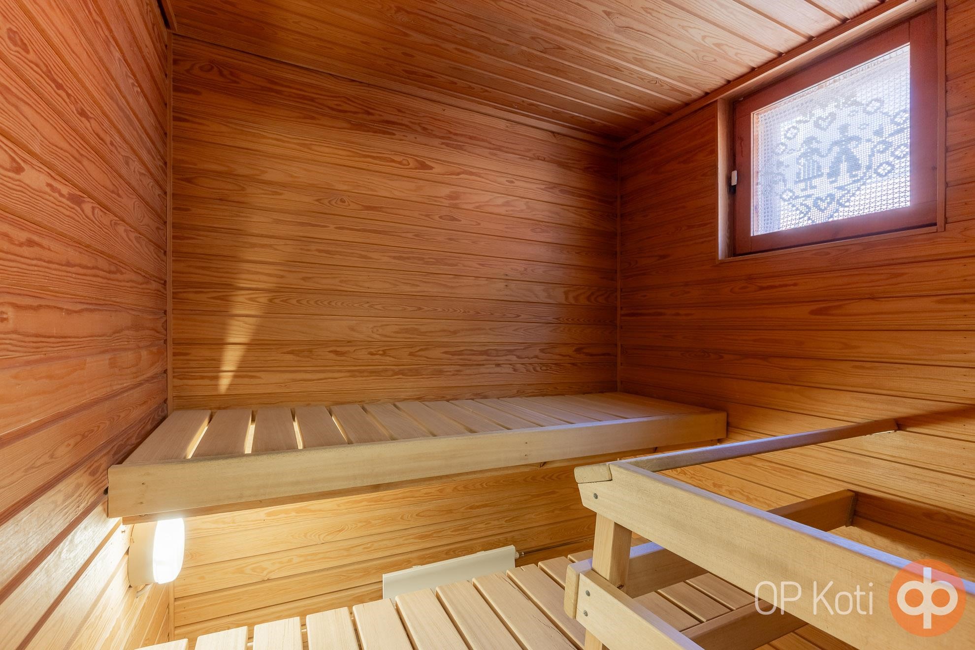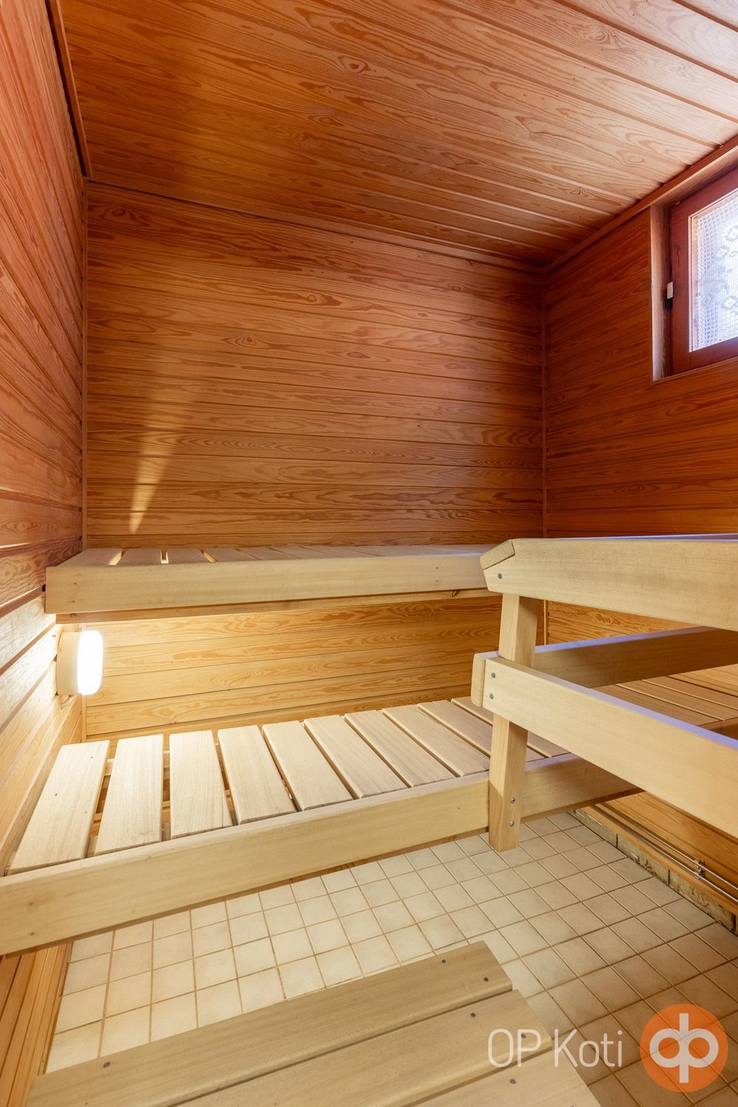 - Sauna, sähkökiuas, kylpyhuone, suihku, suihkuseinä, peilikaappi, allaskaappi, pesukoneliitäntä, kiinteät valaisimet.