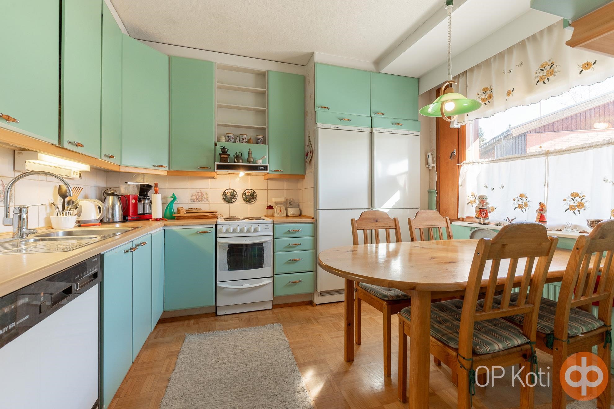 - Jääkaappipakastin 2kpl, lattialiesi, liesituuletin, astianpesukone, kaapistot, kiinteät valaisimet.