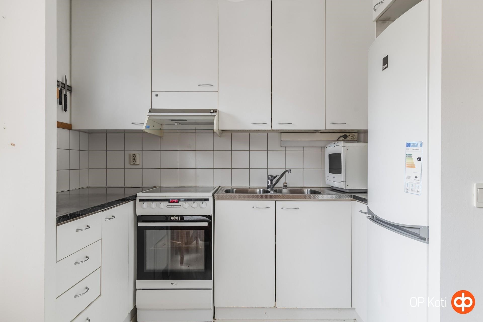 - Jääkaappipakastin, sähköliesi, liesikupu, kaapistot, kiinteät valaisimet.