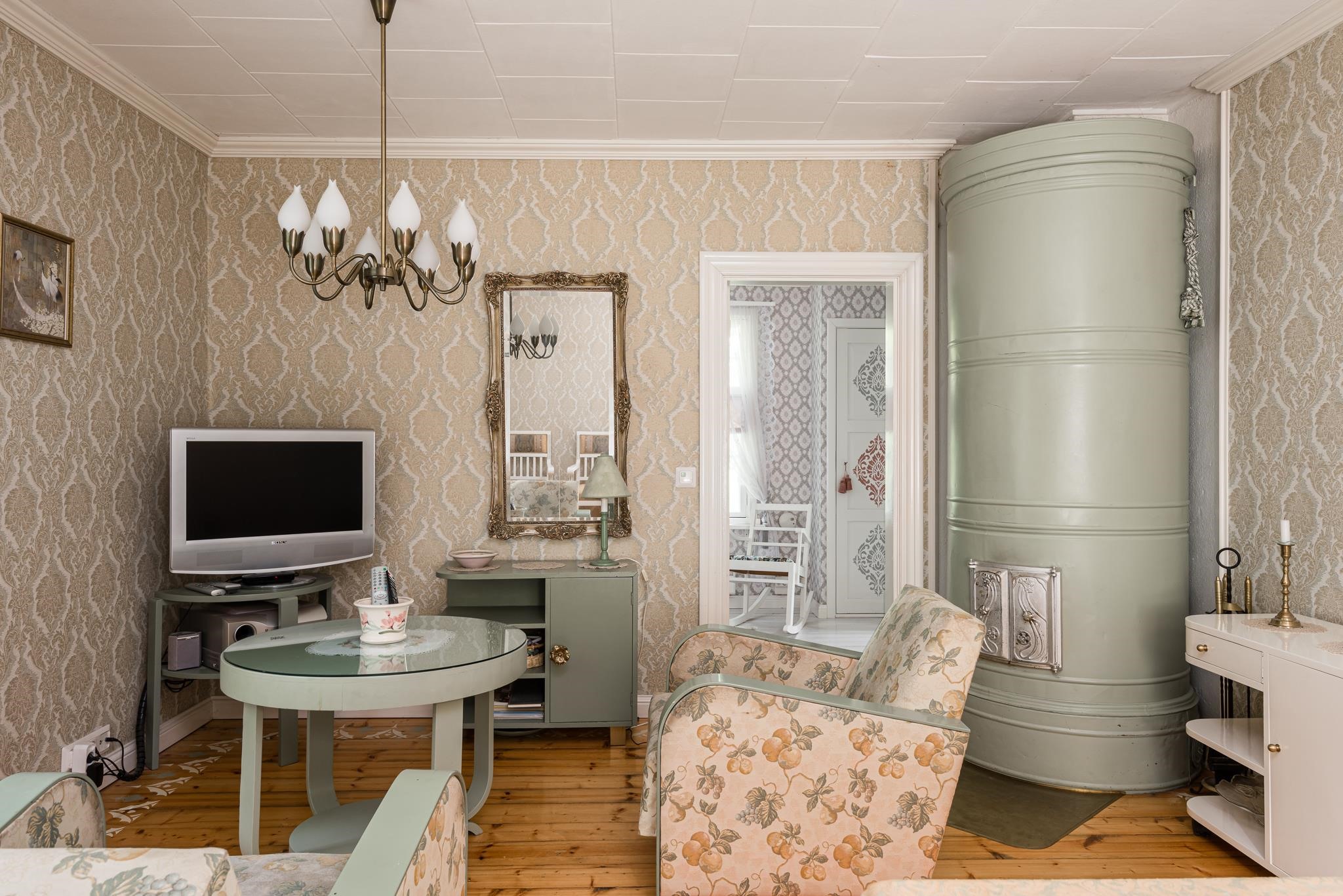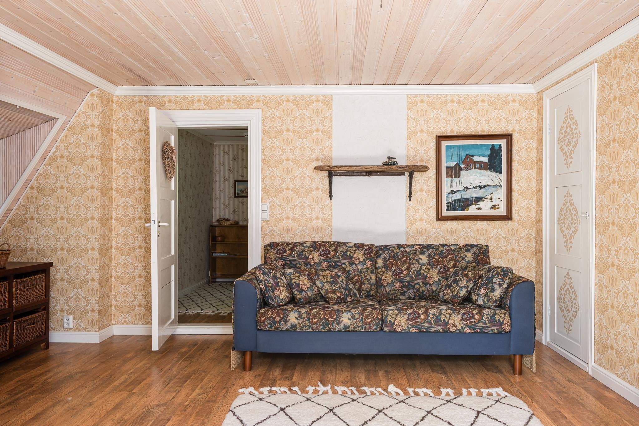 Keittiö: puulattia. Makuuhuone 1: puulattia. Makuuhuone 2: puulattia. Sauna: laatta. Eteinen: puulattia.