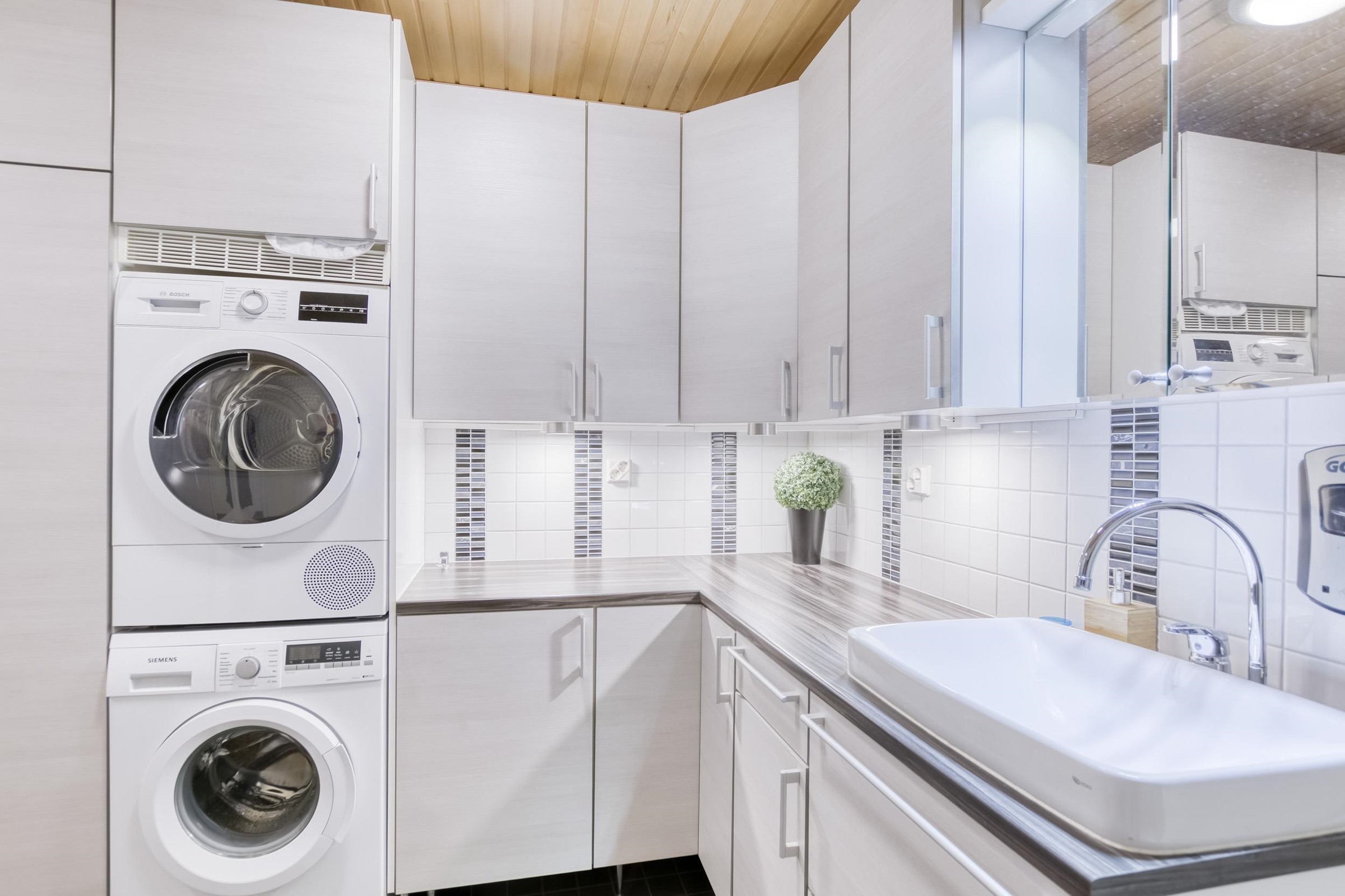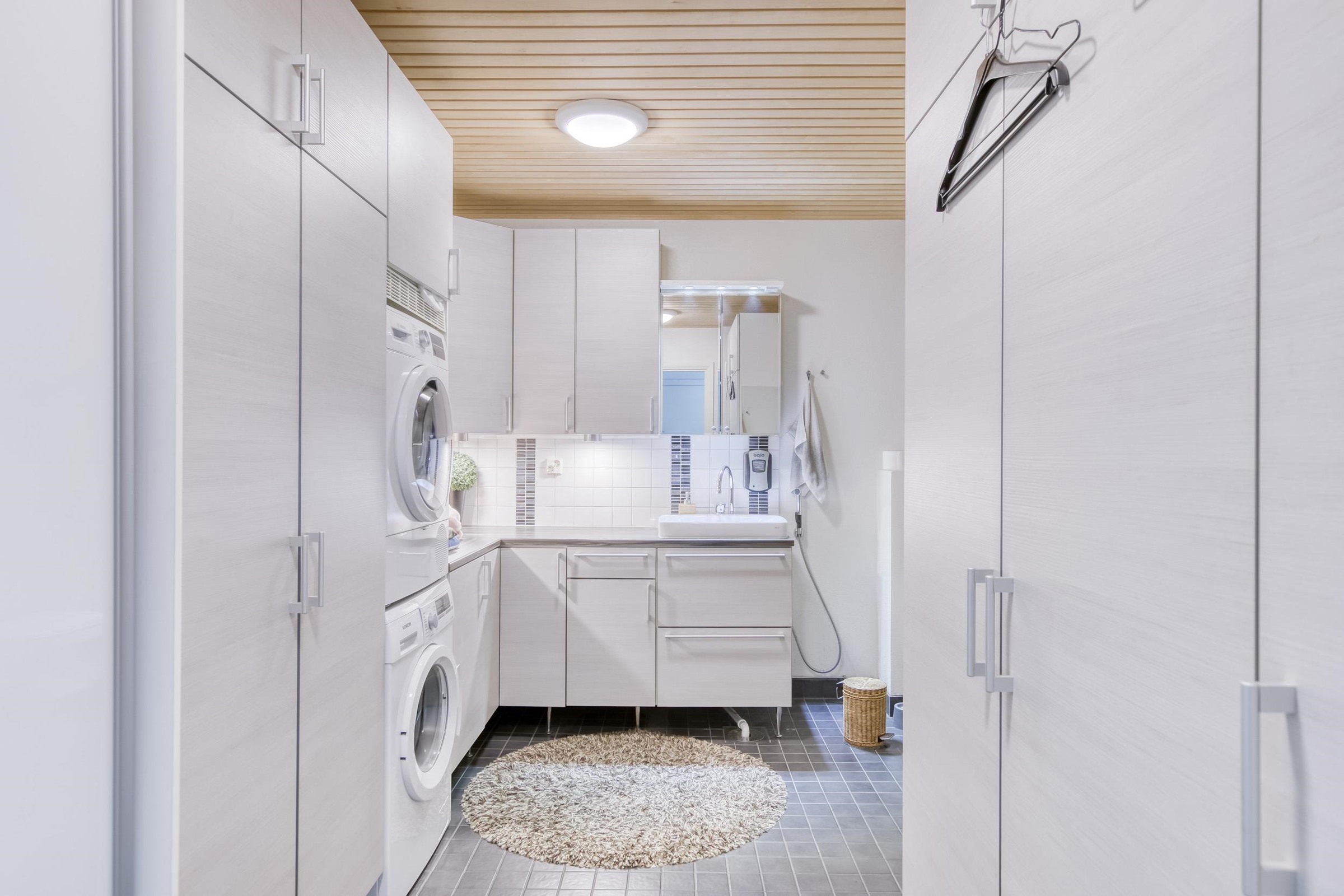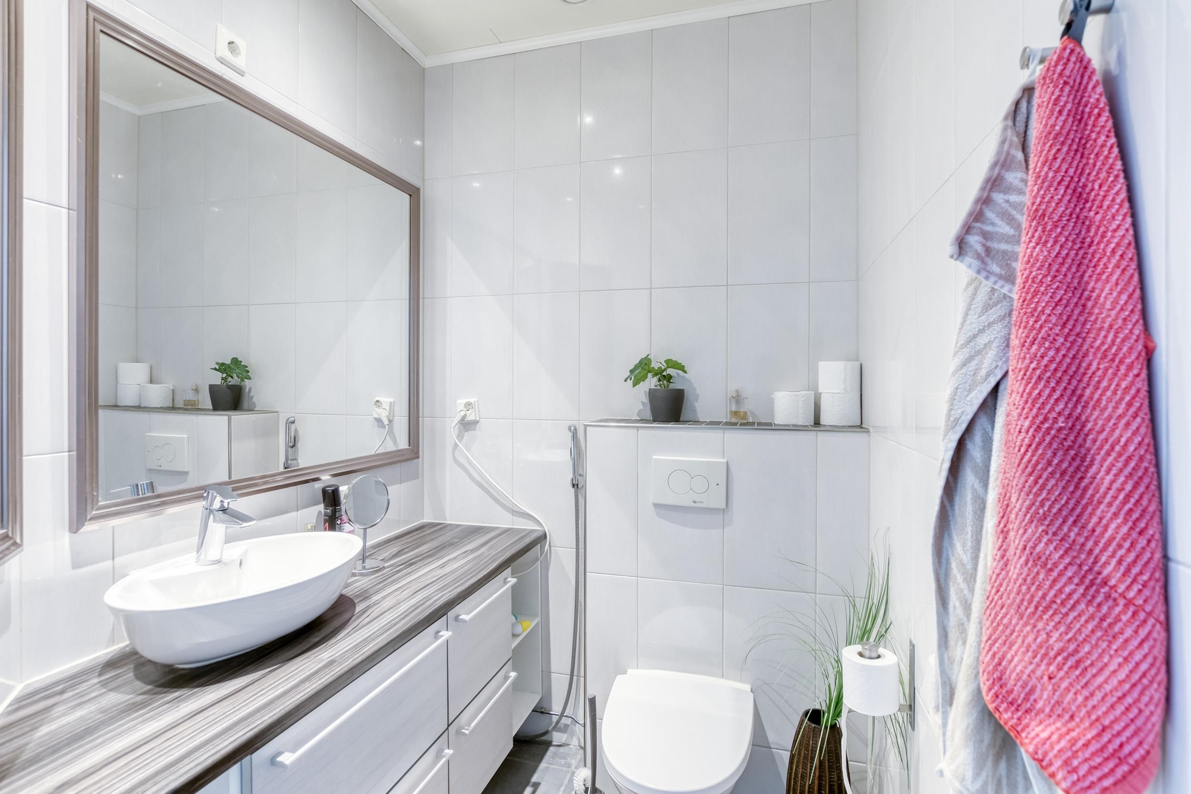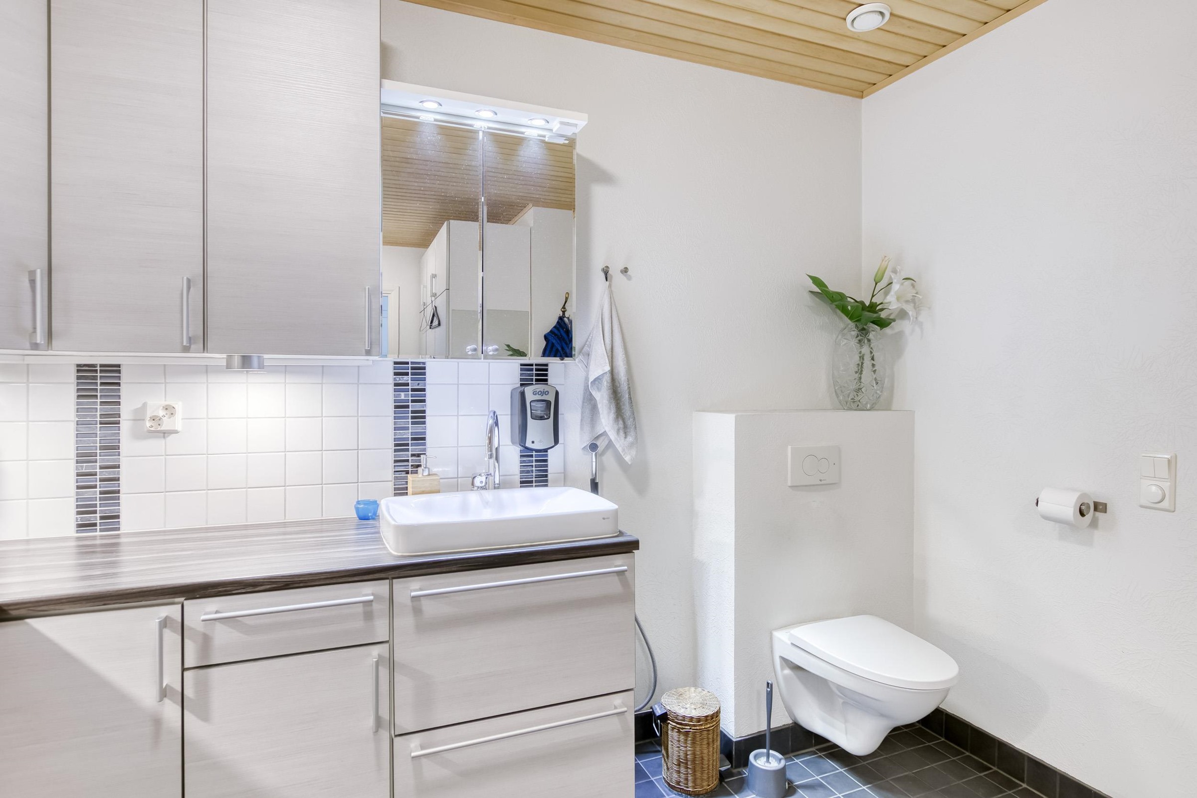 - Sauna, sähkökiuas, kylpyhuone, erillinen wc, suihku, suihkuseinä, peilikaappi, allaskaappi, pesukoneliitäntä, lattialämmitys, kiinteät valaisimet.