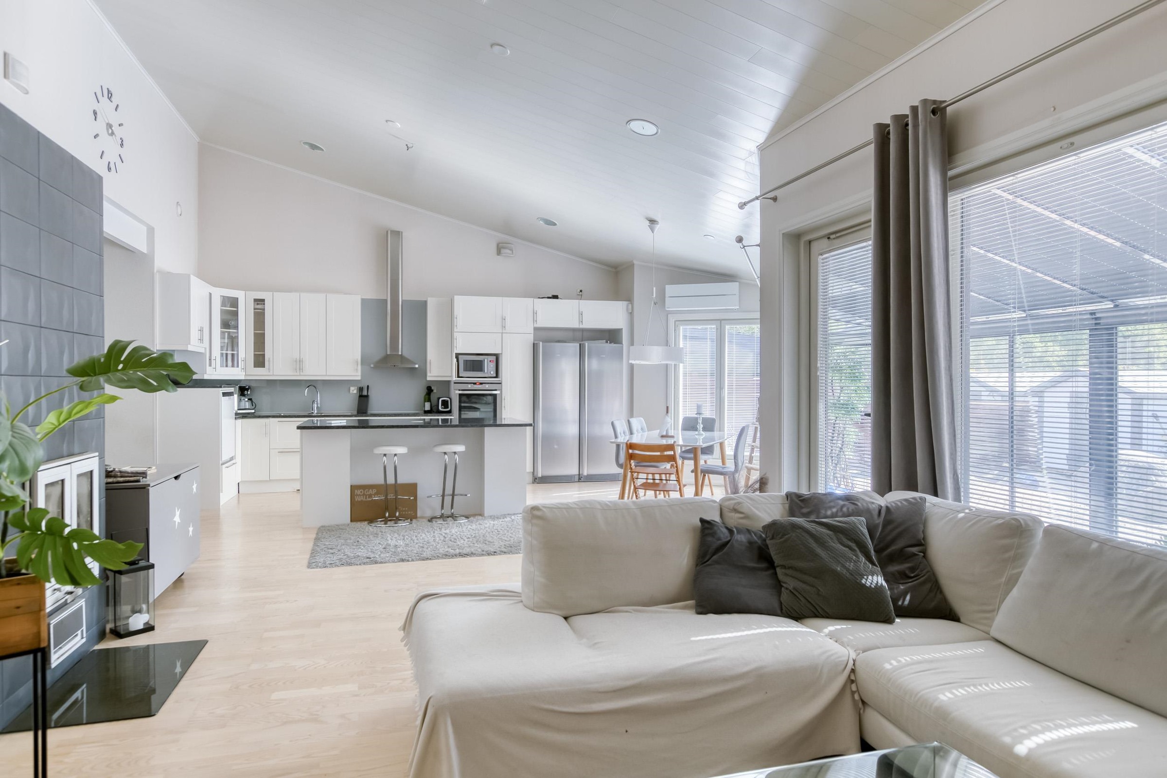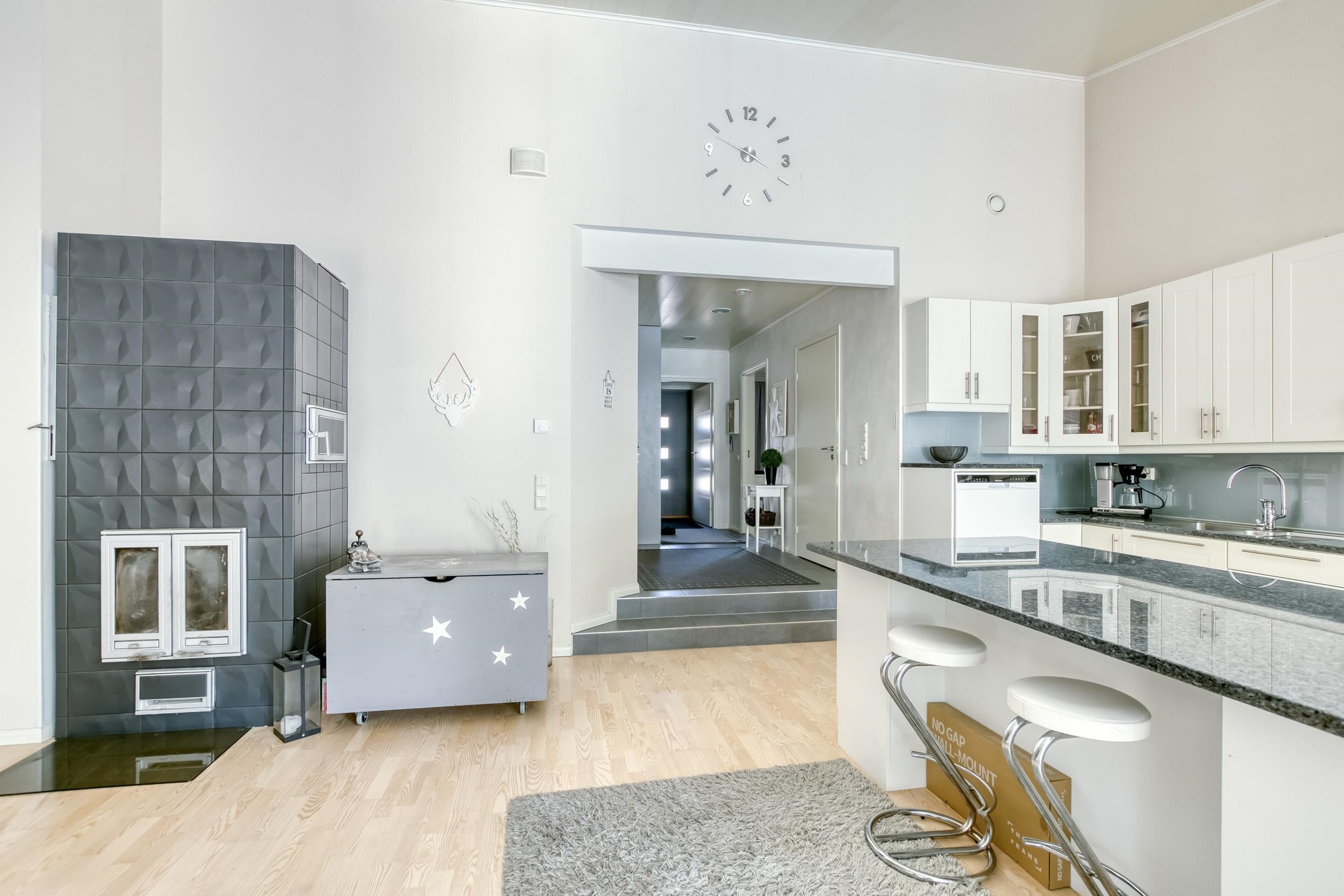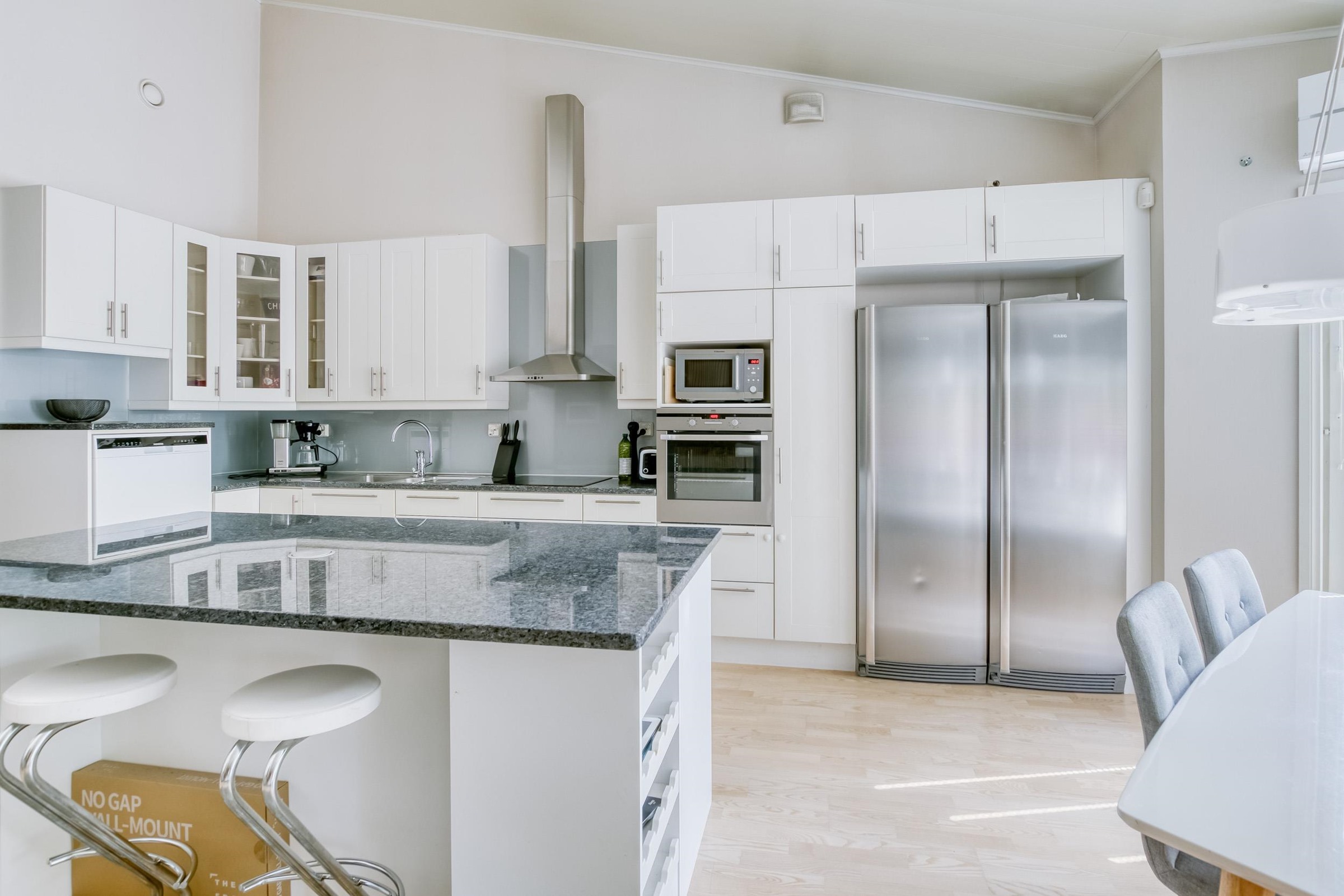 - Jääkaappi, pakastekaappi, erillisuuni, liesitaso induktio, liesituuletin, mikroaaltouuni, astianpesukone, kaapistot, kiinteät valaisimet, Kivitasot.