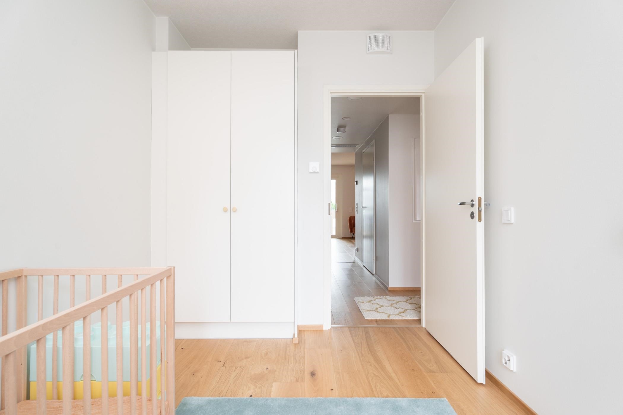 Olohuoneiden, keittiöiden, makuuhuoneiden, vaatehuoneiden ja eteisten lattiat ovat parkettia ja seinät maalattuja.