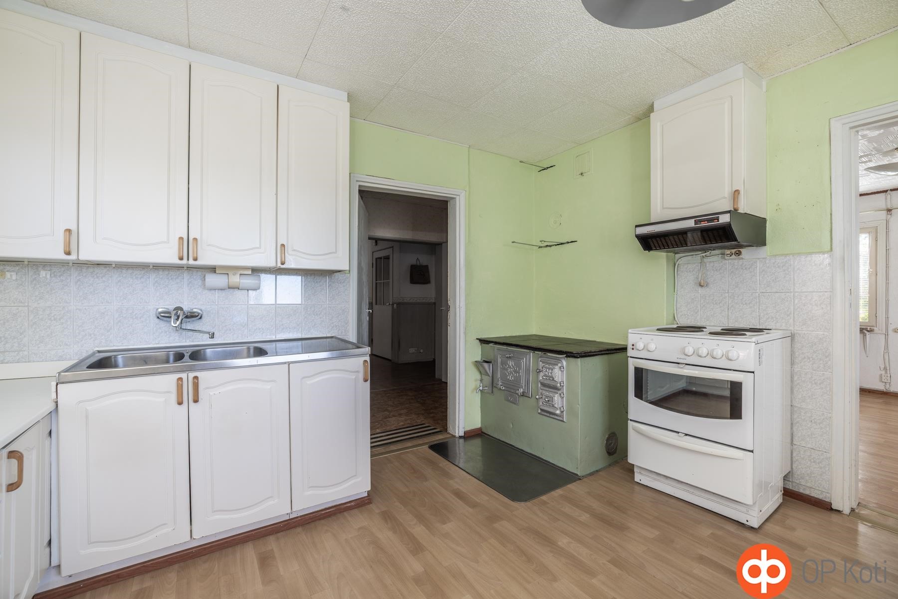 - Jääkaappi, sähköliesi, liesituuletin, kaapistot, kiinteät valaisimet. Puuhella