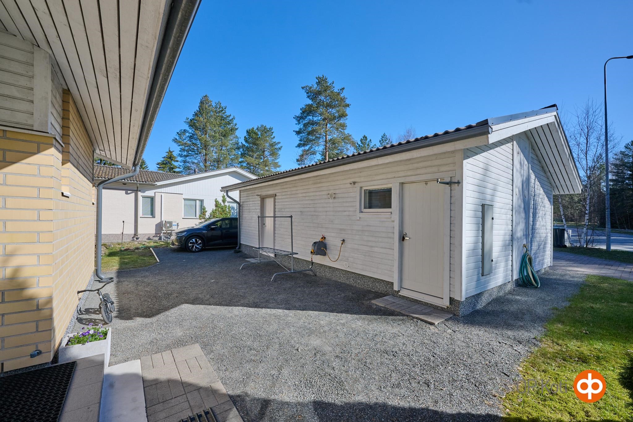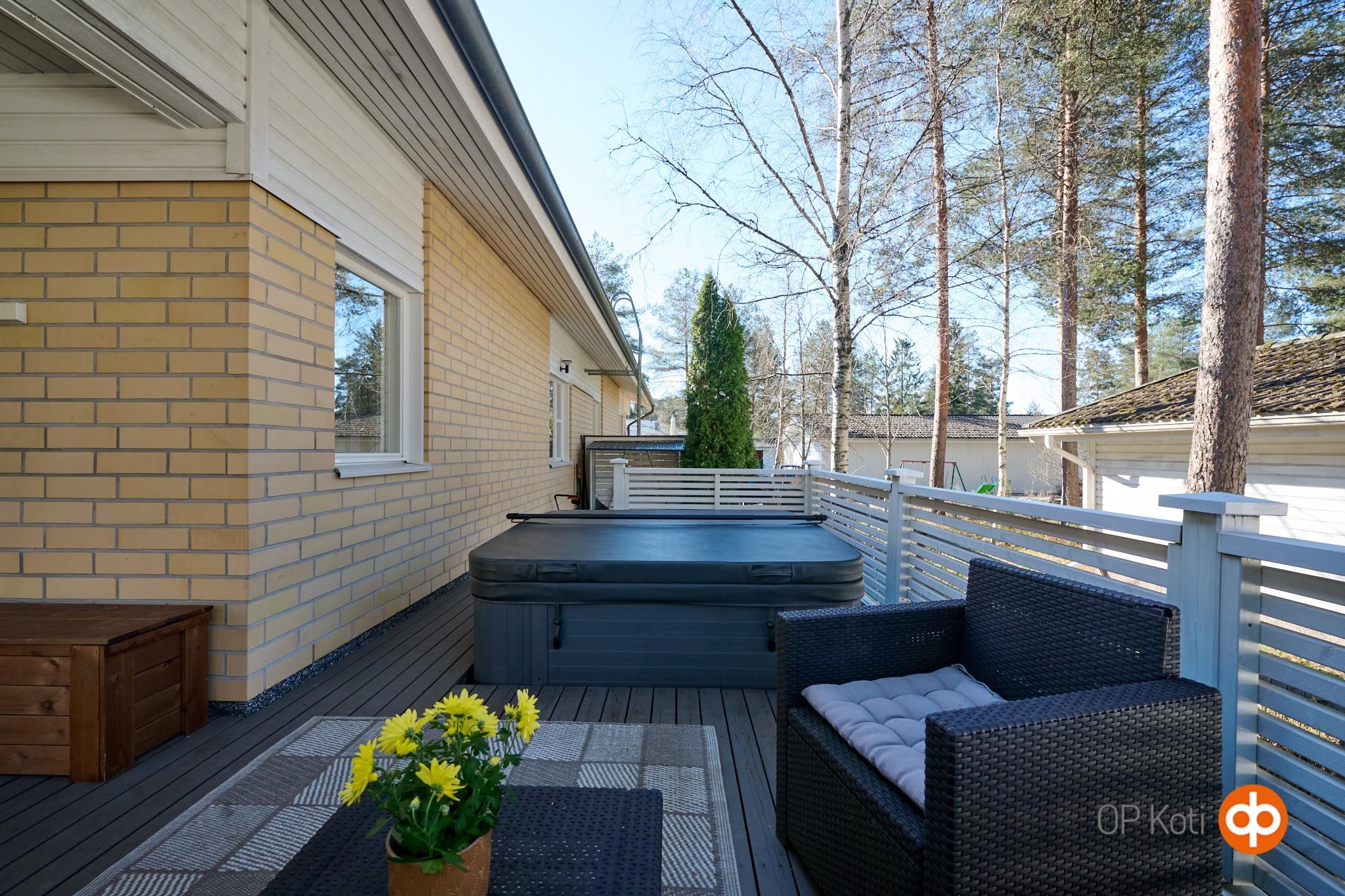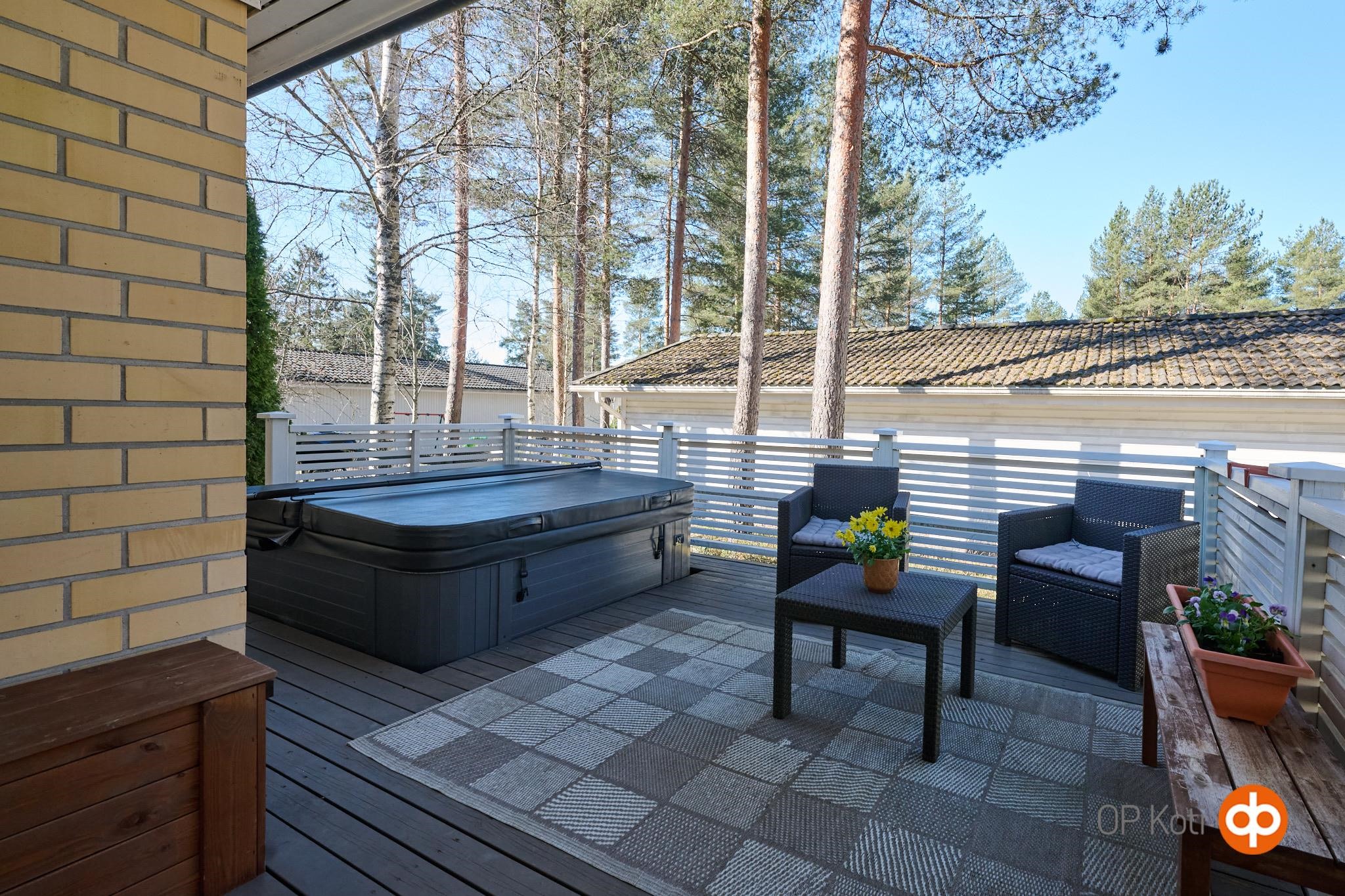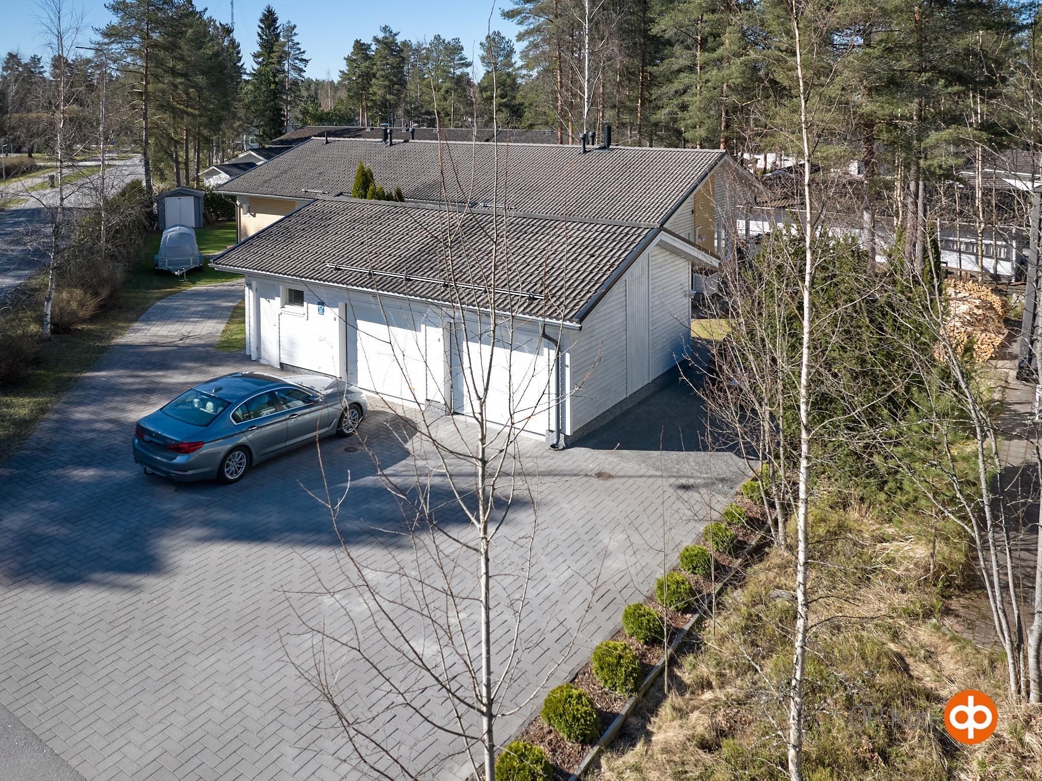 Asunnon suojaisalla takapihalla on terassi, johon on upotettu ulkoporeallas. Piha tarjoaa mukavasti yksityisyyttä ja tilaa oleskeluun. Huoneistoon kuuluu lämmin, noin 19,8 m² autotalli, joka on kunnostettu nykyisen omistajan toimesta. Autotallin yhteydessä on lisäksi noin 7,7 m² lämmin varasto. Etupihalla ja autotallin edustalla on tilaa useammalle ajoneuvolle, myös esimerkiksi matkailuautolle.