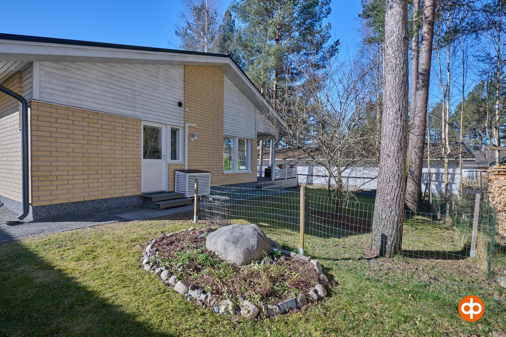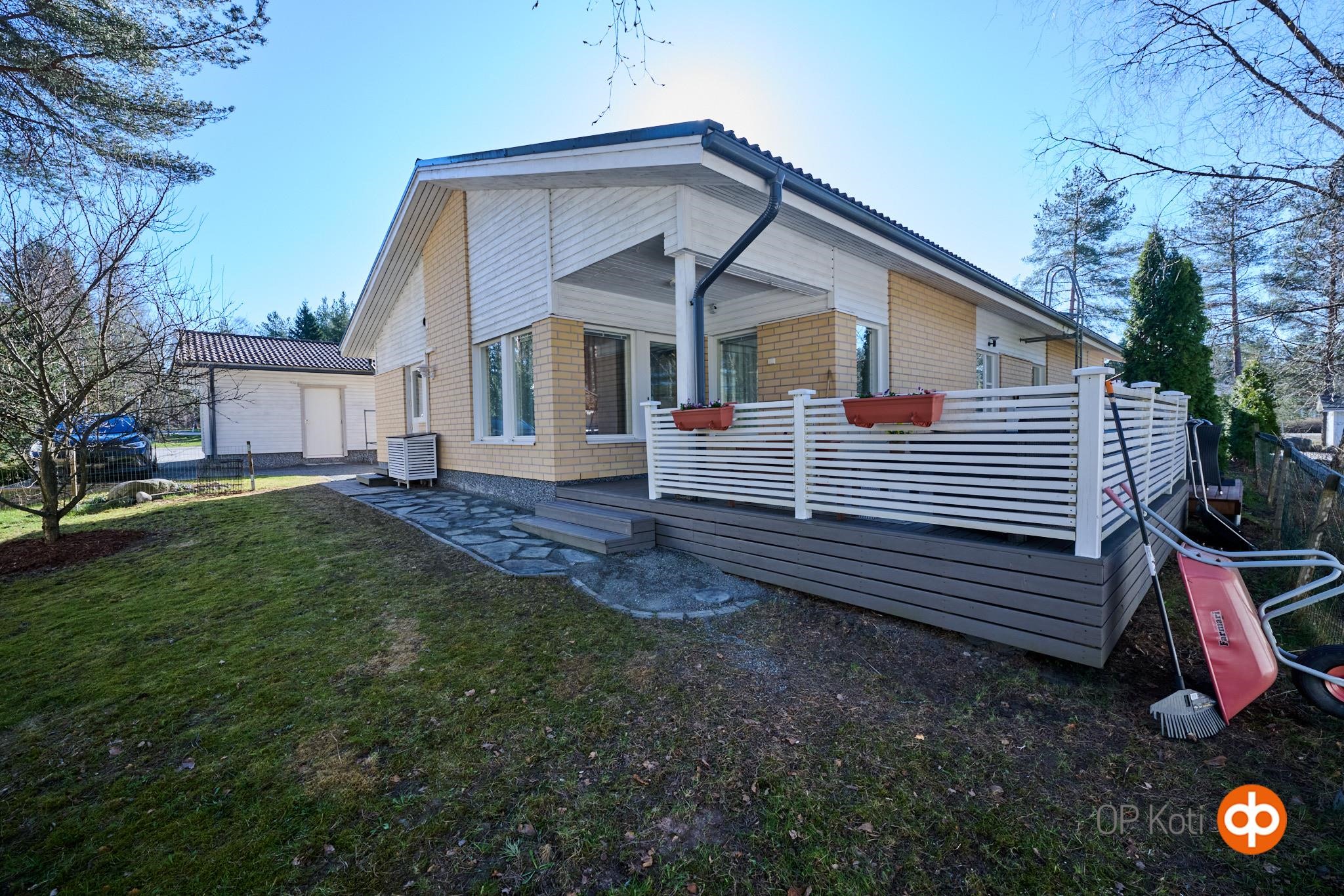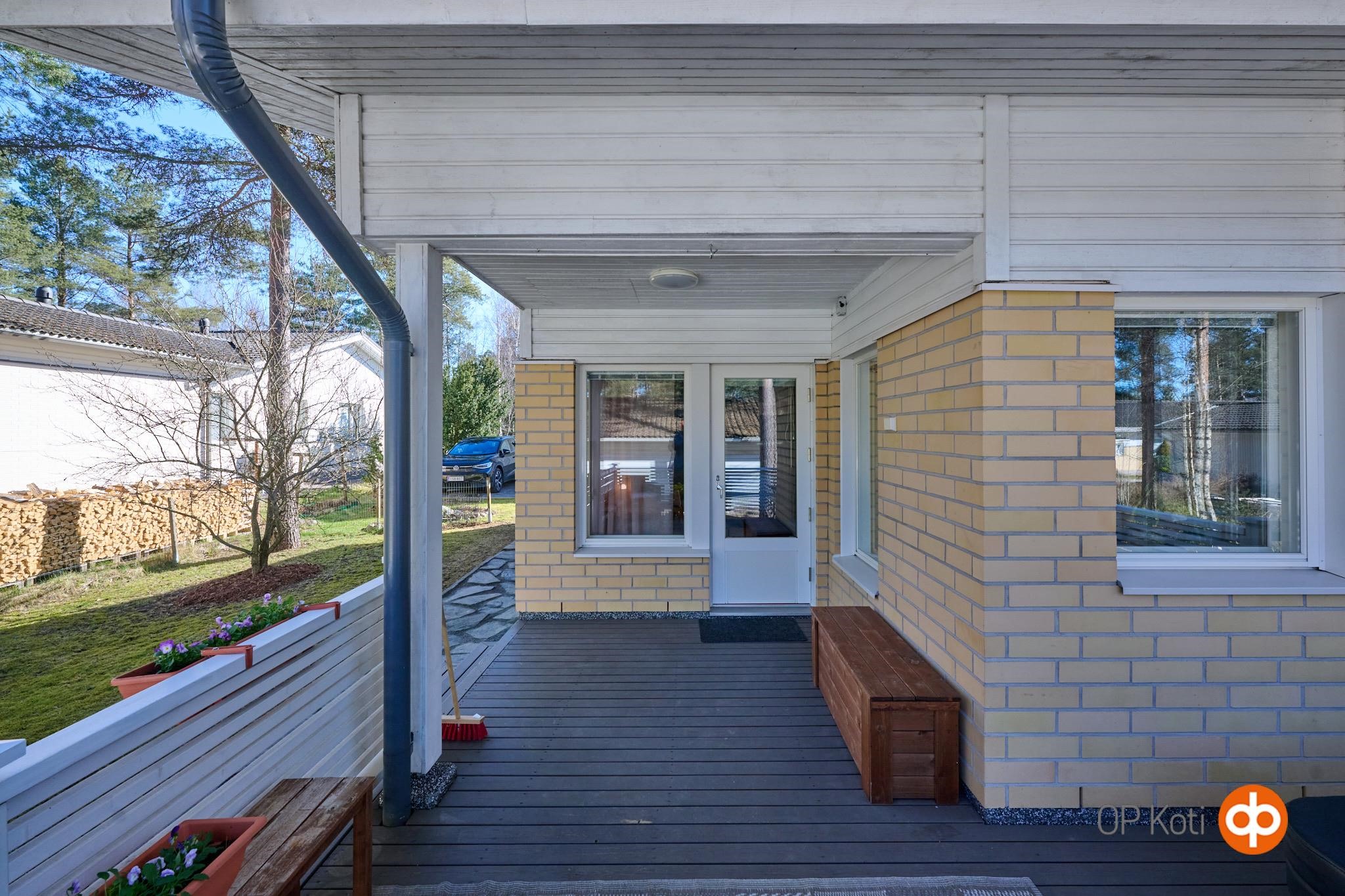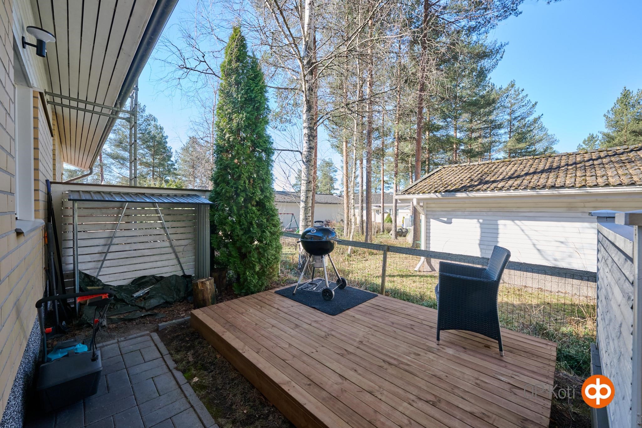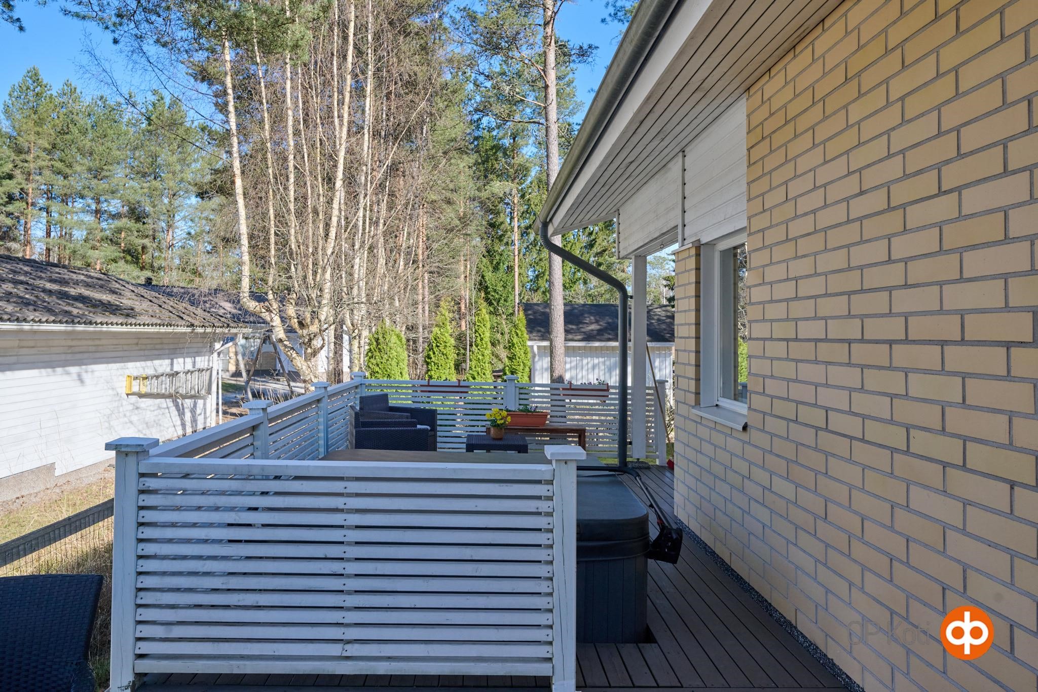 Asunnon suojaisalla takapihalla on terassi, johon on upotettu ulkoporeallas. Piha tarjoaa mukavasti yksityisyyttä ja tilaa oleskeluun. Huoneistoon kuuluu lämmin, noin 19,8 m² autotalli, joka on kunnostettu nykyisen omistajan toimesta. Autotallin yhteydessä on lisäksi noin 7,7 m² lämmin varasto. Etupihalla ja autotallin edustalla on tilaa useammalle ajoneuvolle, myös esimerkiksi matkailuautolle.