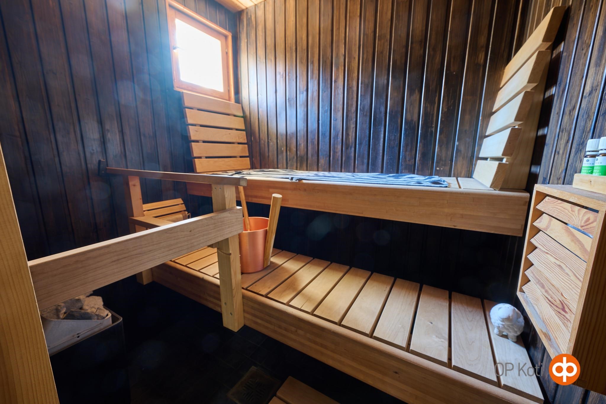 - Sauna, sähkökiuas, kylpyhuone, erillinen wc, suihku, kaapit (kodinhoitohuoneessa), pesukoneliitäntä, lattialämmitys, kiinteät valaisimet.