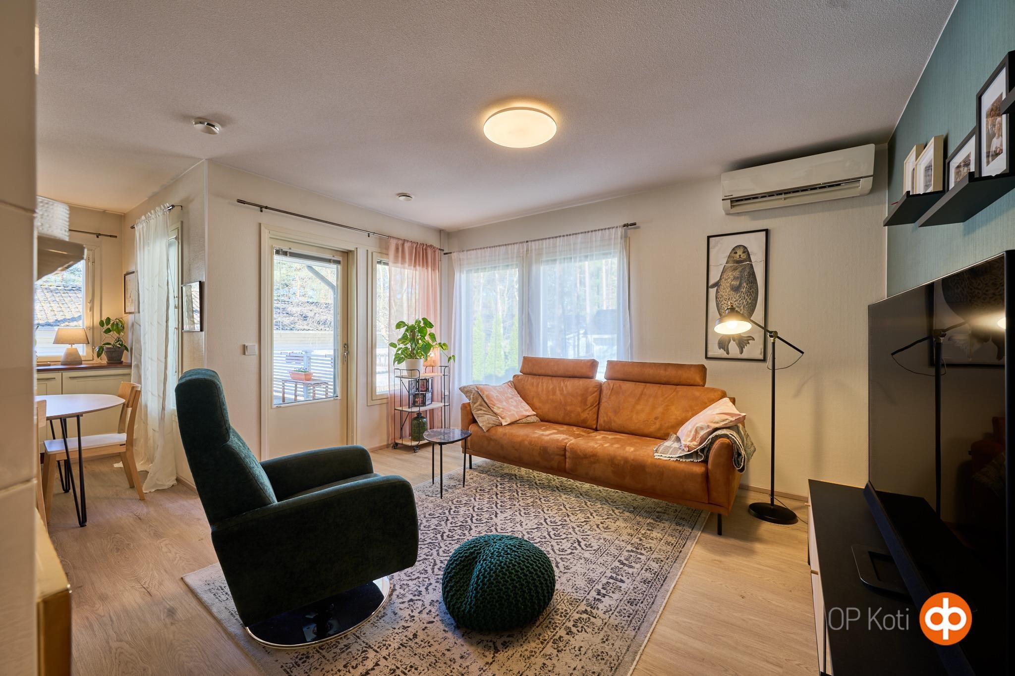 Asunnon tilaratkaisut ovat käytännölliset ja väljät. Olohuone ja keittiö muodostavat yhtenäisen, avaran kokonaisuuden. Makuuhuoneita on kaksi, kooltaan 12,2 m² ja 14,6 m². Lisäksi asunnossa on kaksi erillistä wc:tä, kodinhoitohuone, vaatehuone sekä sauna- ja pesutilat. Varusteluun kuuluu muun muassa ilmalämpöpumppu, varaava kaakelitakka, ulkoporeallas ja valokuituyhteys.