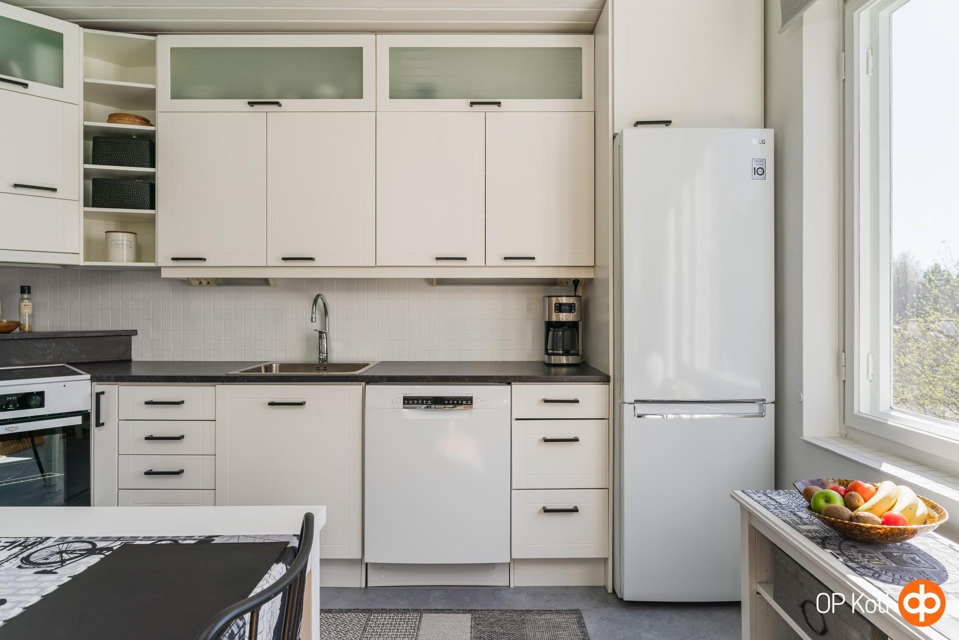 - Jääkaappipakastin, induktioliesi, liesituuletin, astianpesukone, kaapistot, kiinteät valaisimet. Laminaattitasot