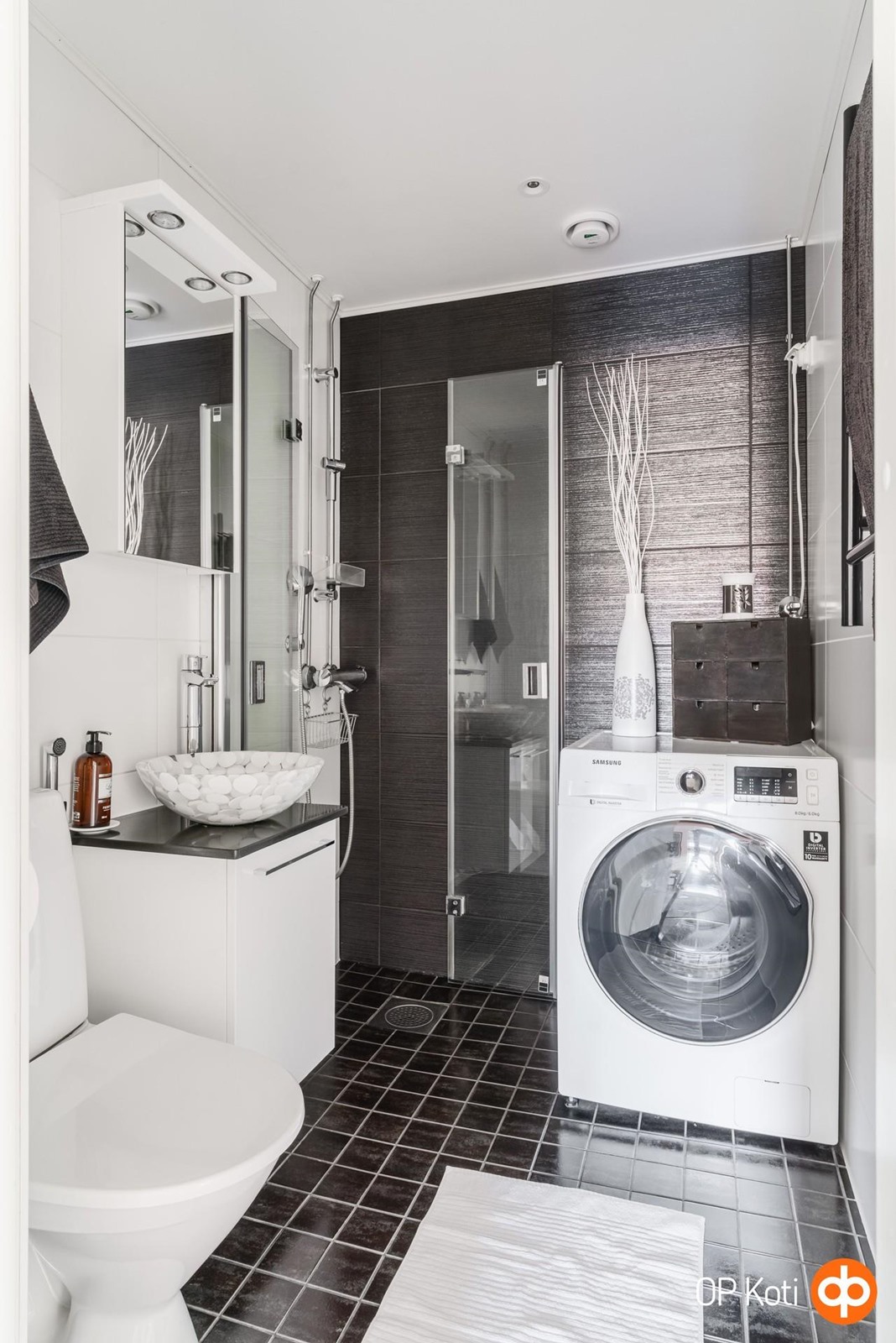 - Kylpyhuone, suihku, suihkuseinä 2 kpl, peilikaappi, allaskaappi, pesukoneliitäntä, lattialämmitys (sähkö), kiinteät valaisimet. Pyyhepatteri (vesikiertoinen)
