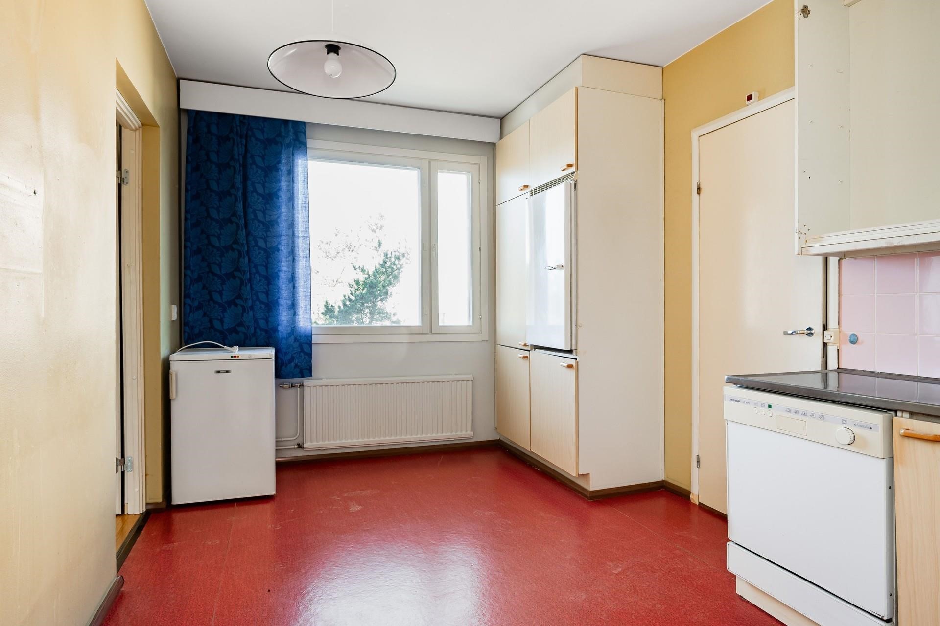 Huoneisto on noin 95 m² ja huonejako sopii hyvin niin perheelle kuin tilaa arvostavalle parillekin: olohuoneen ja kolmen makuuhuoneen kokonaisuus tekee arjesta sujuvaa, ja eteisen säilytystilat auttavat pitämään tavarat järjestyksessä. Keittiössä on kaikki perusvarusteet ruoanlaittoon, mutta kaapistot ja koneet ovat alkuperäishenkisiä ja kaipaavat päivitystä - tästä on helppo suunnitella omaan makuun sopiva kokonaisuus. Kylpyhuone ja erillinen wc tuovat arkeen käytännöllisyyttä, ja oma sauna tarjoaa rauhallisen paikan päivän päätteeksi. Huoneiston kunto on kokonaisuutena heikko, mutta pohja on toimiva ja materiaalit on helppo uusia remontin yhteydessä.