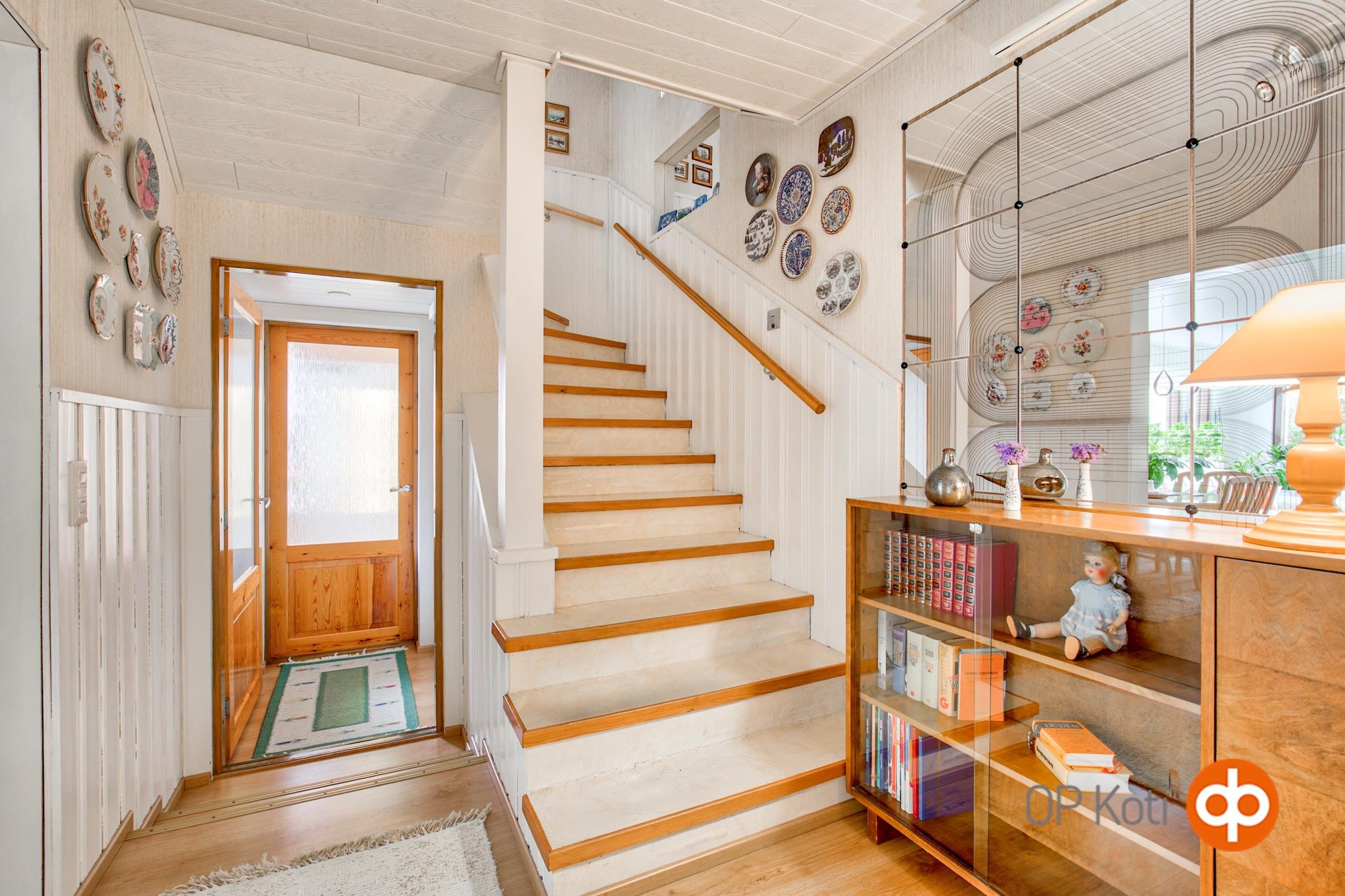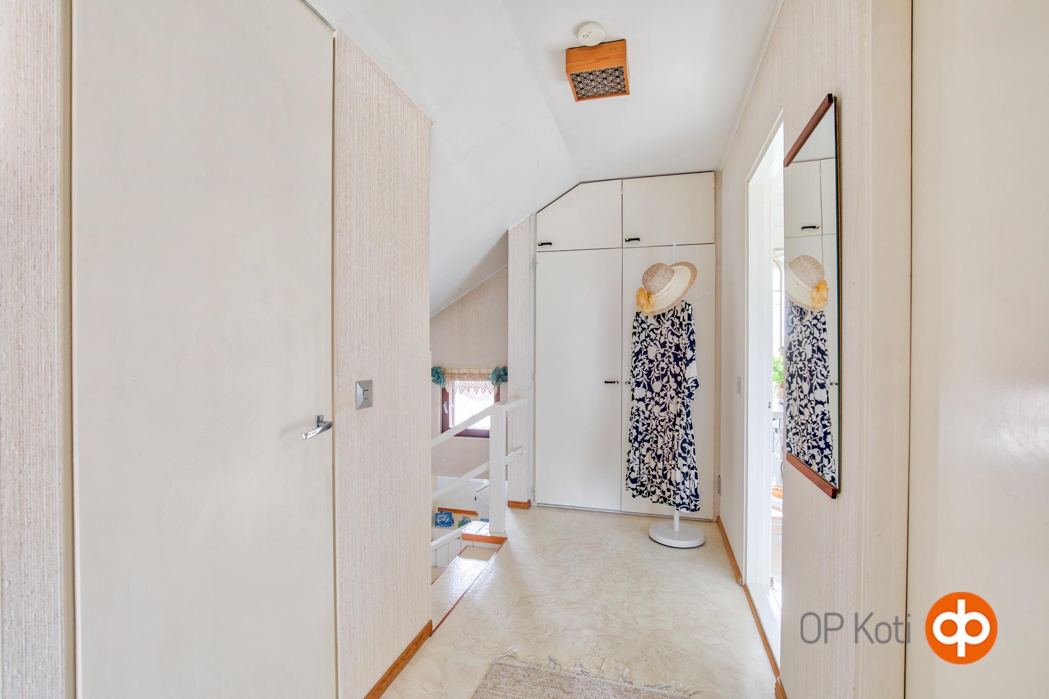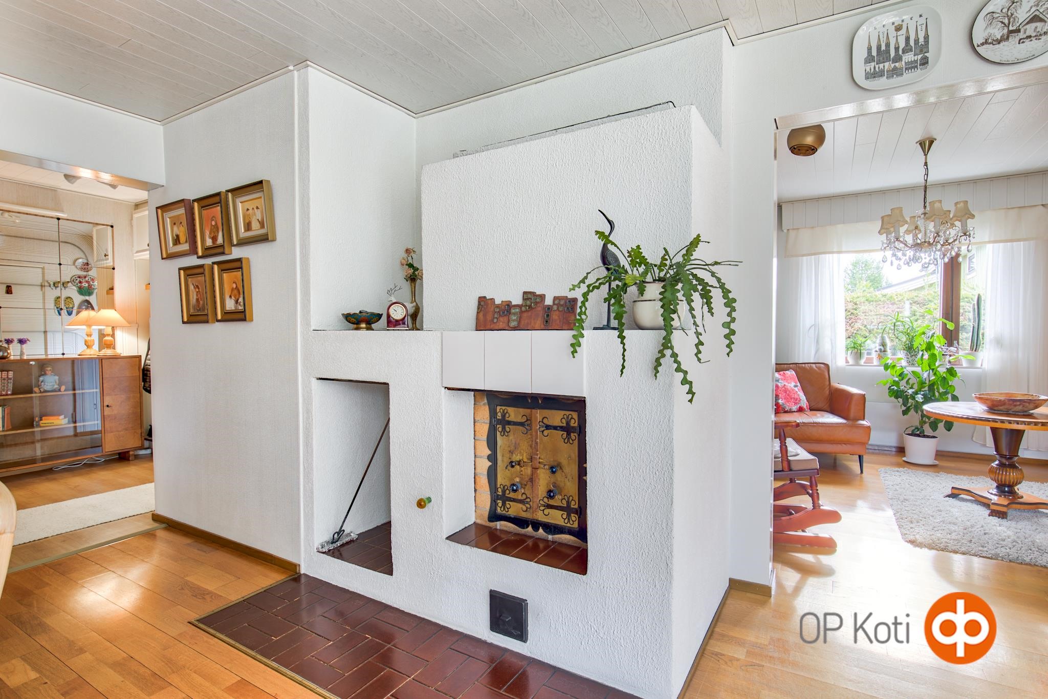 Talo on rakennettu kolmeen kerrokseen. Keskikerroksessa sijaitsee tilava ja käytännöllinen keittiö, jossa kaappitilaa on runsaasti. Samasta kerroksesta löytyvät myös valoisa olohuone ja ruokailutila, joiden tunnelmaa täydentää tyylikäs varaava takka. Yläkerrassa on kaksi makuuhuonetta sekä pesuhuone. Kellarikerroksessa sijaitsevat kodinhoitohuone pyykkihuoltoa varten, toinen pesuhuone sekä sauna.