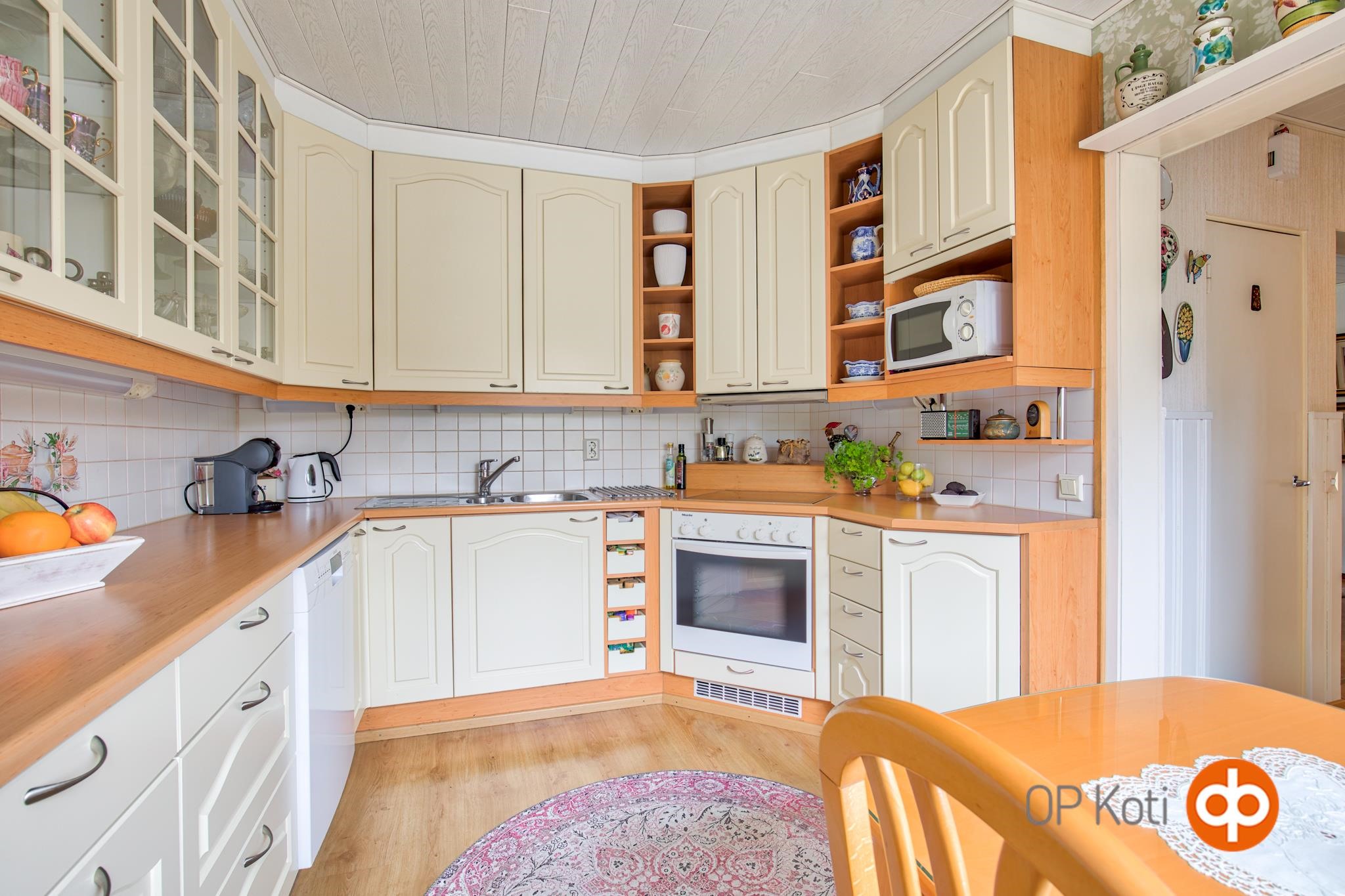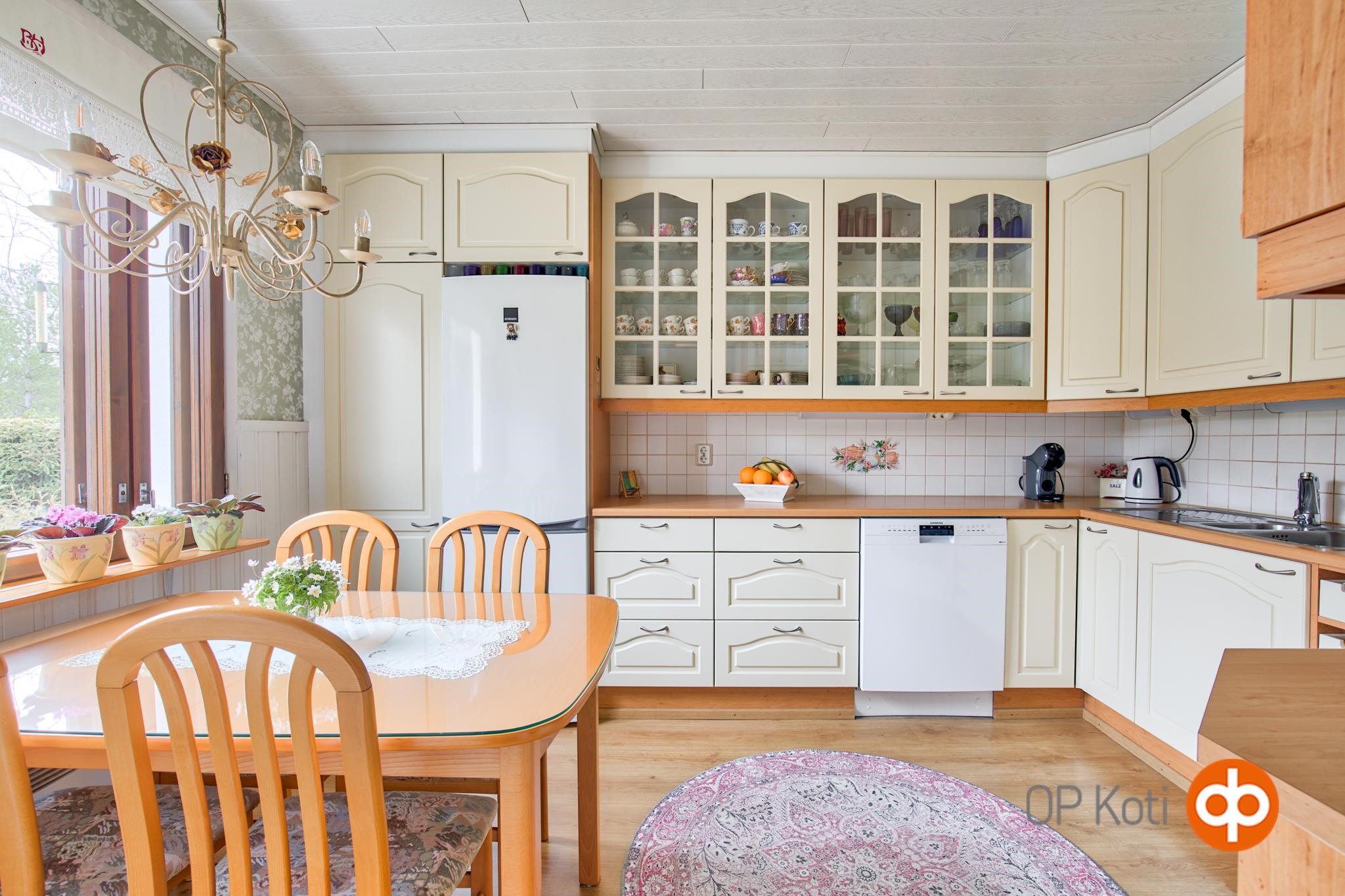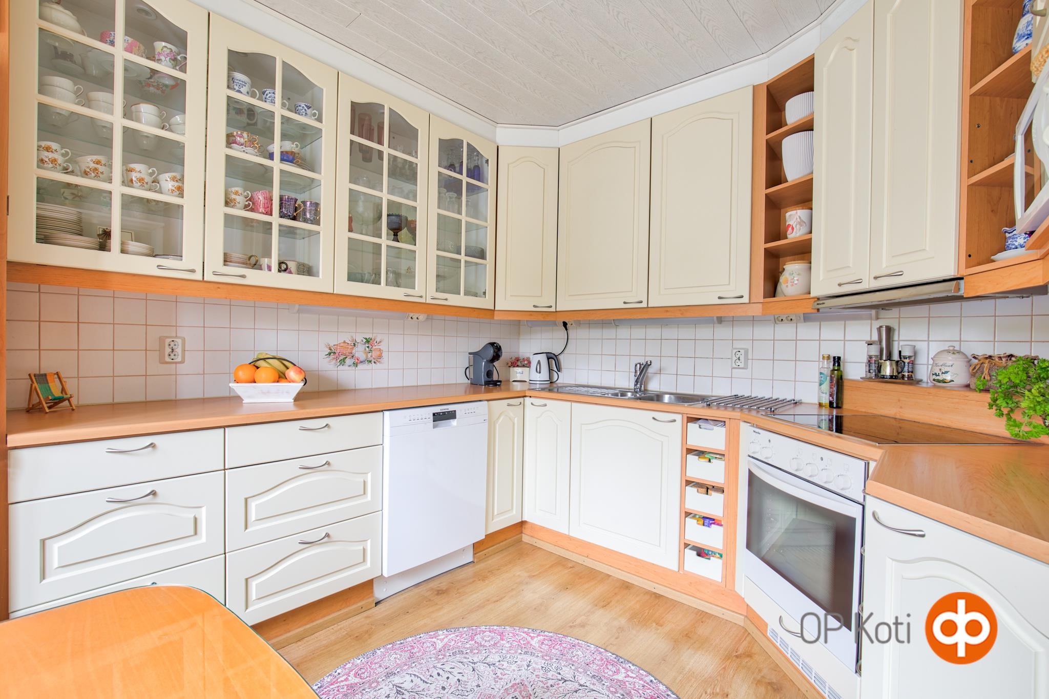 - Jääkaappipakastin, erillisuuni, liesitaso keraaminen, liesituuletin hormiin, astianpesukone, kaapistot, kiinteät valaisimet.