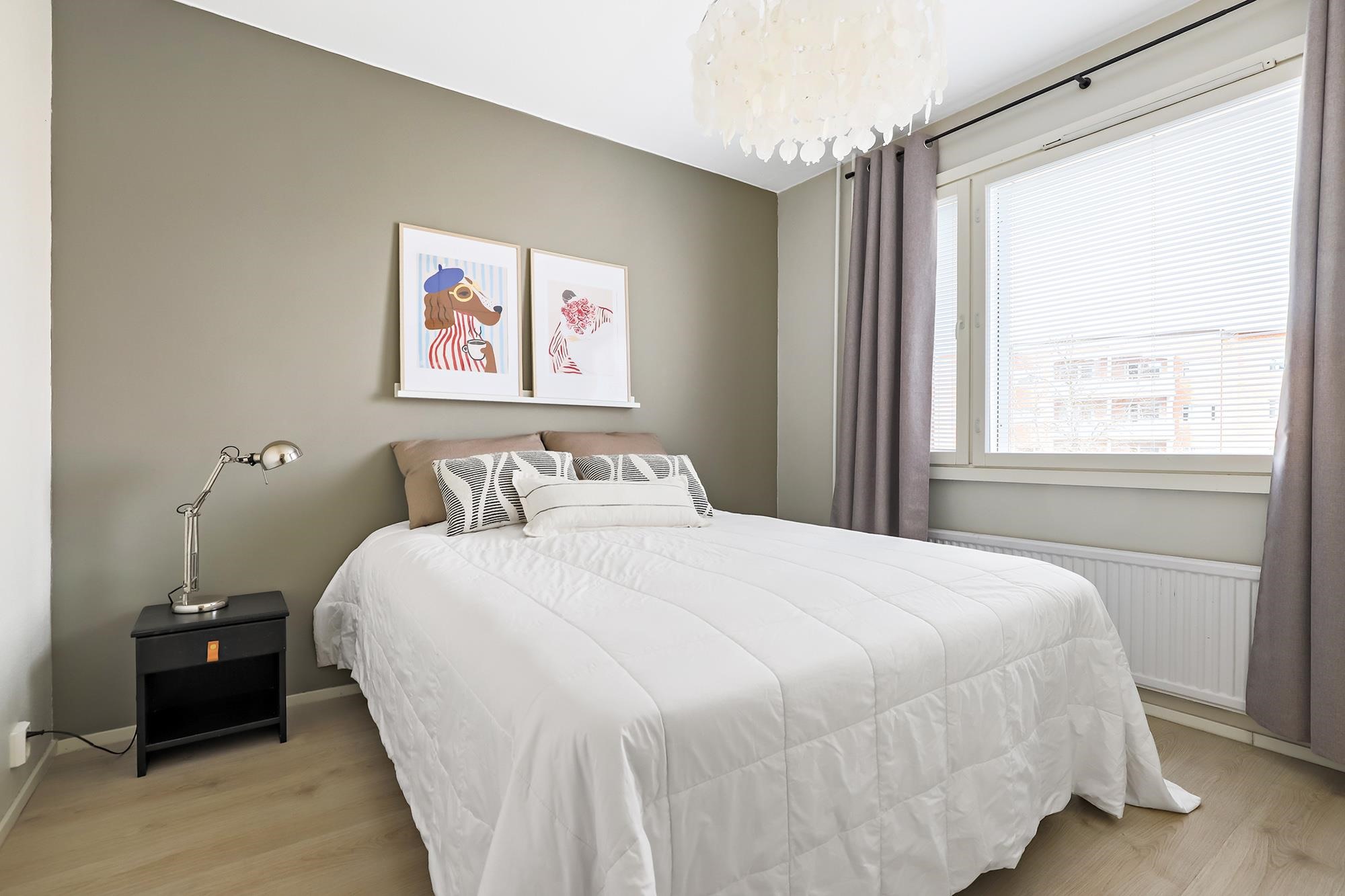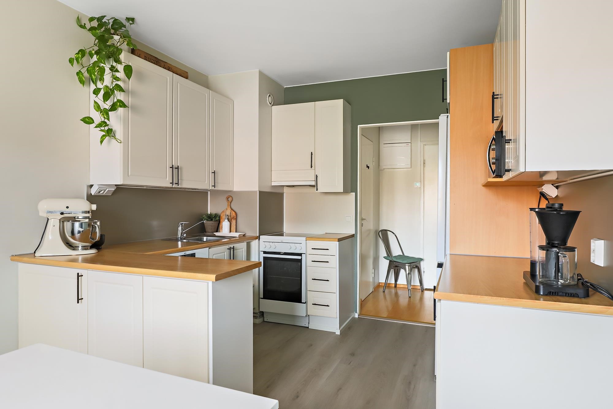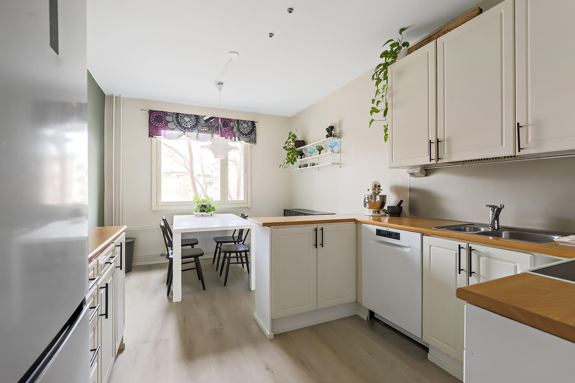 Asunnon sydämenä toimii kauniisti remontoitu keittiö, jossa saareke tuo sekä lisää työskentelytilaa että toimii luontevana kokoontumispaikkana. Ruokailutilaan mahtuu hyvin isompikin pöytä. Asunnon lattiaja seinäpinnat on uudistettu, ja kokonaisuutta täydentää hillitty ja ajaton värimaailma, joka miellyttää monia sisustustyylejä. Säilytystilaa löytyy runsaiden kaapistojen ansiosta.