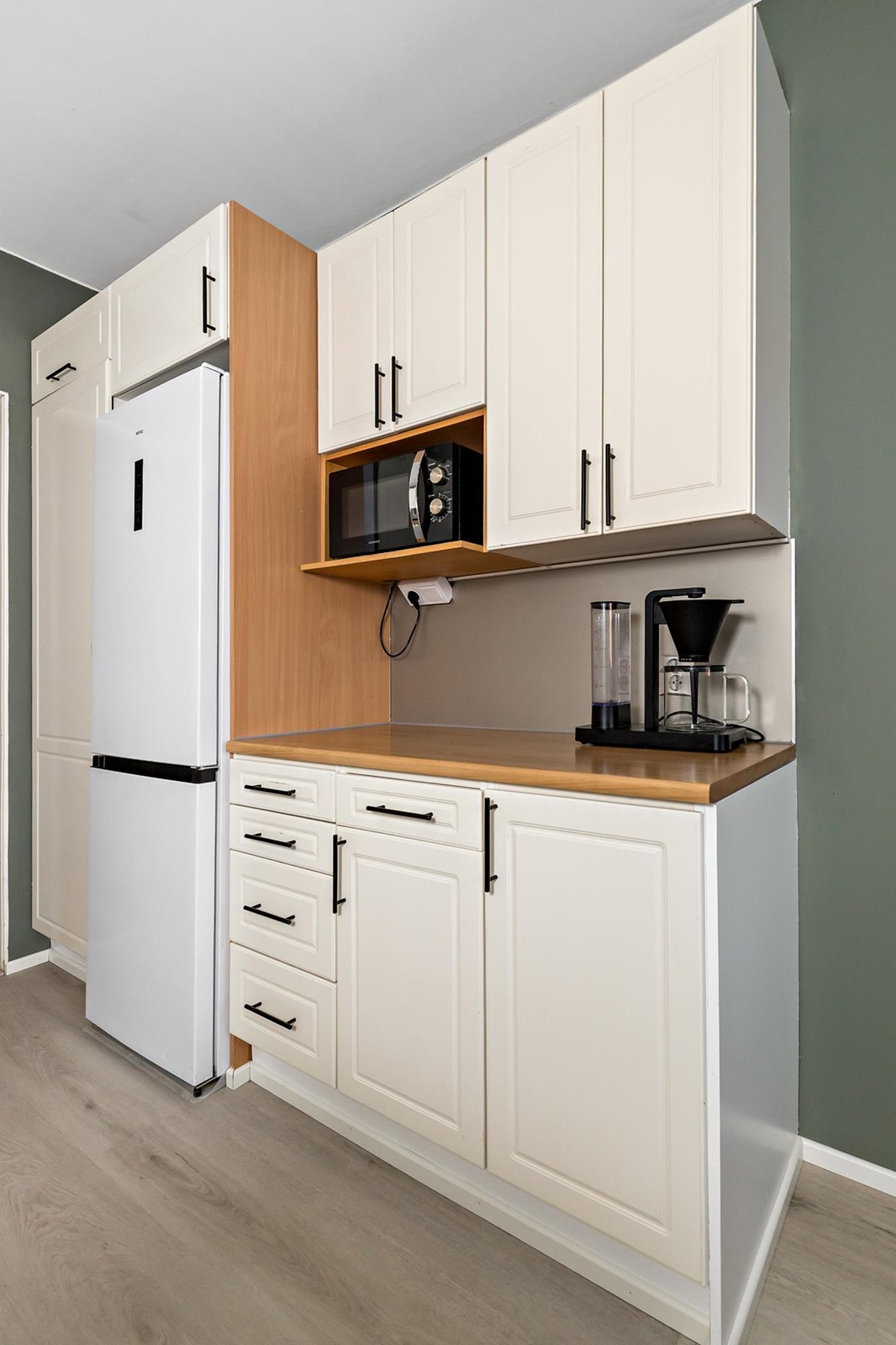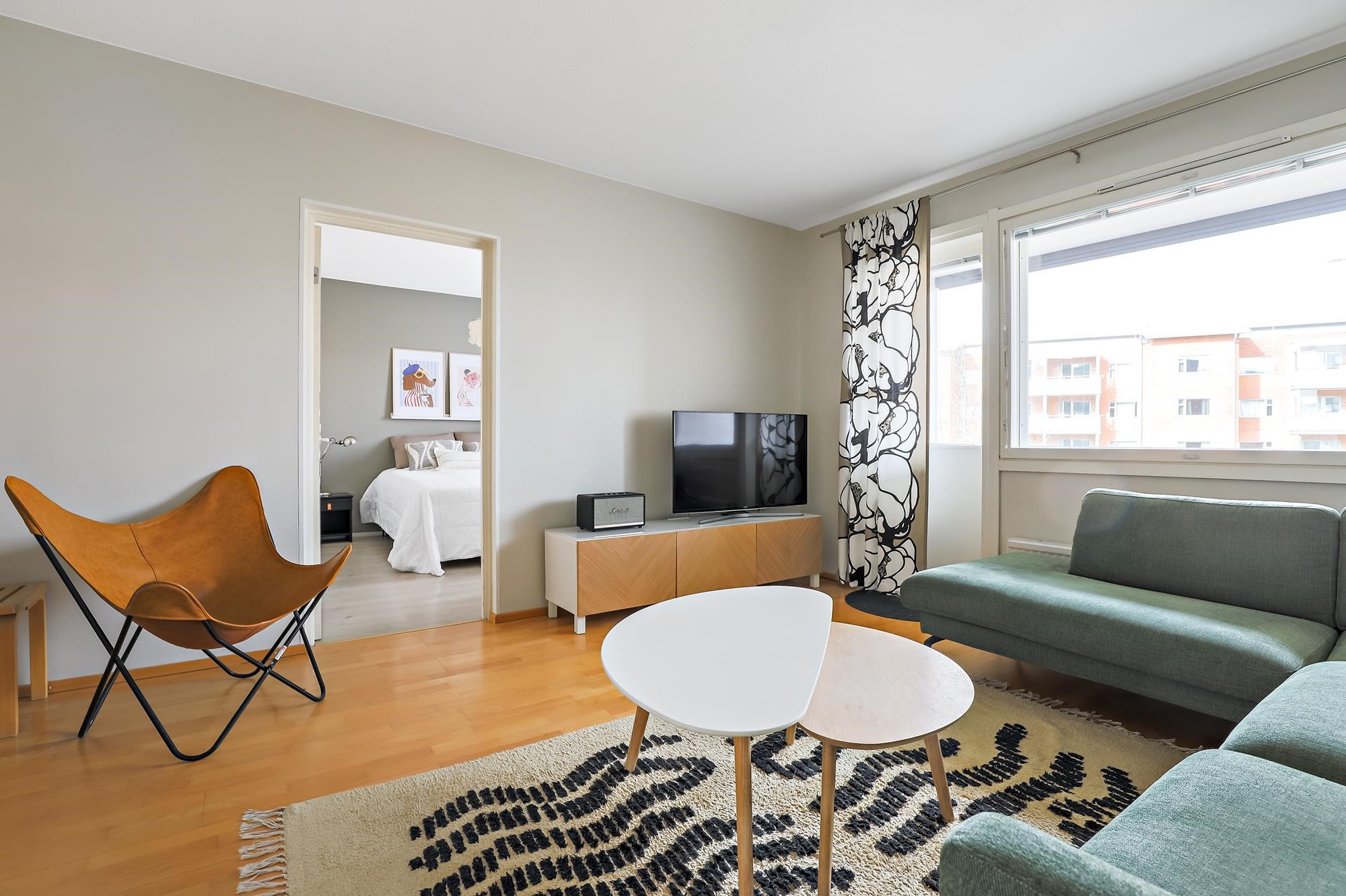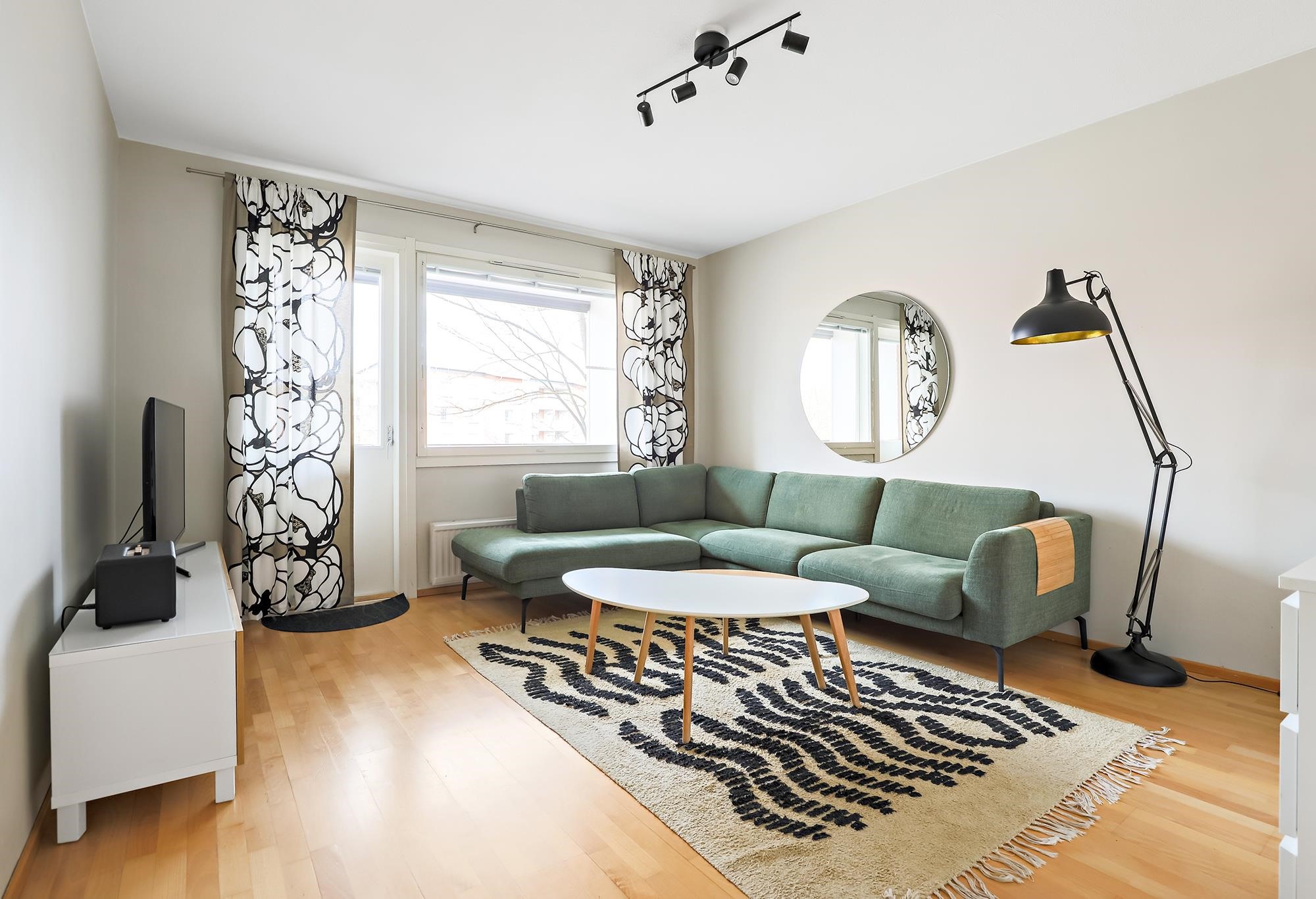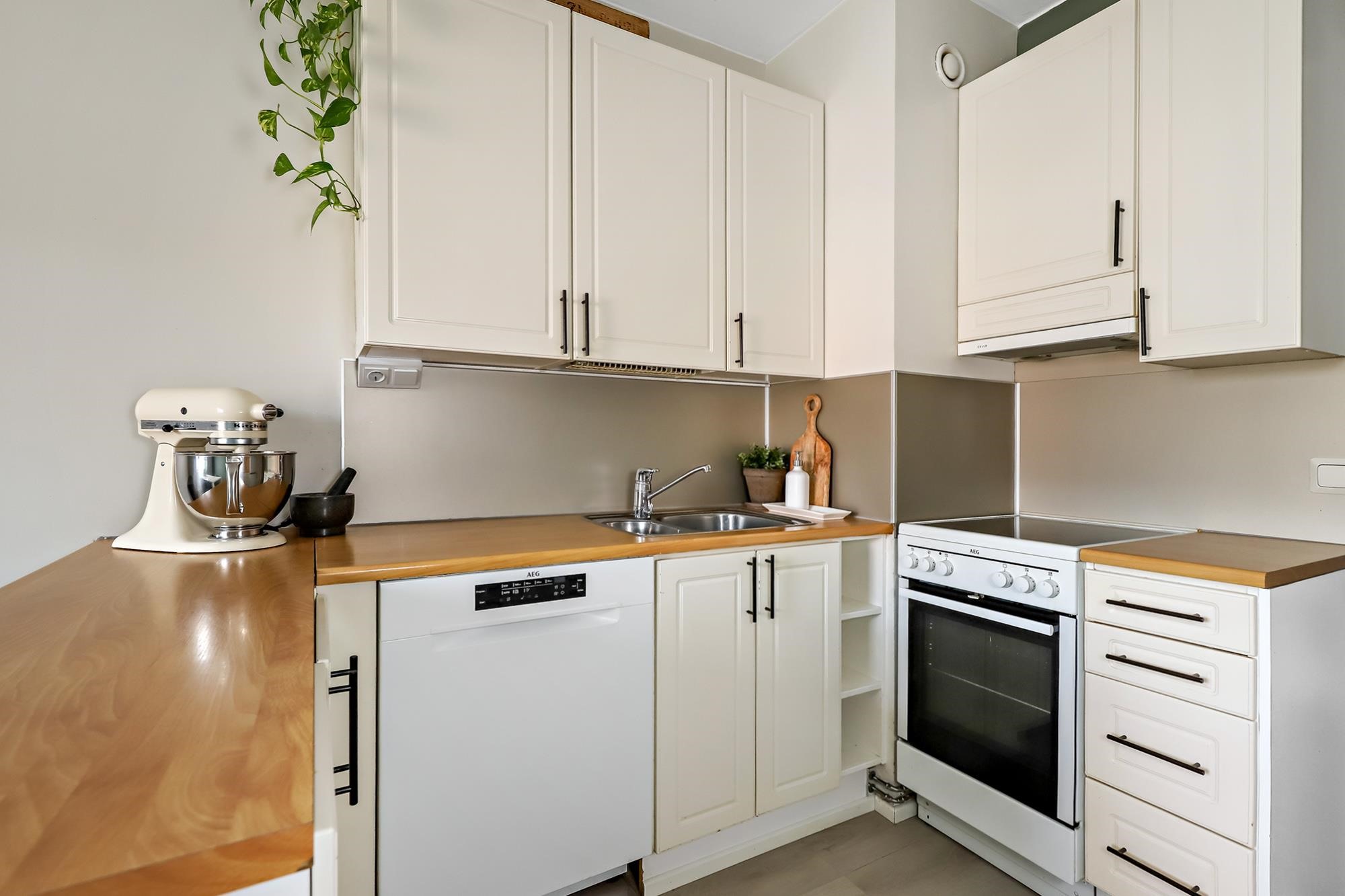 Asunnon sydämenä toimii kauniisti remontoitu keittiö, jossa saareke tuo sekä lisää työskentelytilaa että toimii luontevana kokoontumispaikkana. Ruokailutilaan mahtuu hyvin isompikin pöytä. Asunnon lattiaja seinäpinnat on uudistettu, ja kokonaisuutta täydentää hillitty ja ajaton värimaailma, joka miellyttää monia sisustustyylejä. Säilytystilaa löytyy runsaiden kaapistojen ansiosta.