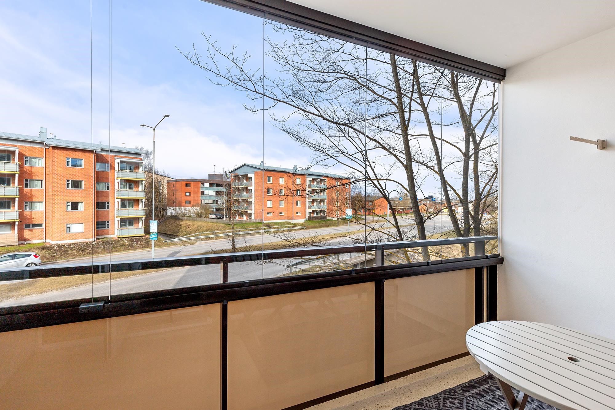 Tilava, lasitettu parveke toimii viihtyisänä lisähuoneena pitkälle syksyyn, ja sieltä avautuvat näkymät suoraan kauppakeskuksen suuntaan, palvelut ovat siis käytännössä käden ulottuvilla.
