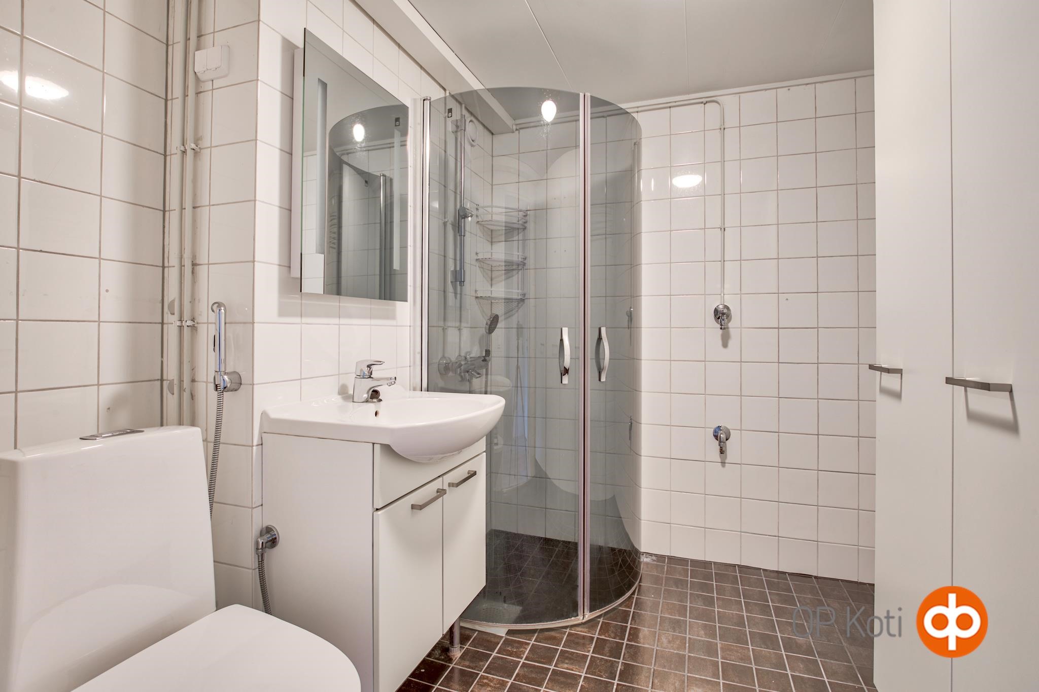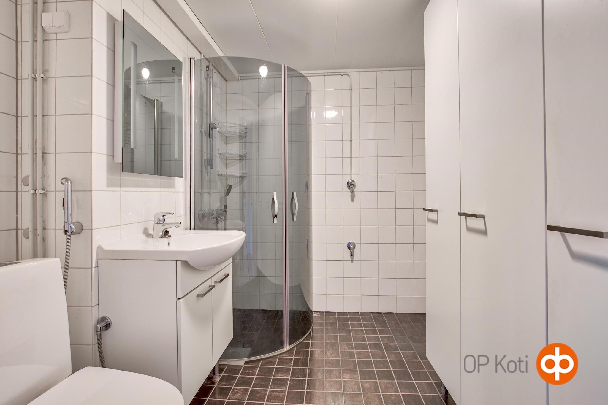 - Kylpyhuone, suihku, suihkukaappi, allaskaappi, pesukoneliitäntä, lattialämmitys, kiinteät valaisimet.