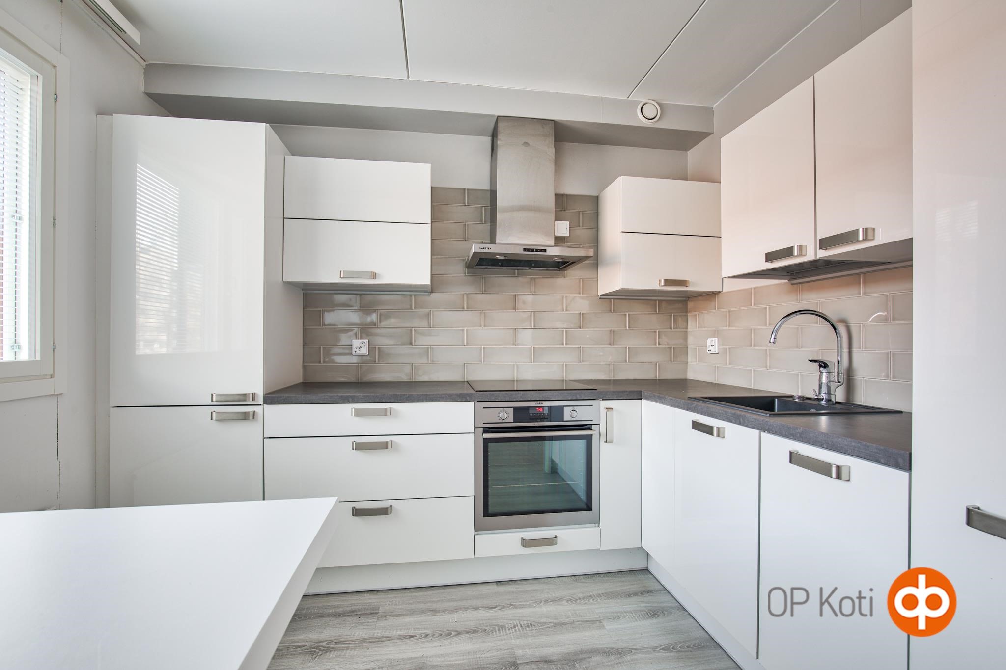 - Jääkaappipakastin integroitu, erillisuuni, induktioliesi, liesituuletin suodatin, astianpesukone integroitu, kaapistot, kiinteät valaisimet.