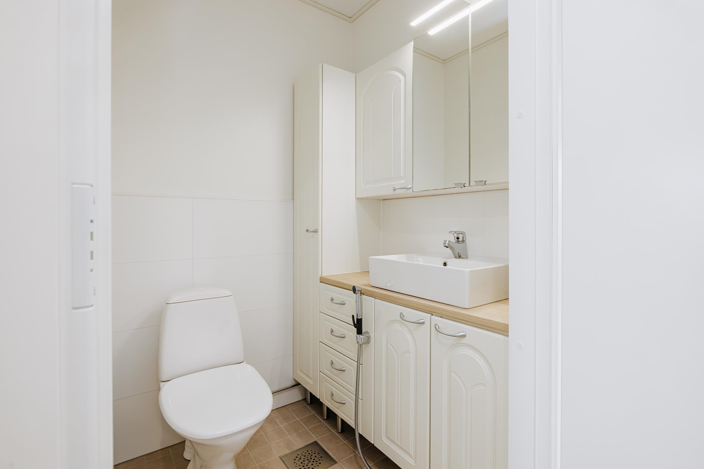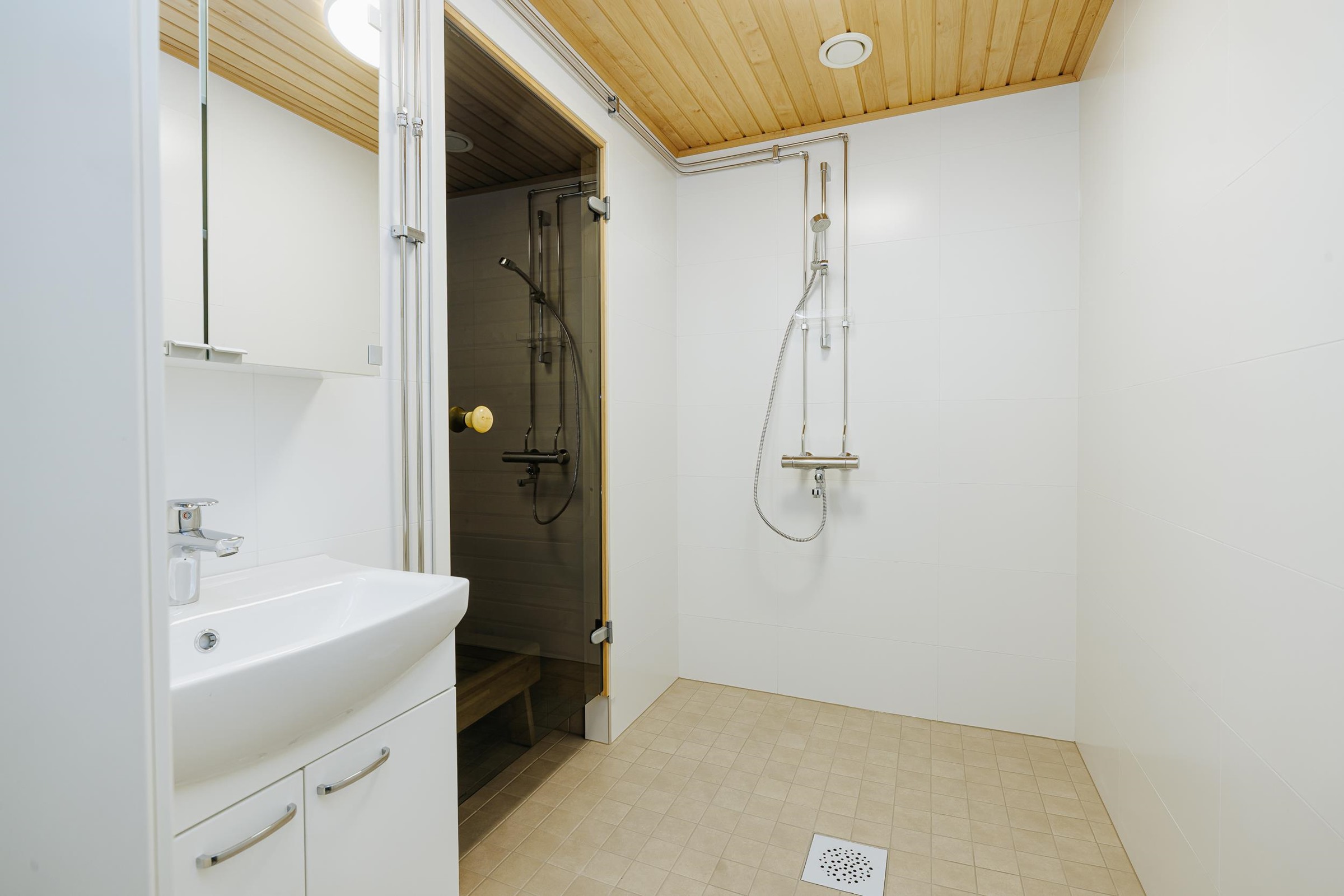 - Sauna, sähkökiuas, kylpyhuone, erillinen wc, suihku, lattialämmitys, kiinteät valaisimet.