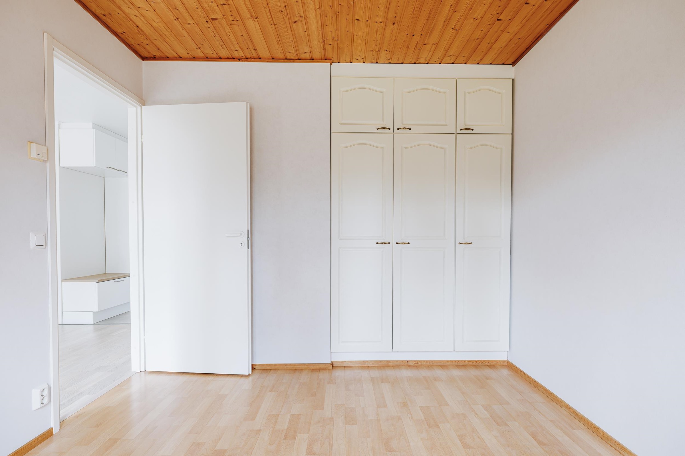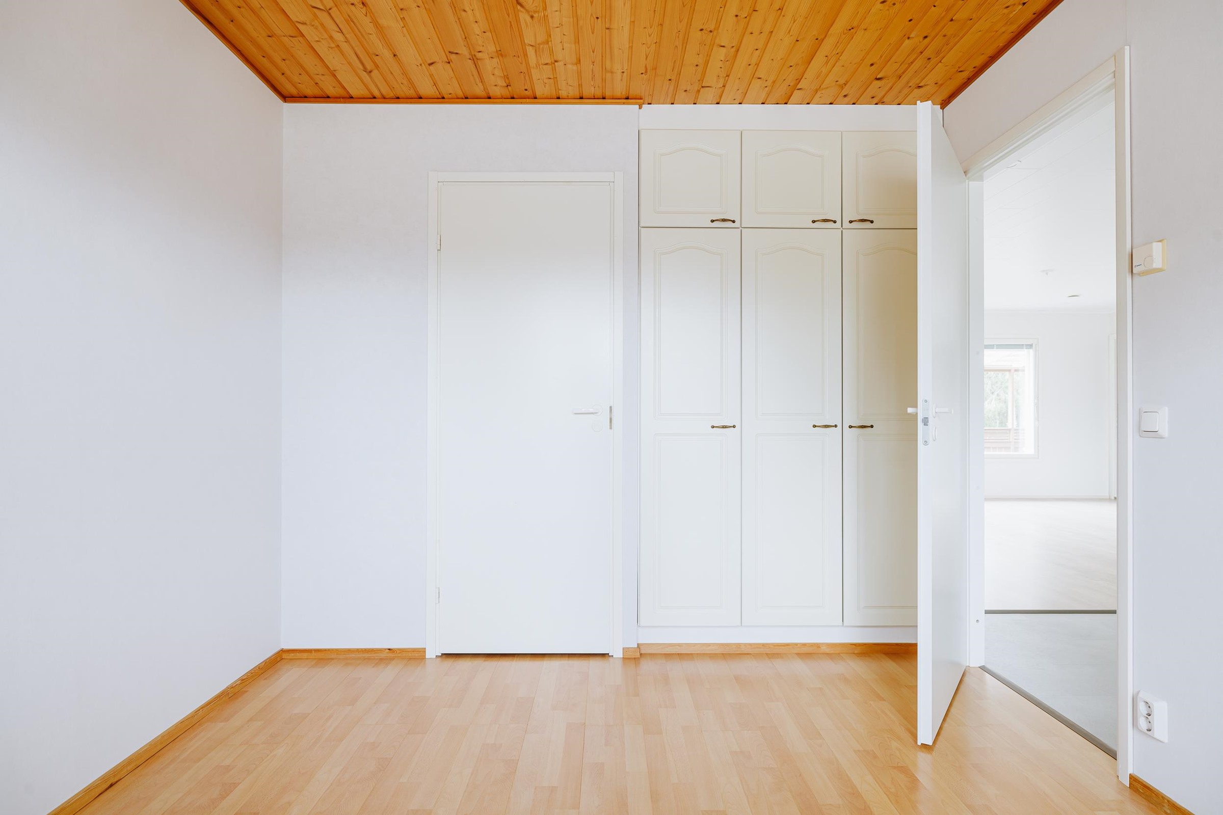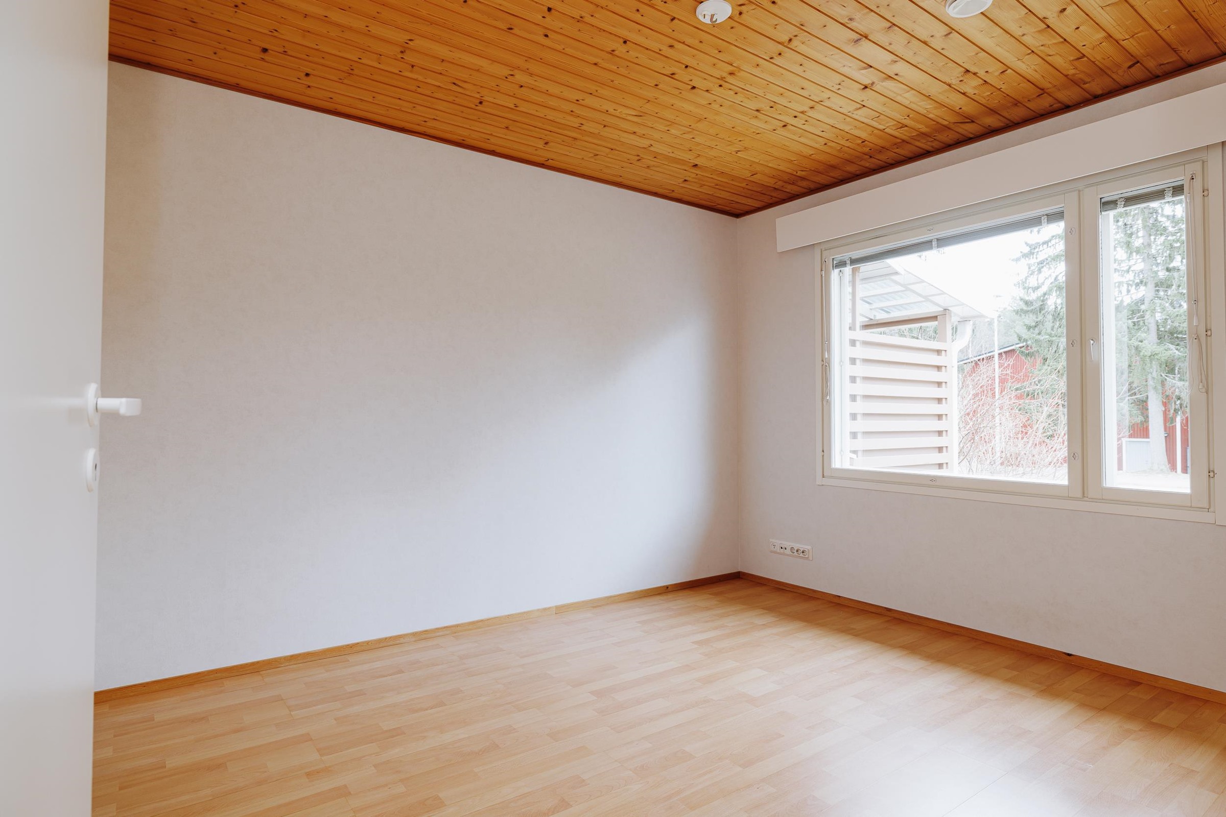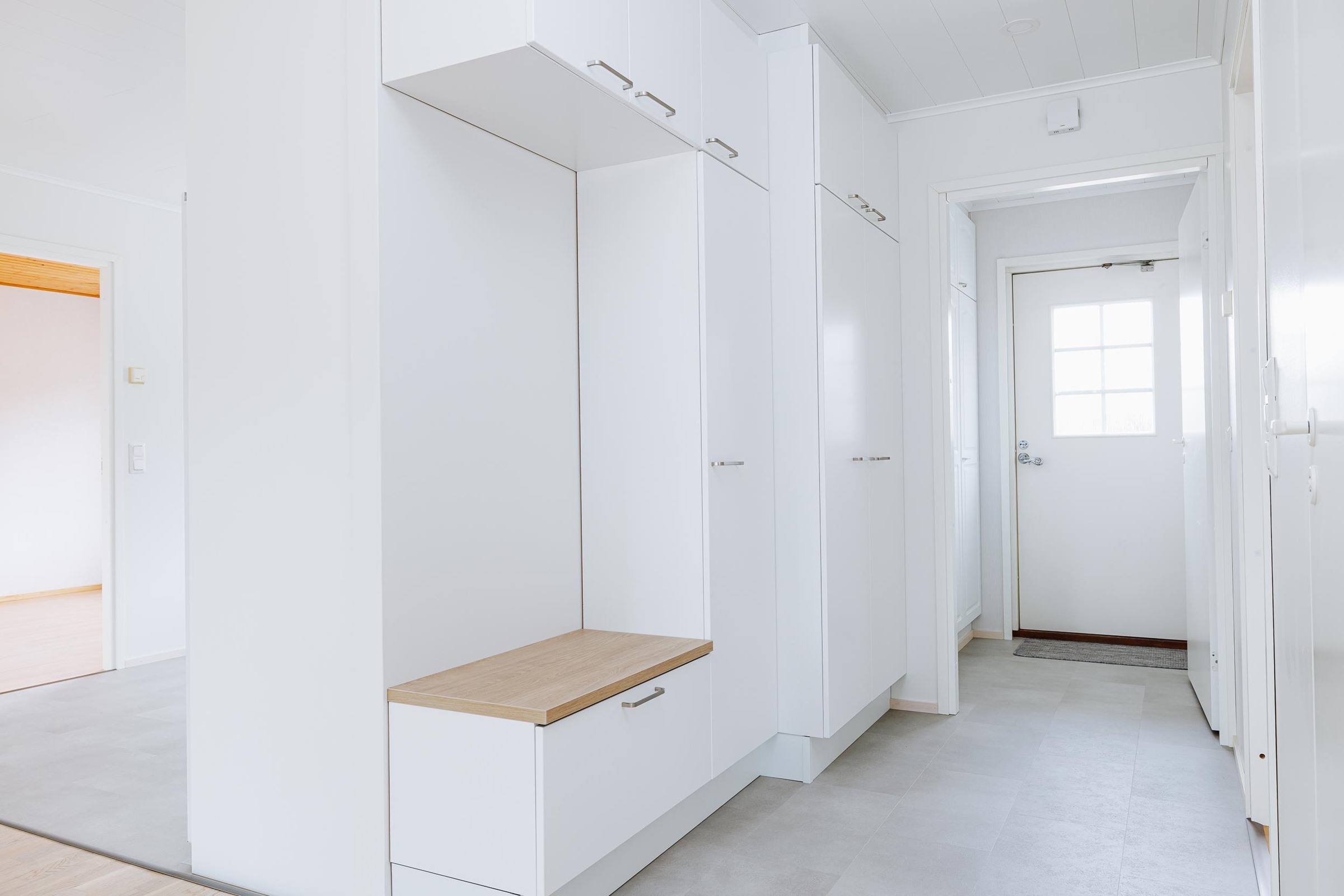 Keittiö: vinyyli/maali. Olohuone: tammiparketti/maali. Makuuhuone 1: laminaatti/tapetti. Makuuhuone 2: laminaatti/tapetti. Makuuhuone 3: laminaatti/tapetti. Kodinhoitohuone: laatta/maali. Sauna: laatta/paneeli. Kylpyhuone: laatta/laatta. Eteinen: vinyyli/tapeetti. Wc: laatta/maali/laatta. Vaatehuone: laminaatti/tapetti.