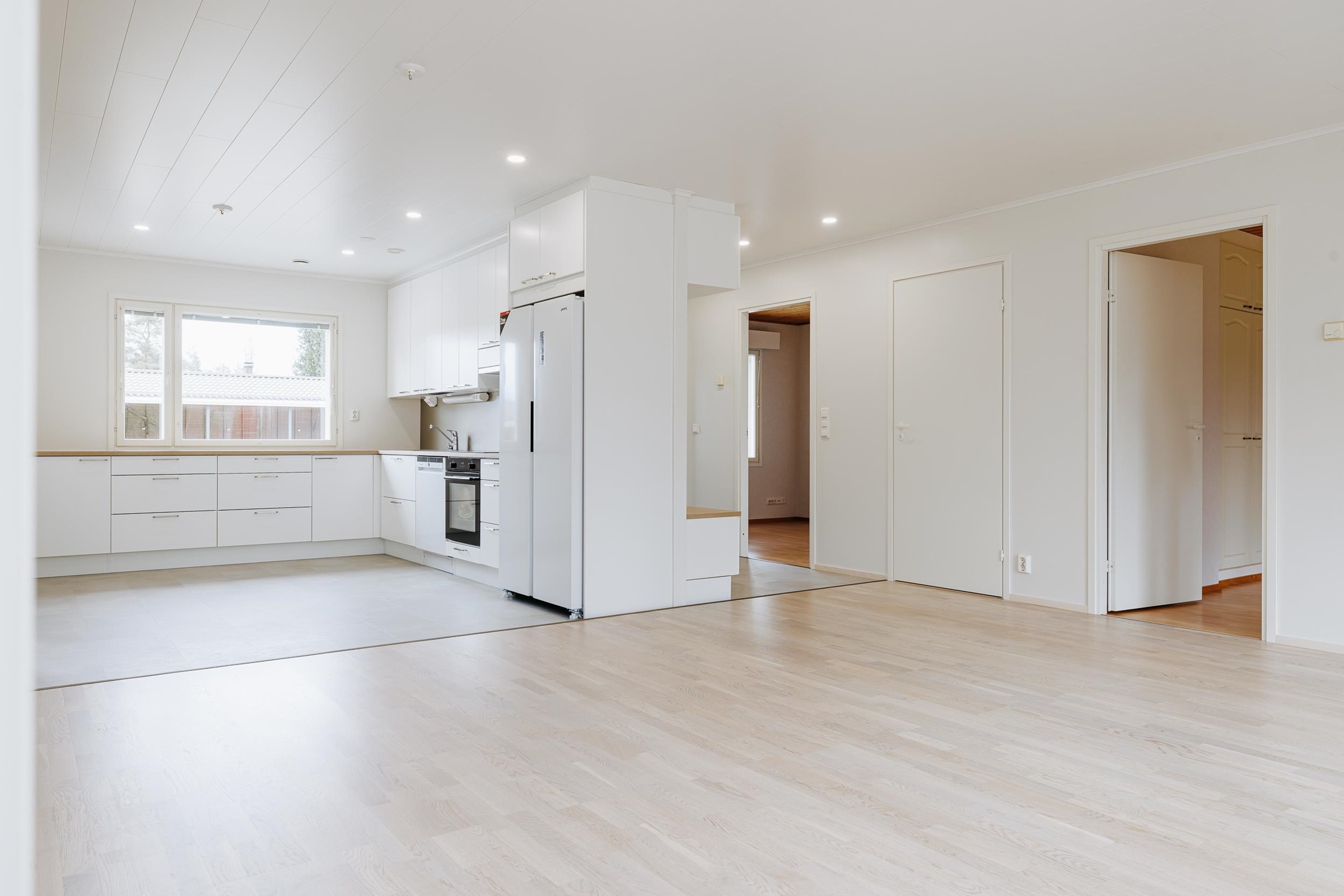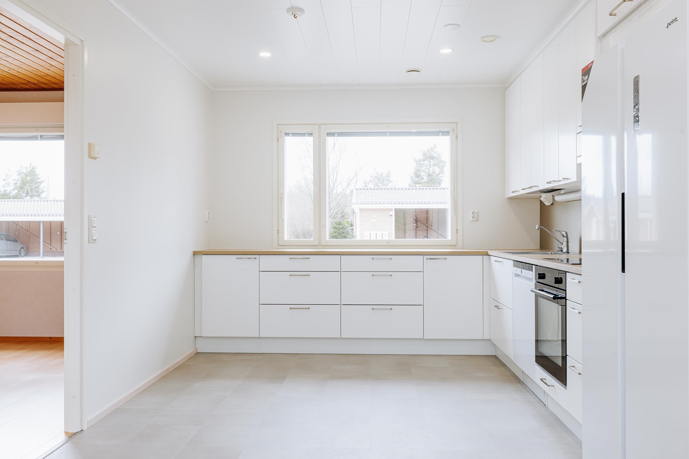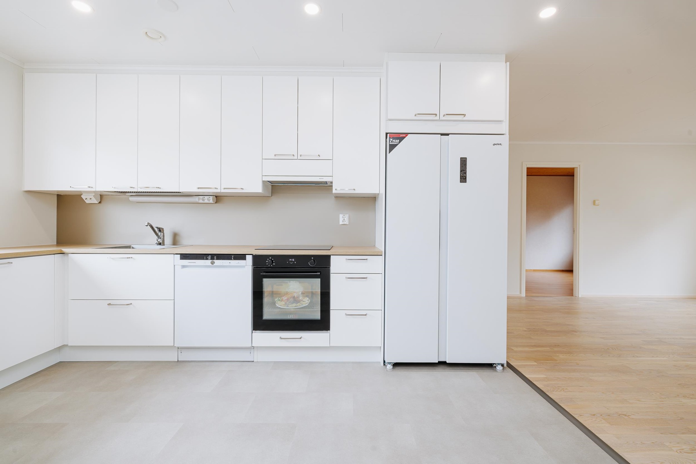 - Jääkaappipakastin, erillisuuni, induktioliesi, liesituuletin, astianpesukone, kaapistot, kiinteät valaisimet.
