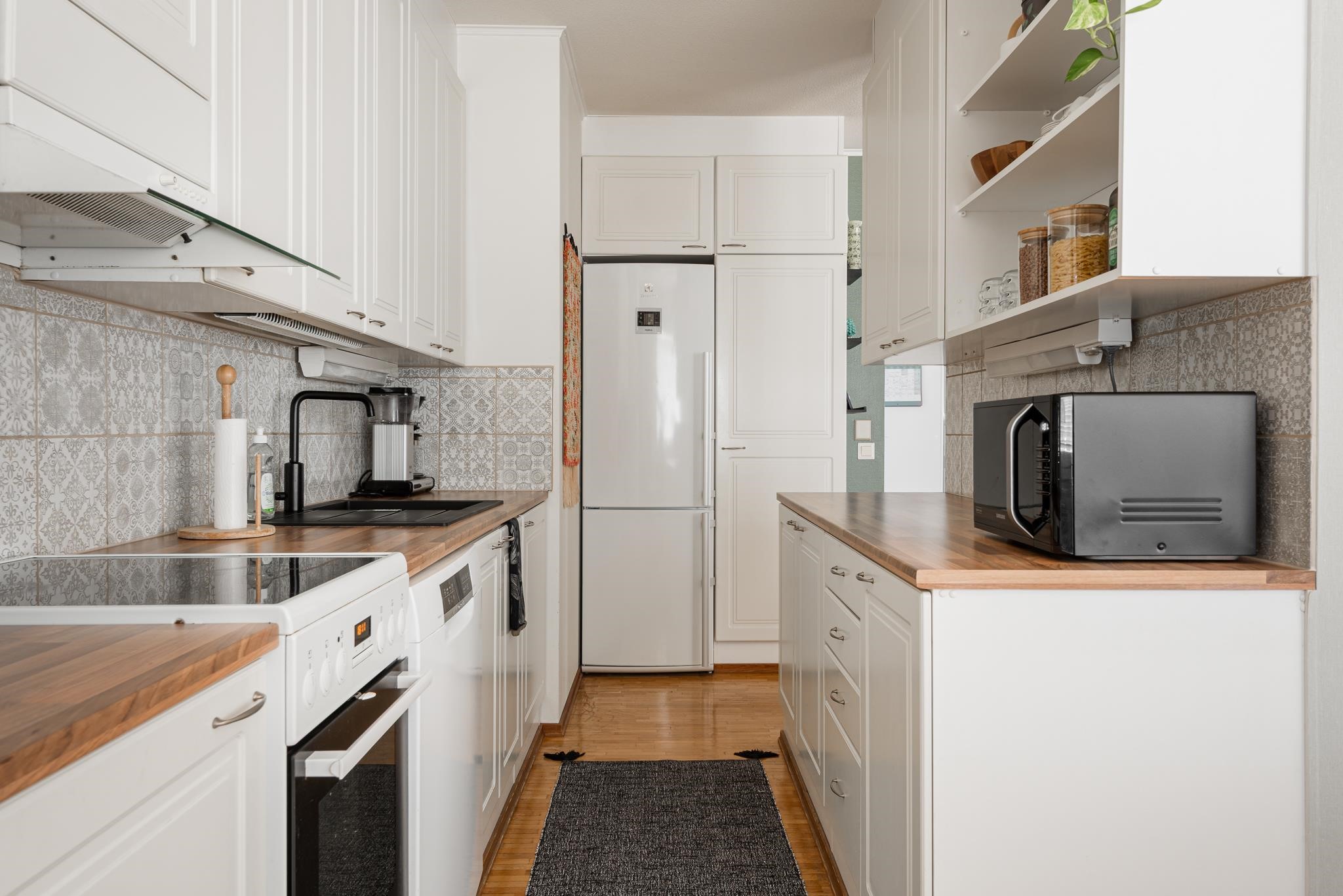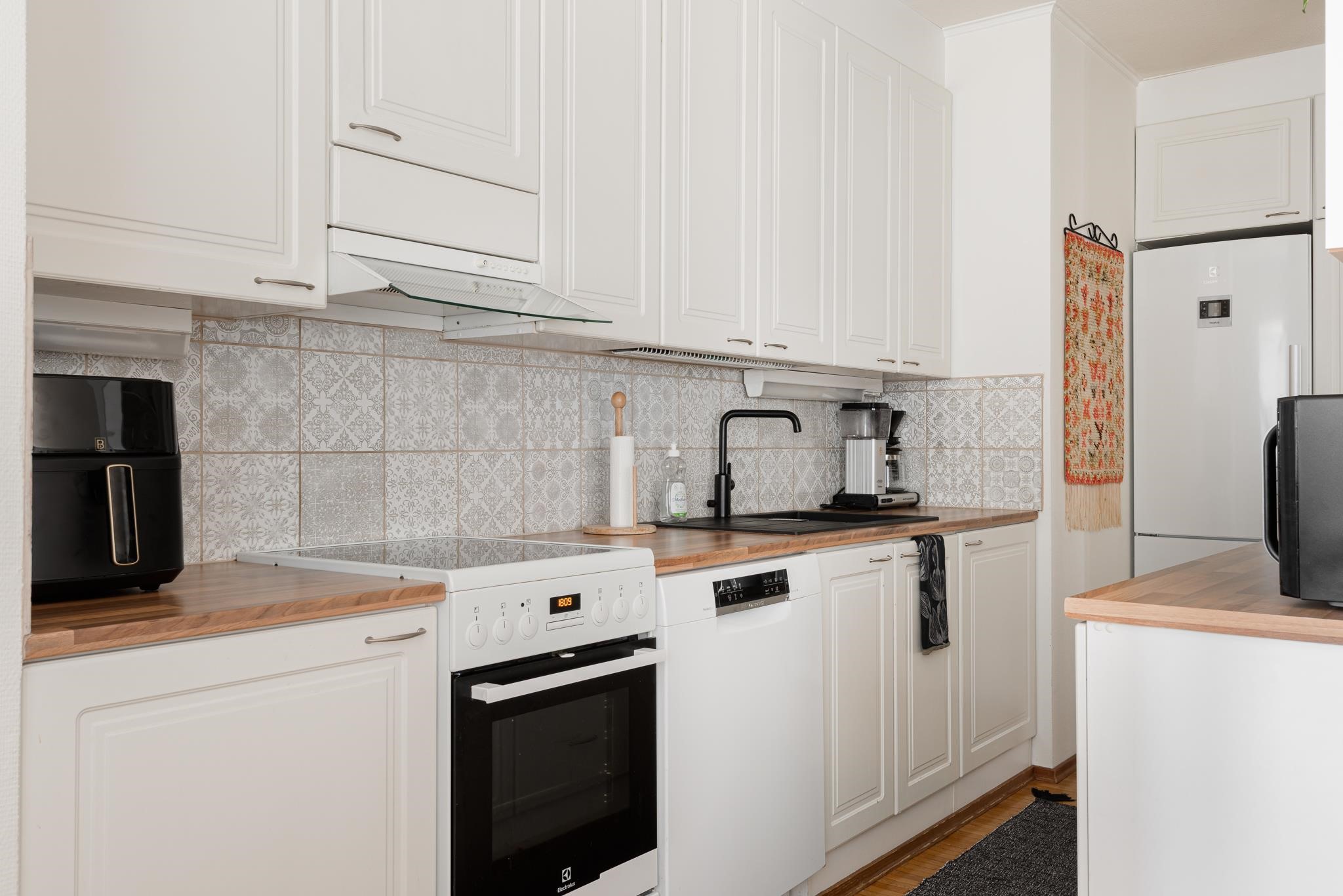 - Jääkaappipakastin, induktioliesi, liesikupu, astianpesukone, kiinteät valaisimet.