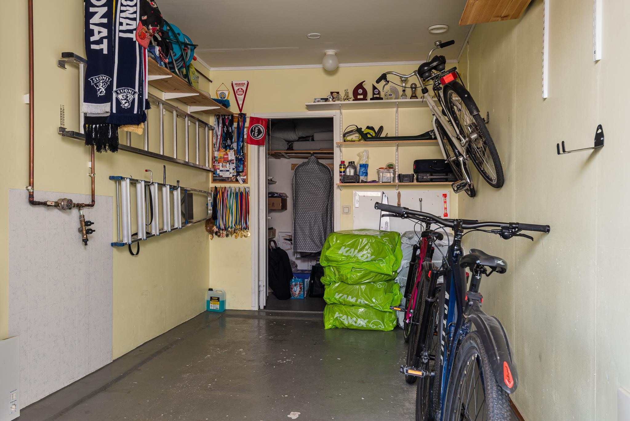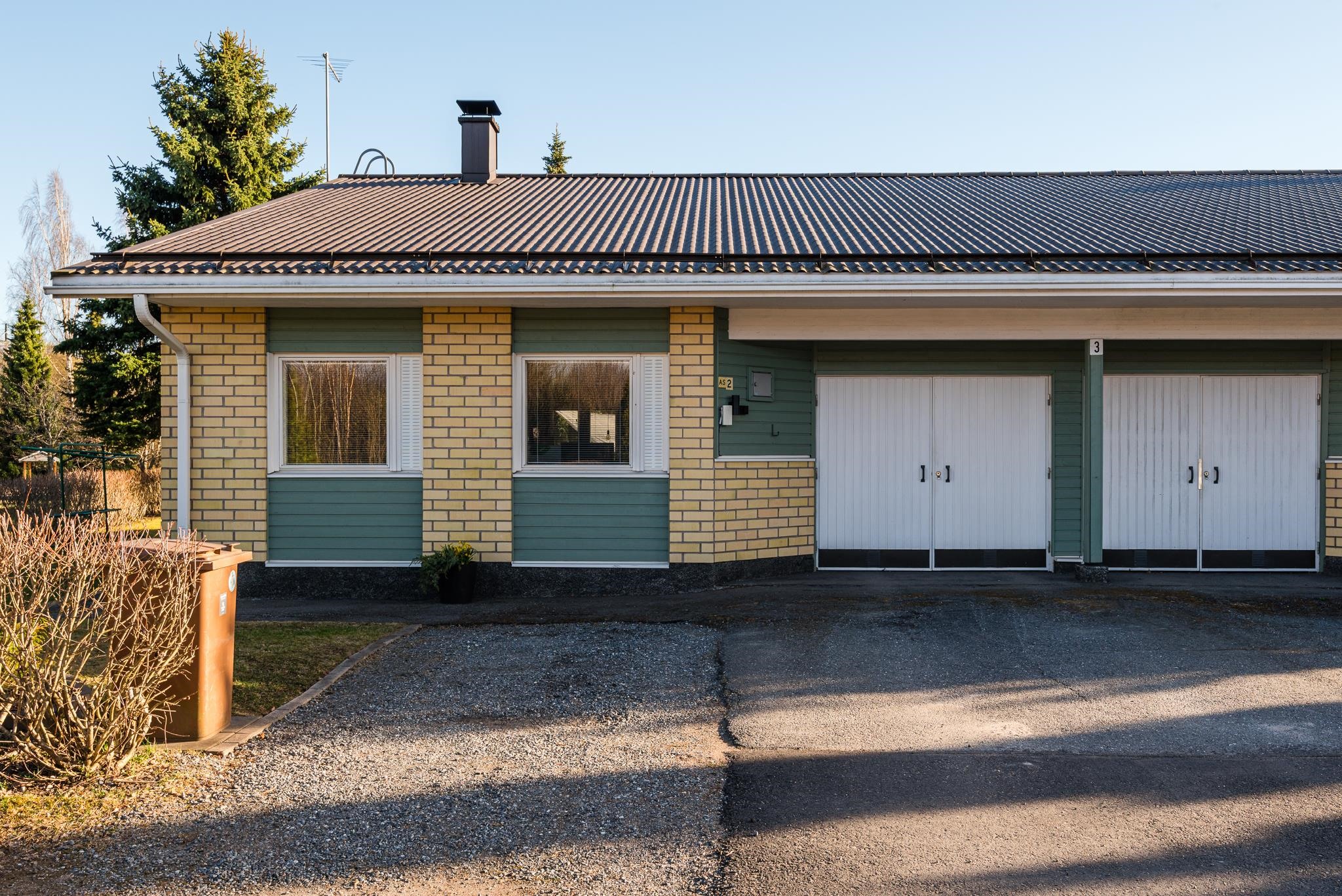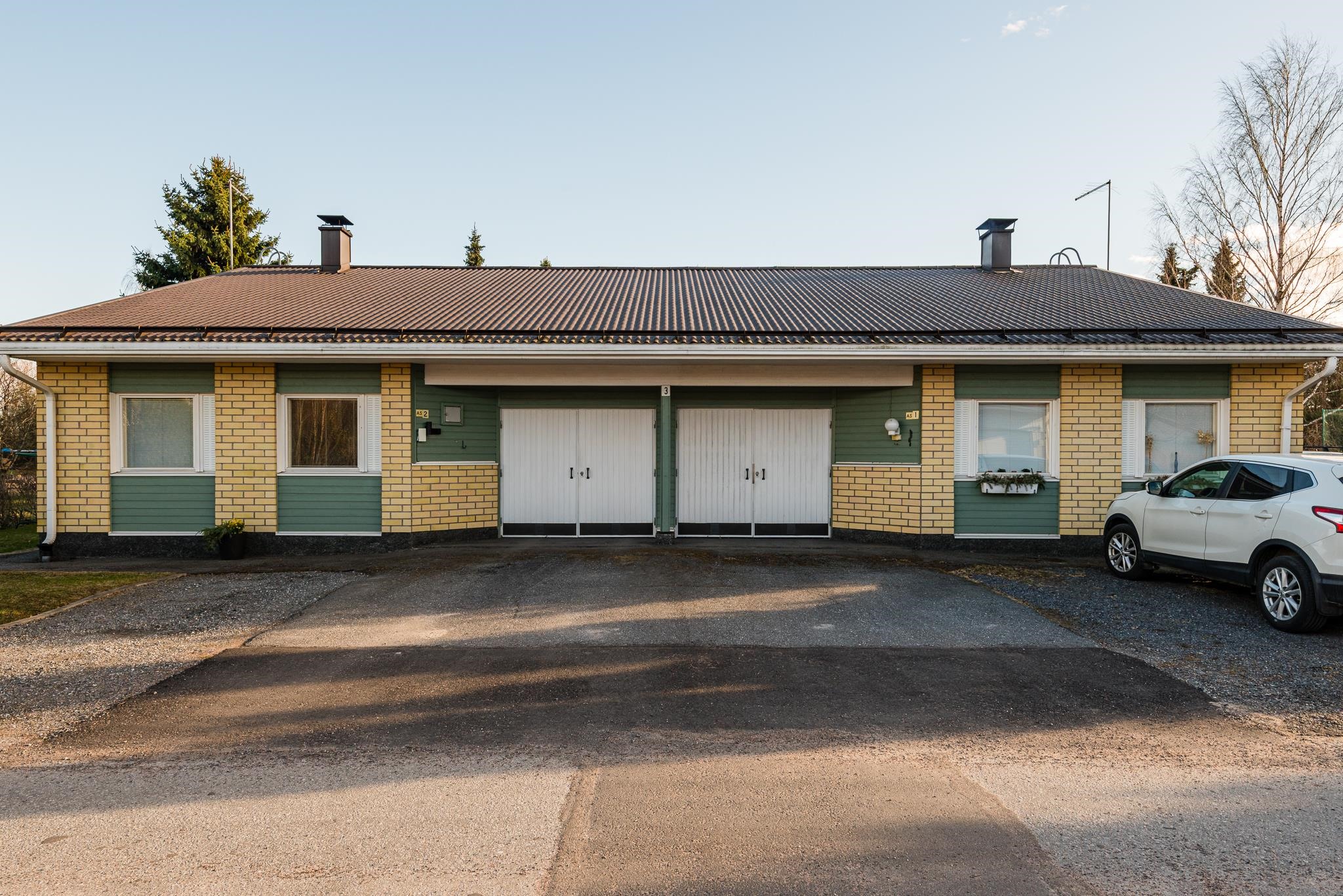 Asunnon yhteydessä on oma autotalli ja varasto, jotka tuovat käytännöllistä säilytys- ja harrastetilaa.