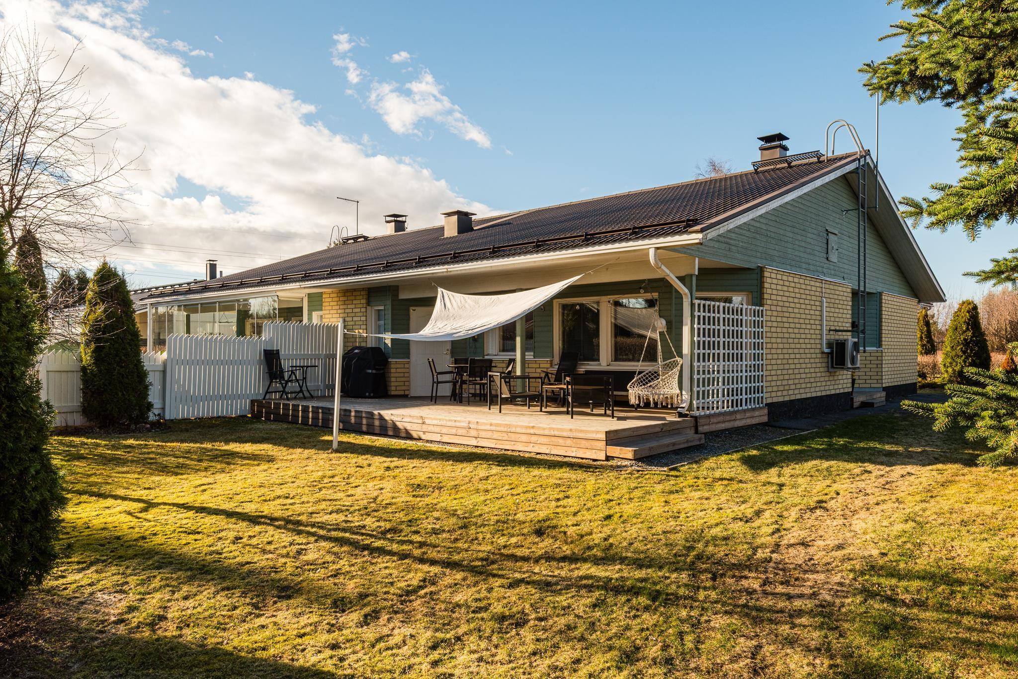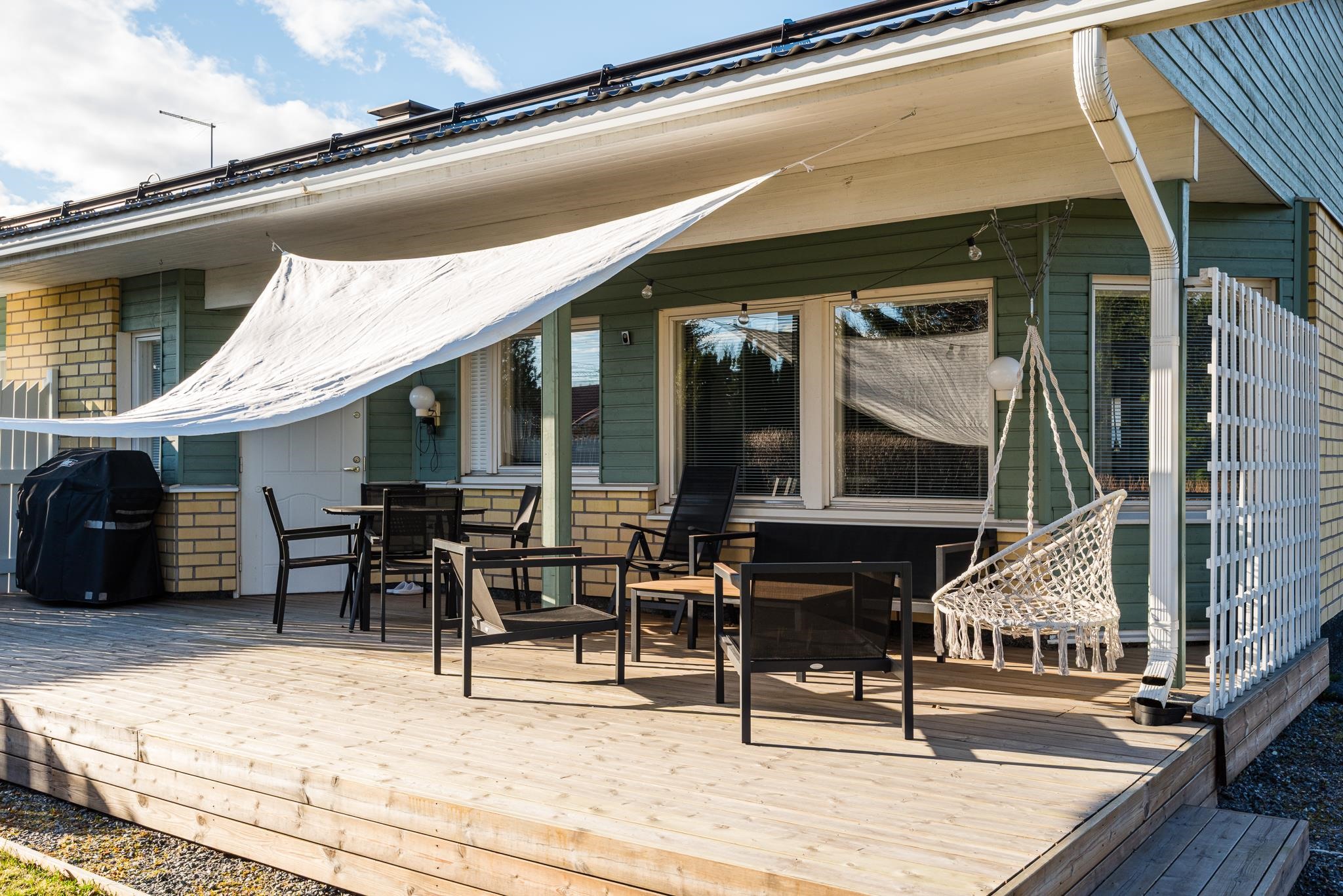 Aurinkoinen terassi ja puistoon rajoittuva piha tarjoaa loistavat puitteet kesäpäivistä nauttimiseen, ja helppohoitoinen piha tekee asumisesta vaivatonta.