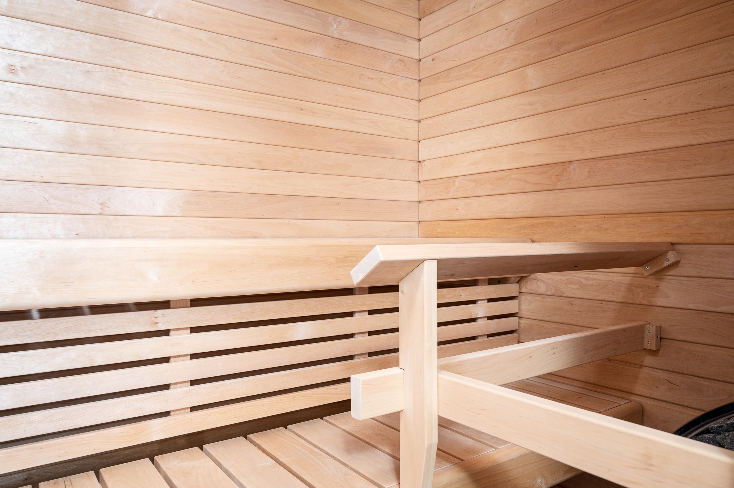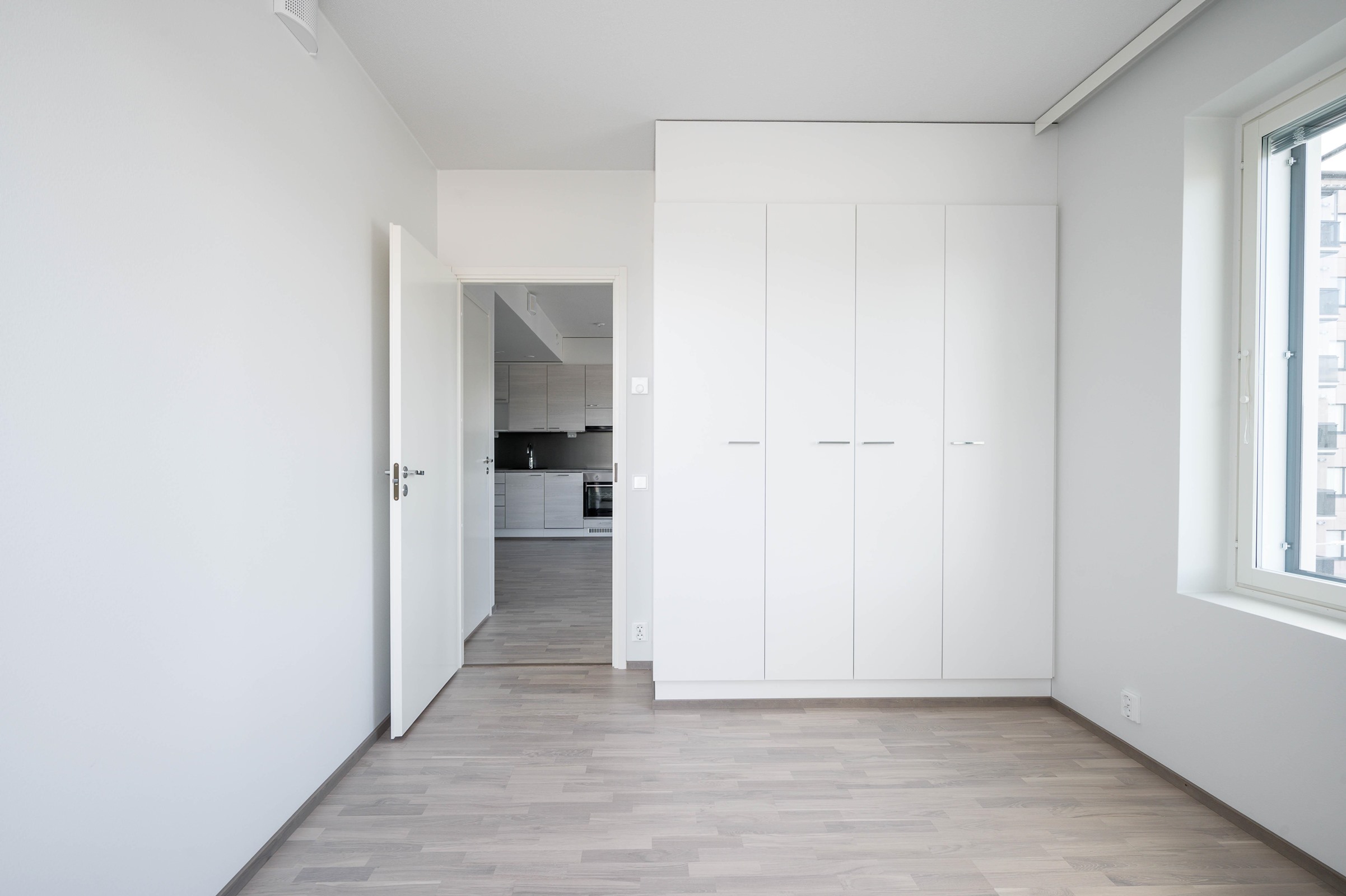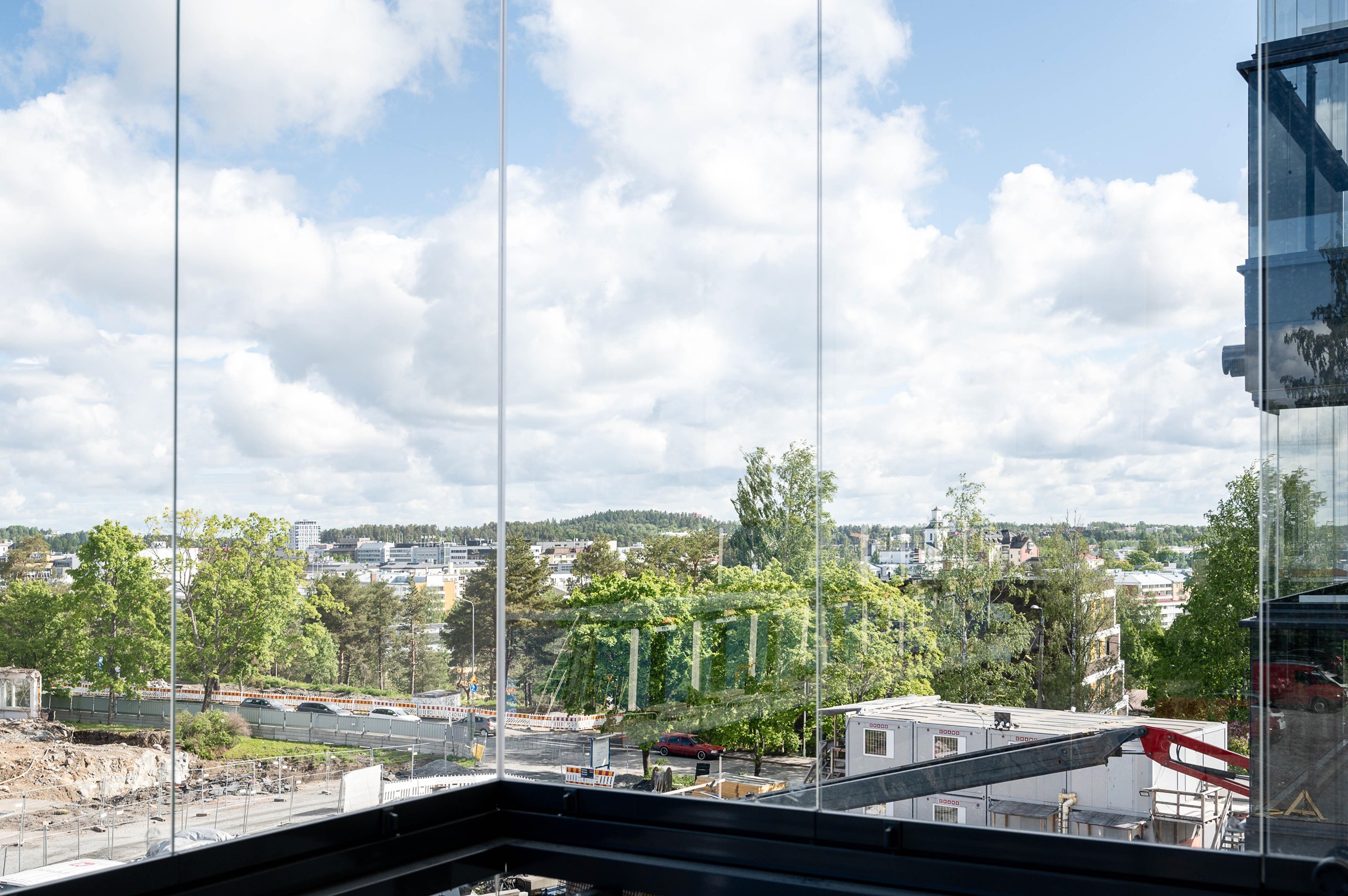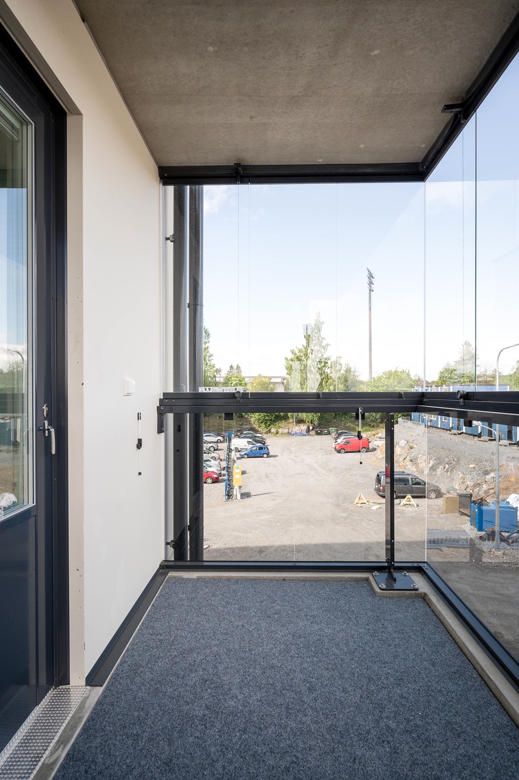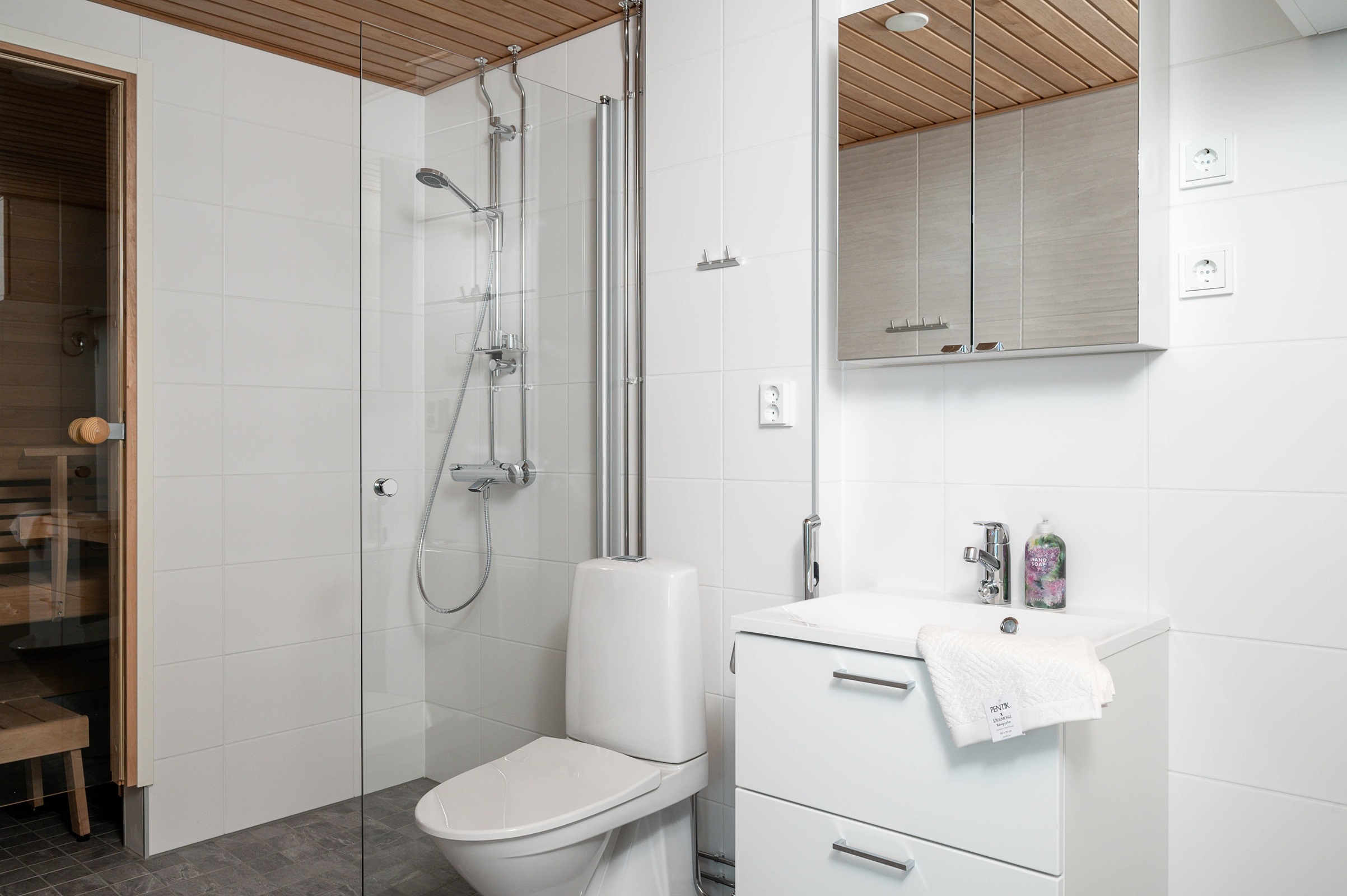 Saunallinen kulmahuoneisto, jonka makuuhuoneesta on käynti lasitetulle parvekkeelle.