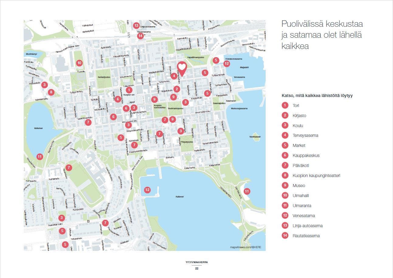 Huippusijainti takaa, että kaikki palvelut, harrastuspaikat, kahvilat, kulttuurielämykset, koulut ja terveyspalvelut ovat aivan vieressä. Kuopion kuuluisa tori ja kauppahalli ovat hetkessä saavutettavissa, ja Kallaveden rannalle kävelet viidessä minuutissa.