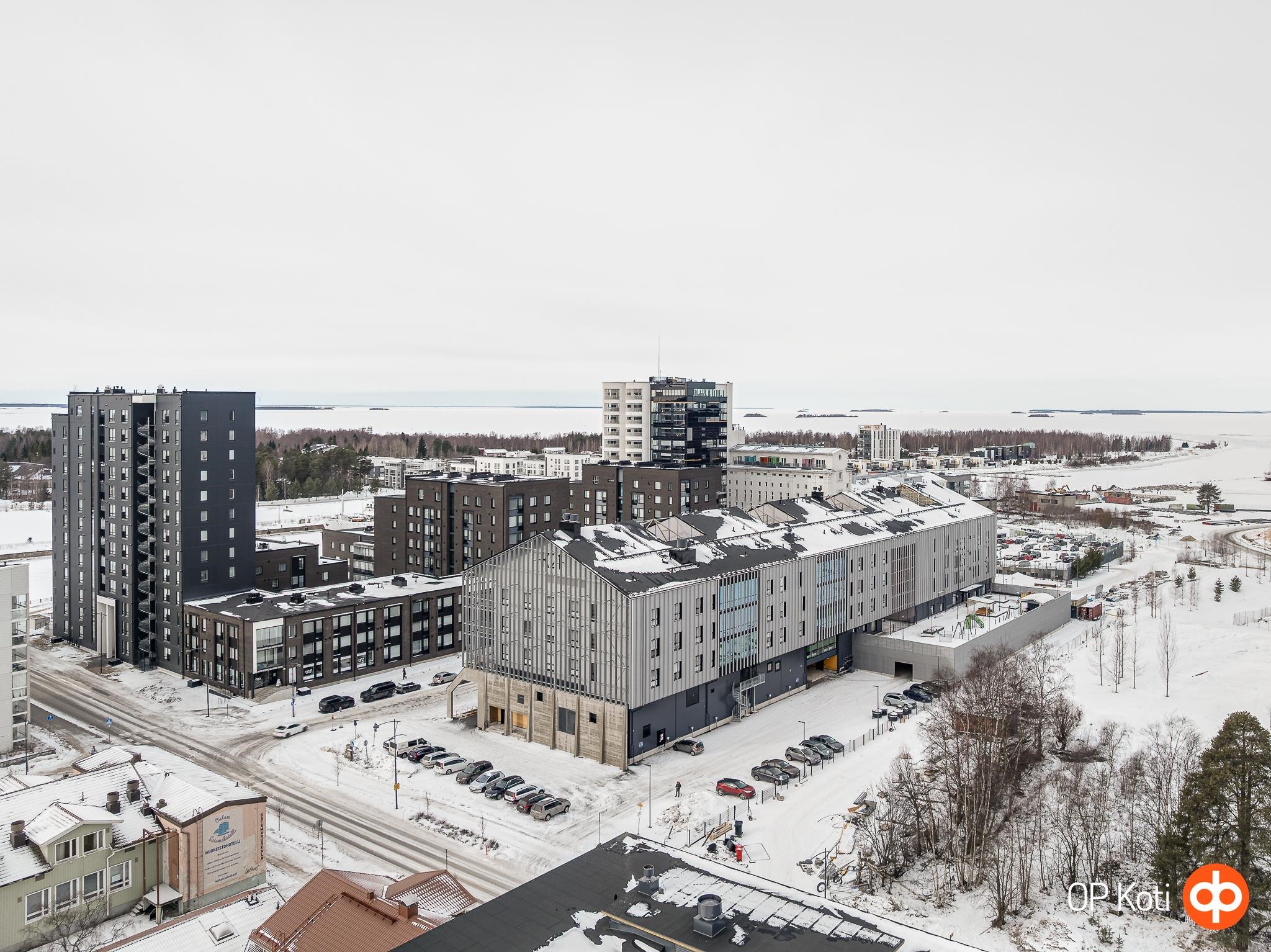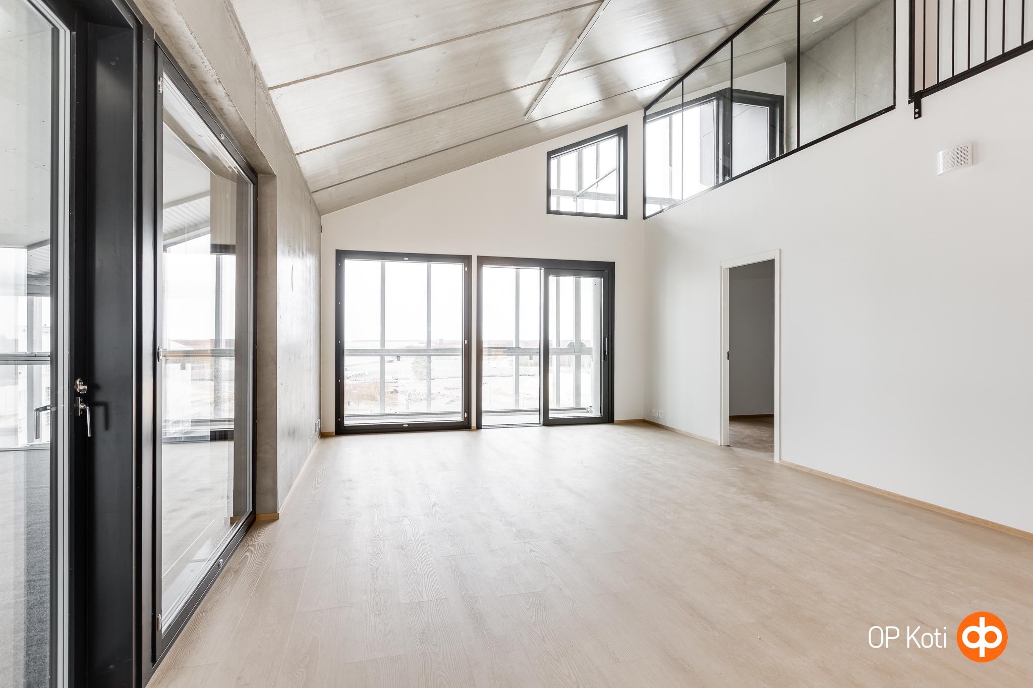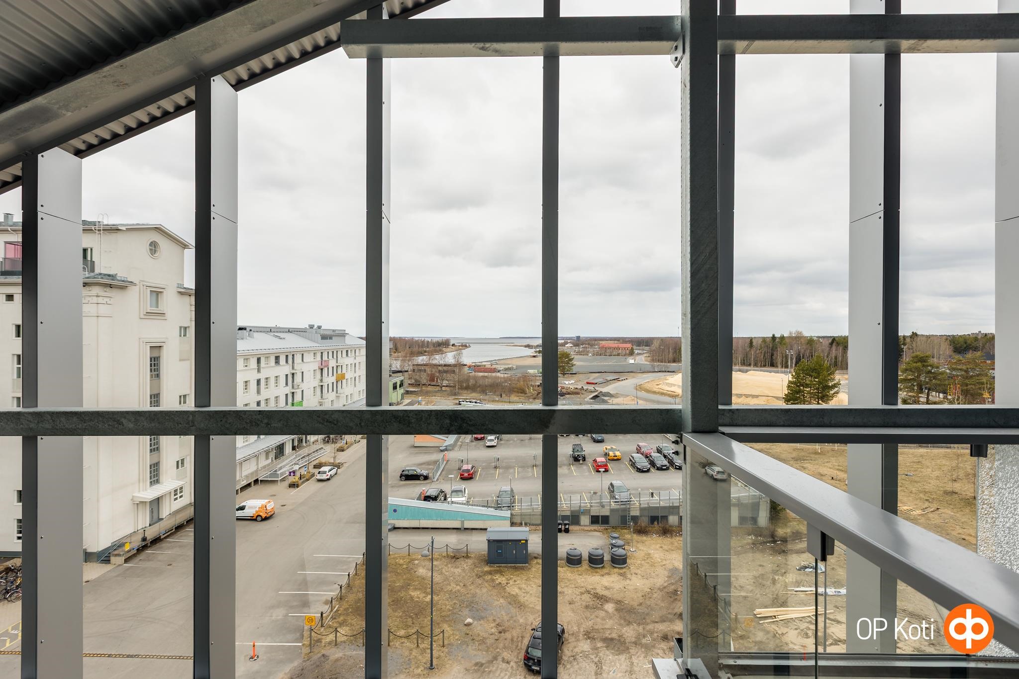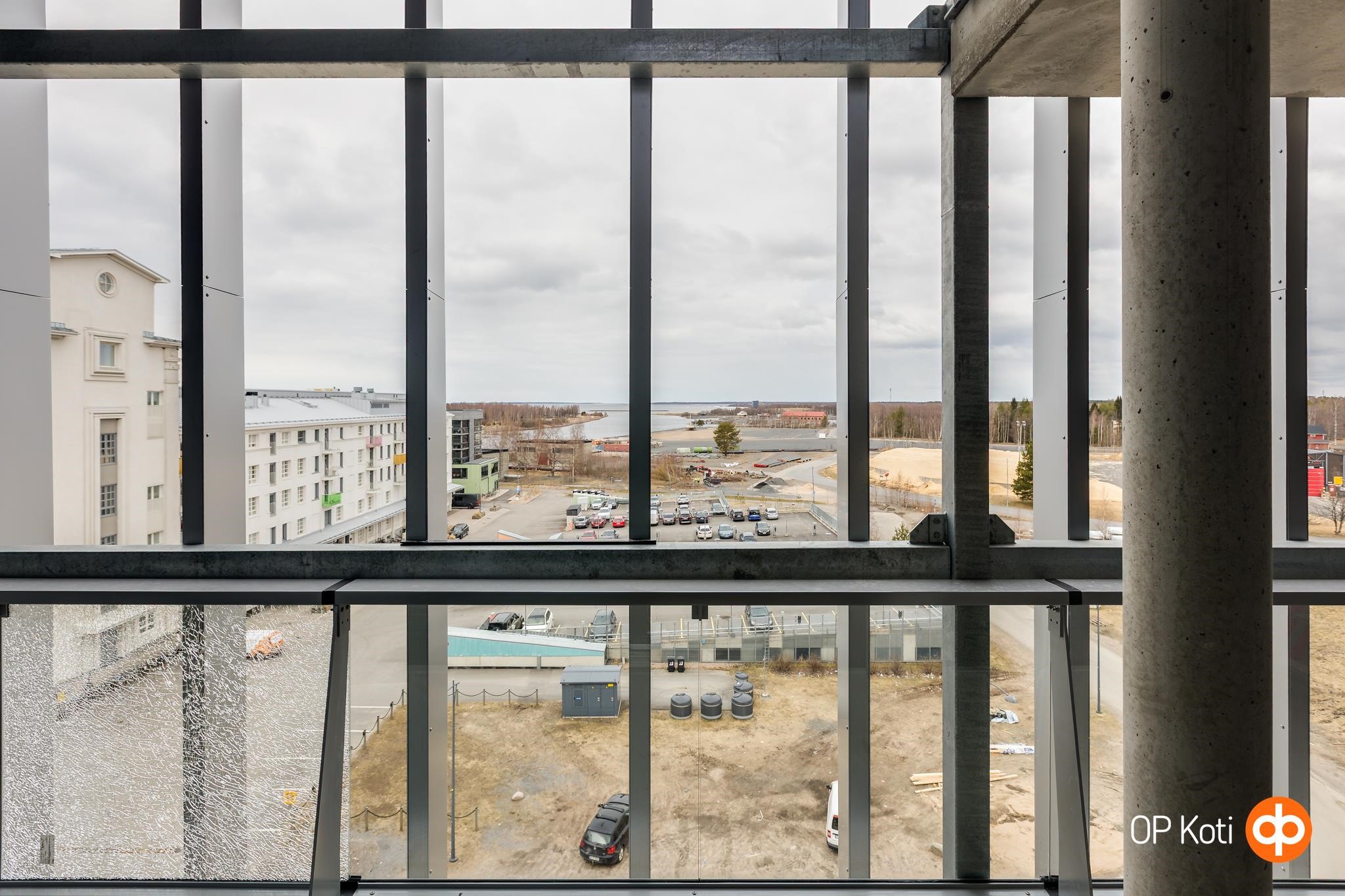 Olohuoneen ja keittiön vaikuttava huonekorkeus ja viisto sisäkatto tekevät tilasta avaran. Isot ikkunat aukaisevat näkymän merelle. Lasiliukuovi erottaa koko huoneiston levyisen parvekkeen, josta avautuu rauhoittava näkymä Toppilansalmeen. Tämä on täydellinen paikka viettää rauhallisia hetkiä auringonlaskun aikaan. Kaksi makuuhuonetta ja tilava oleskelu- ja ruokailutila ovat meren suuntaan, tuoden valoa ja avaruutta. Kolmen makuuhuoneen koti täyttää suuremmankin perheen asumistoiveet.