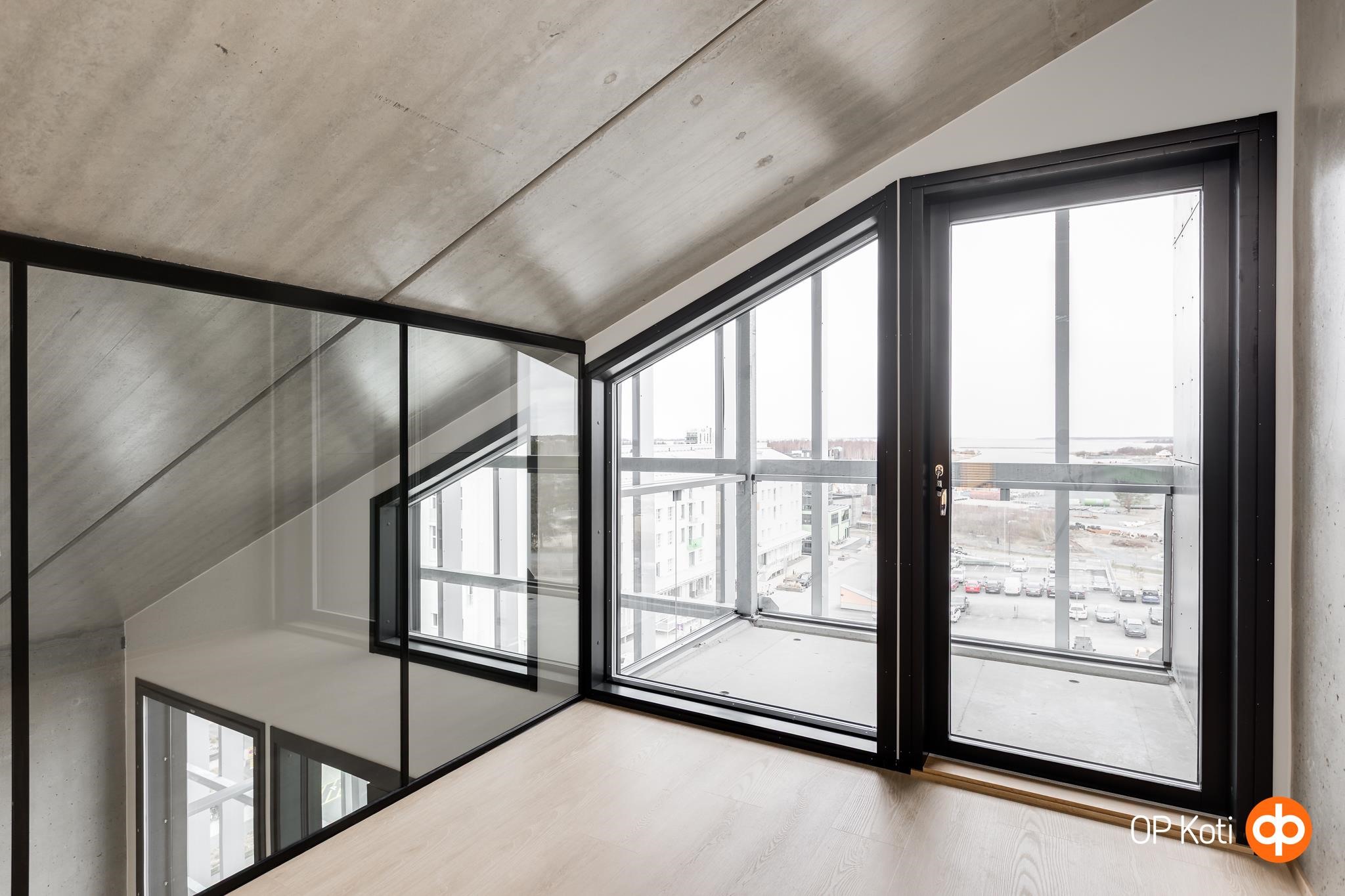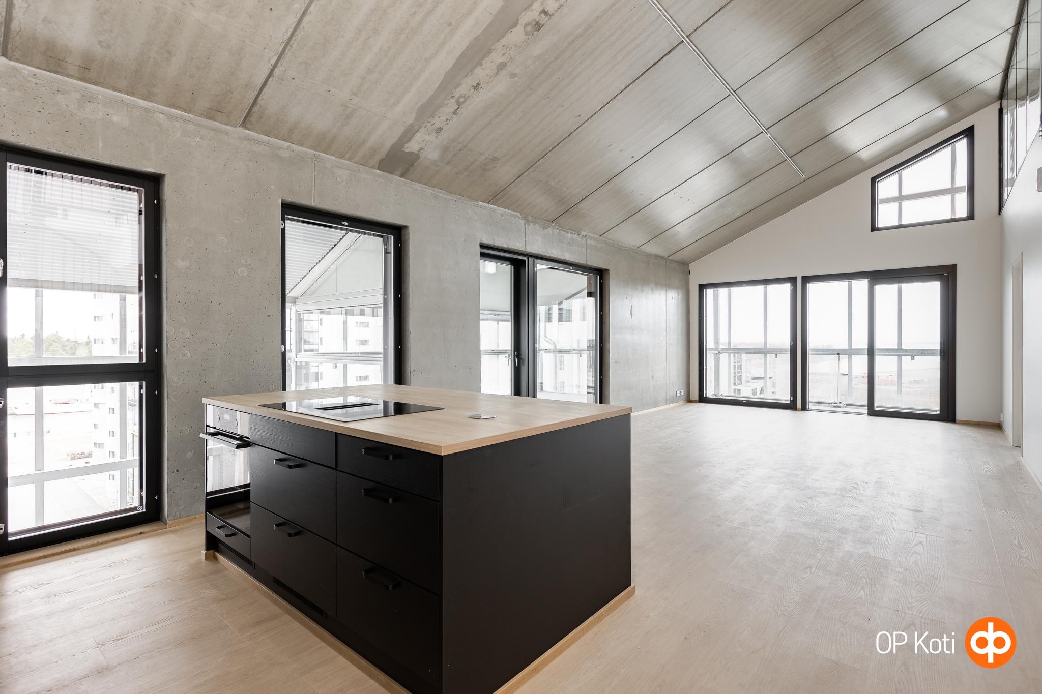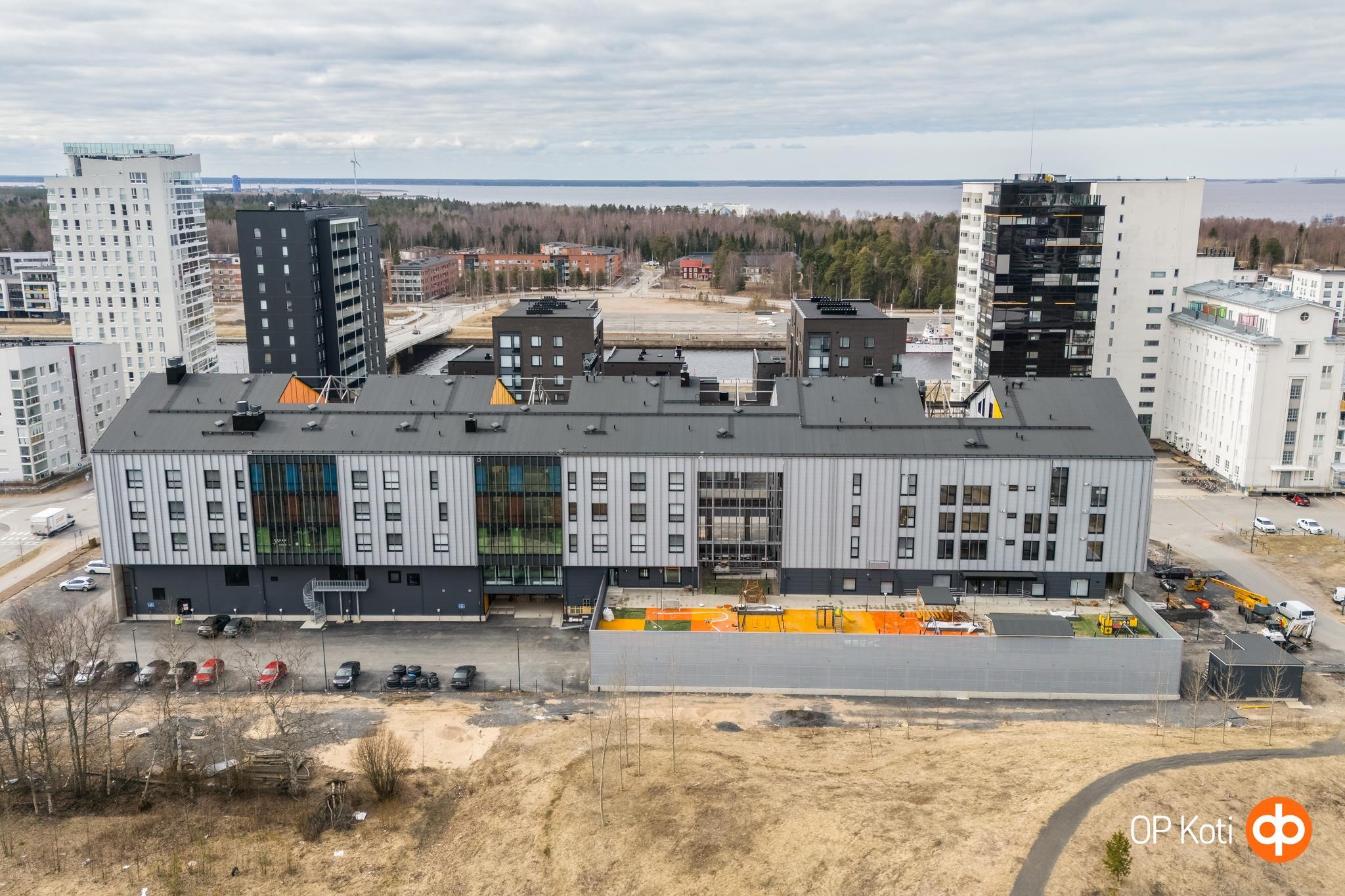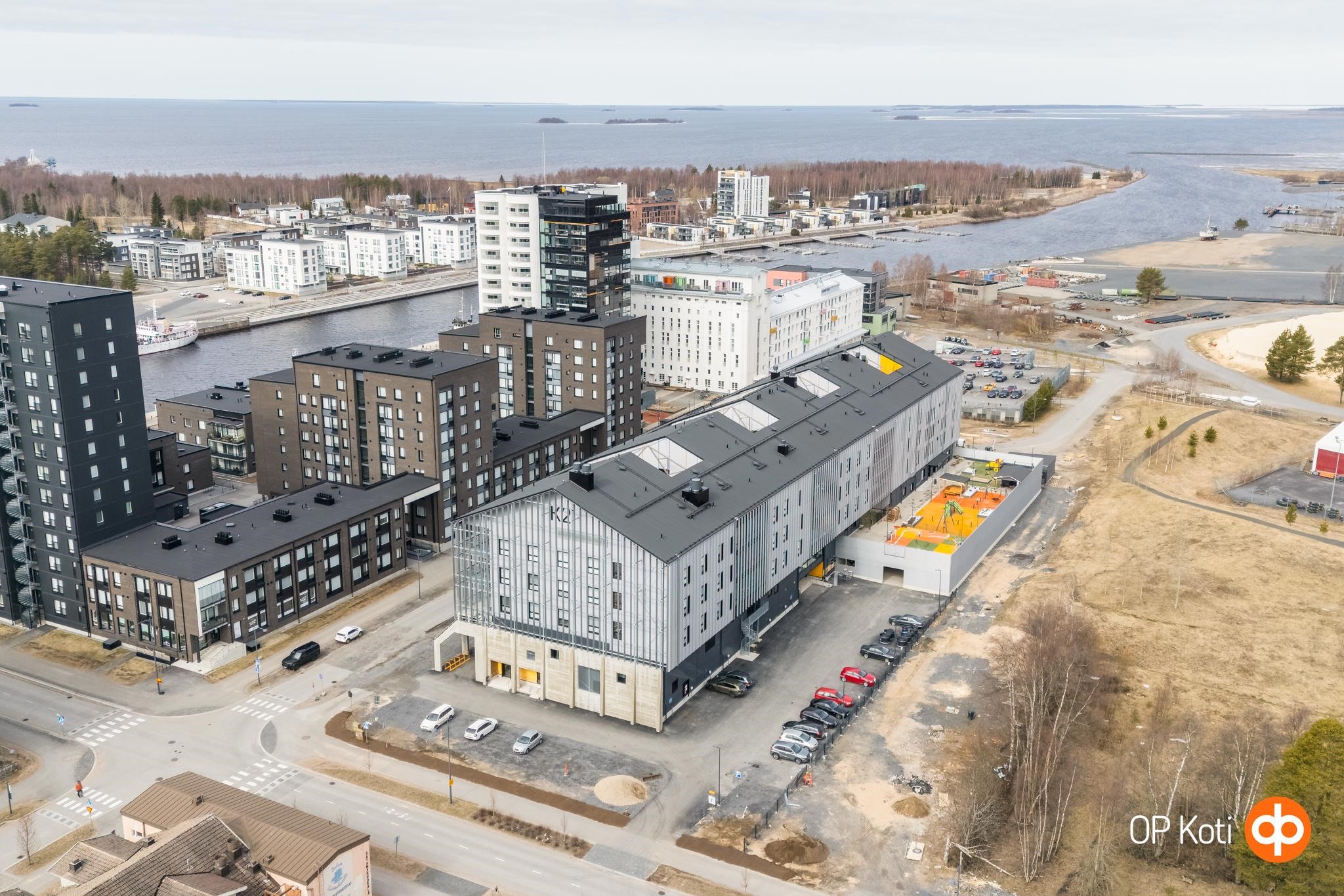 Olohuoneen ja keittiön vaikuttava huonekorkeus ja viisto sisäkatto tekevät tilasta avaran. Isot ikkunat aukaisevat näkymän merelle. Lasiliukuovi erottaa koko huoneiston levyisen parvekkeen, josta avautuu rauhoittava näkymä Toppilansalmeen. Tämä on täydellinen paikka viettää rauhallisia hetkiä auringonlaskun aikaan. Kaksi makuuhuonetta ja tilava oleskelu- ja ruokailutila ovat meren suuntaan, tuoden valoa ja avaruutta. Kolmen makuuhuoneen koti täyttää suuremmankin perheen asumistoiveet.