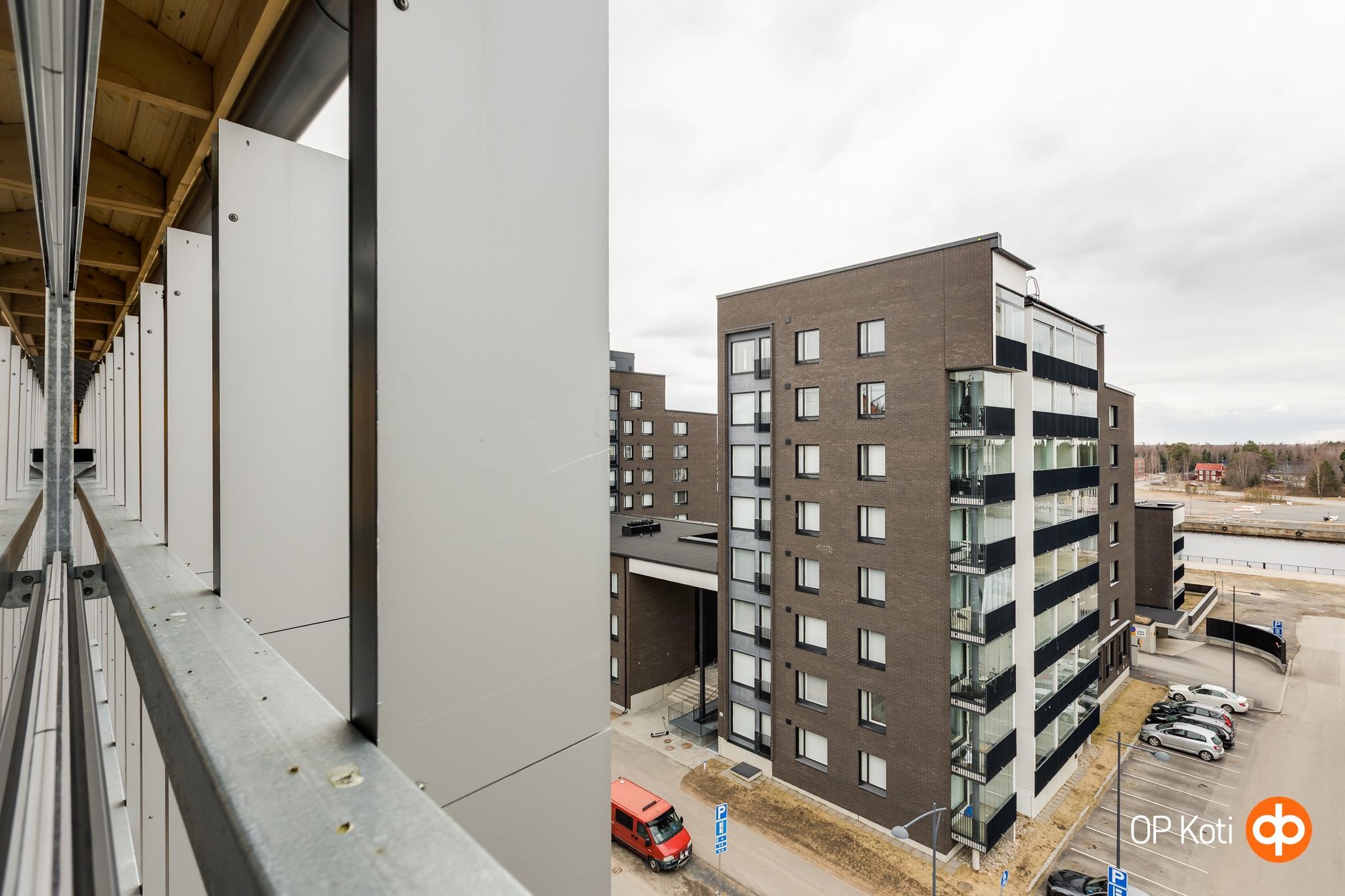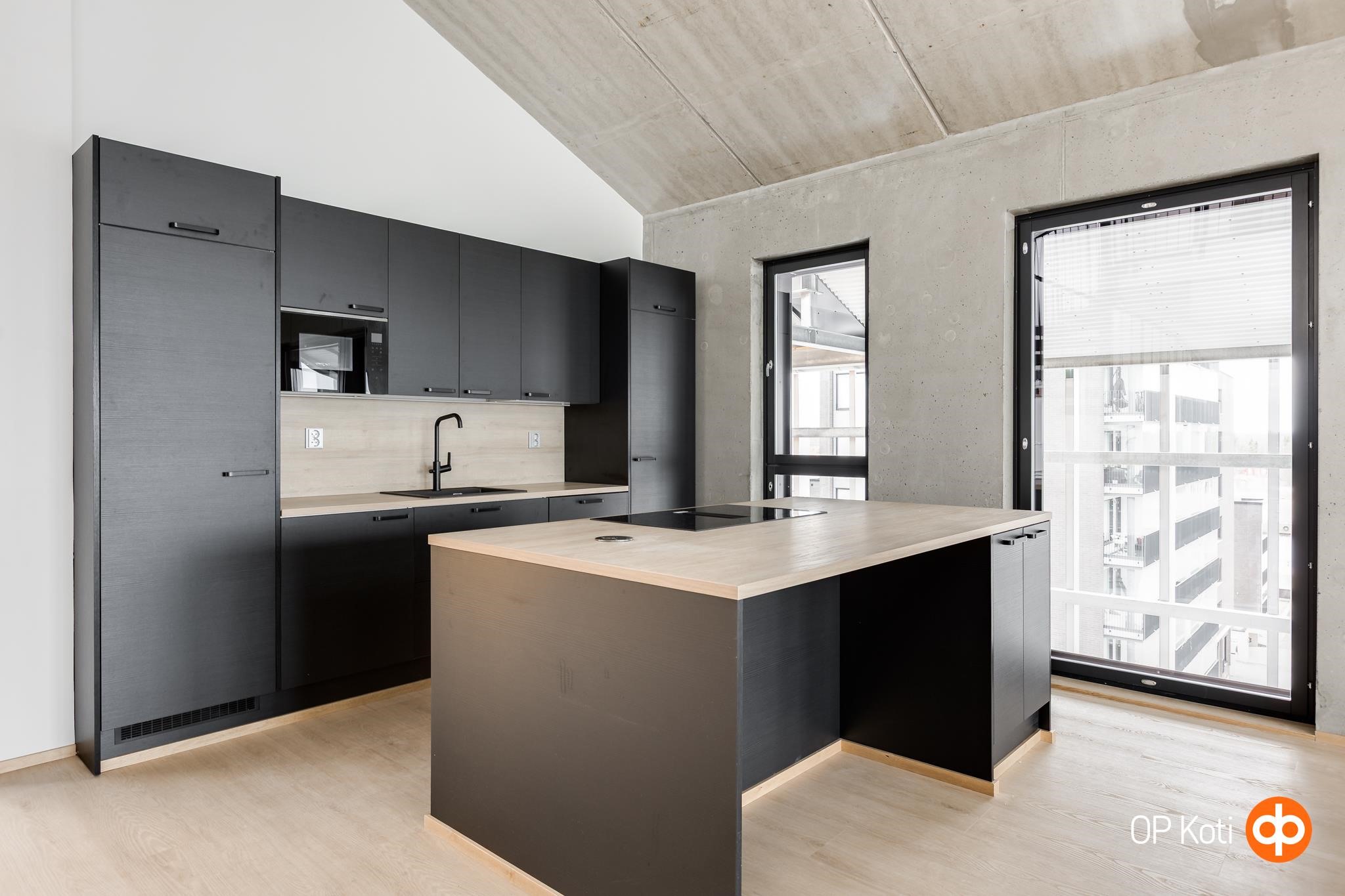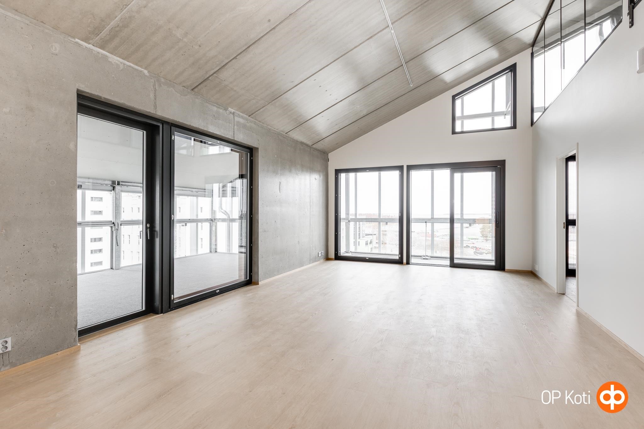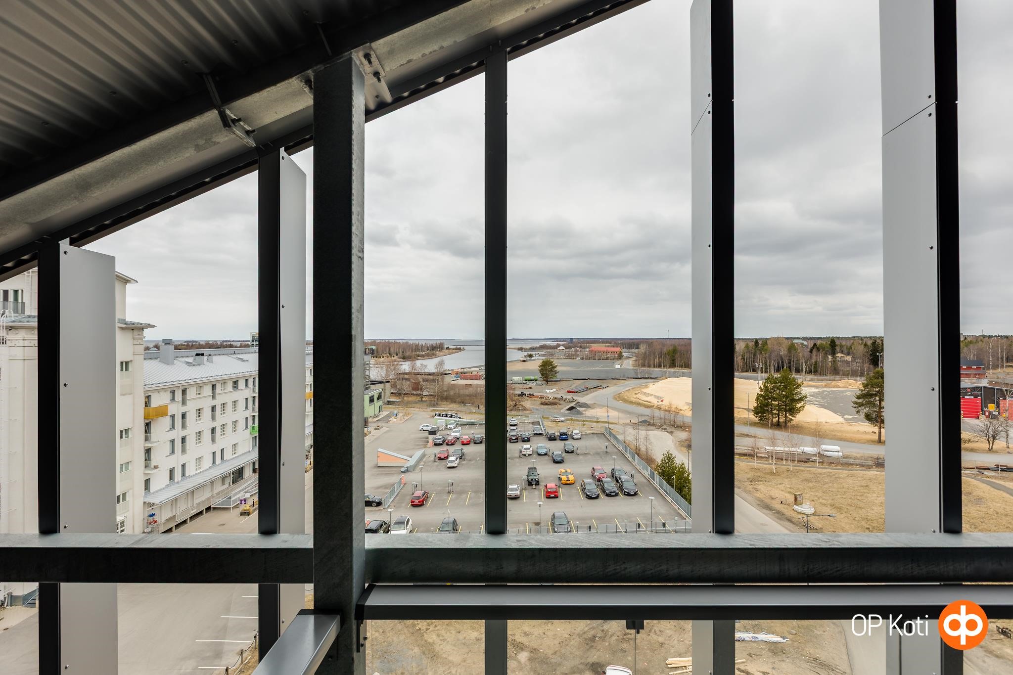 Olohuoneen ja keittiön vaikuttava huonekorkeus ja viisto sisäkatto tekevät tilasta avaran. Isot ikkunat aukaisevat näkymän merelle. Lasiliukuovi erottaa koko huoneiston levyisen parvekkeen, josta avautuu rauhoittava näkymä Toppilansalmeen. Tämä on täydellinen paikka viettää rauhallisia hetkiä auringonlaskun aikaan. Kaksi makuuhuonetta ja tilava oleskelu- ja ruokailutila ovat meren suuntaan, tuoden valoa ja avaruutta. Kolmen makuuhuoneen koti täyttää suuremmankin perheen asumistoiveet.