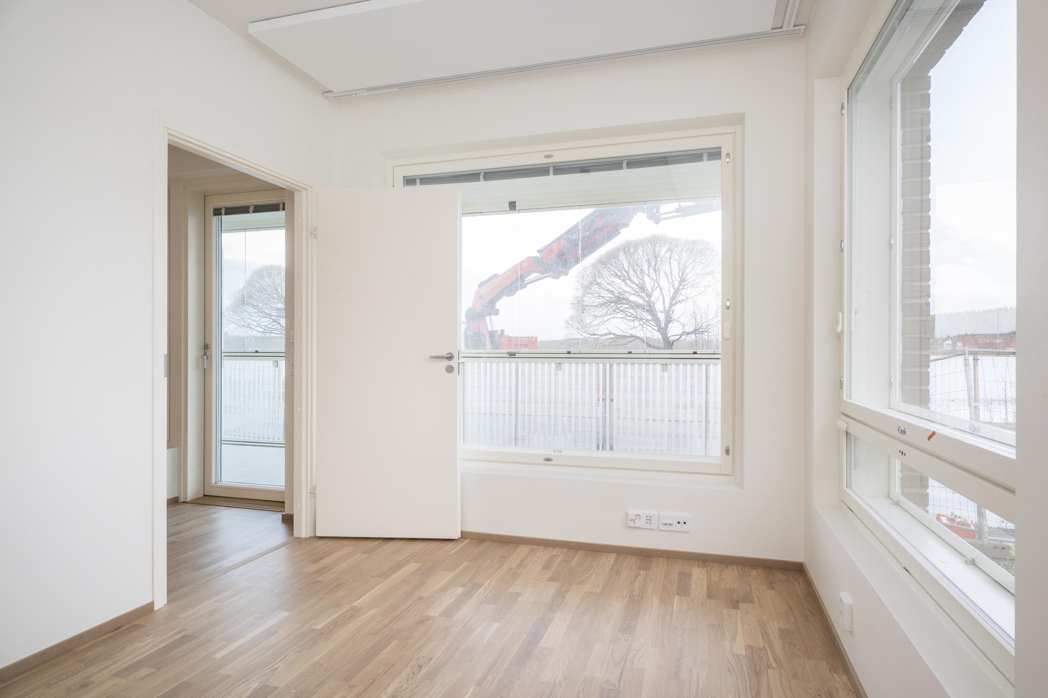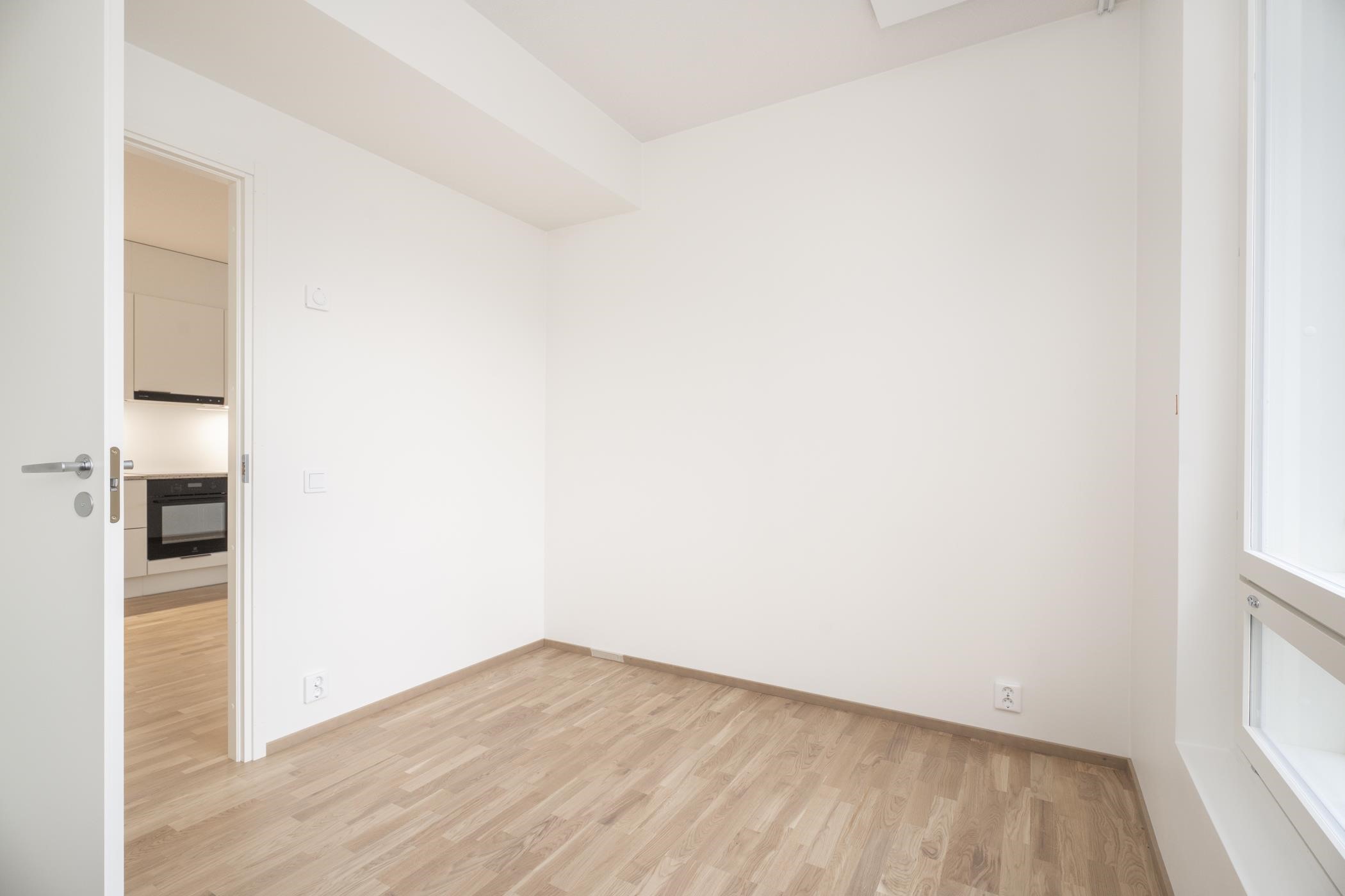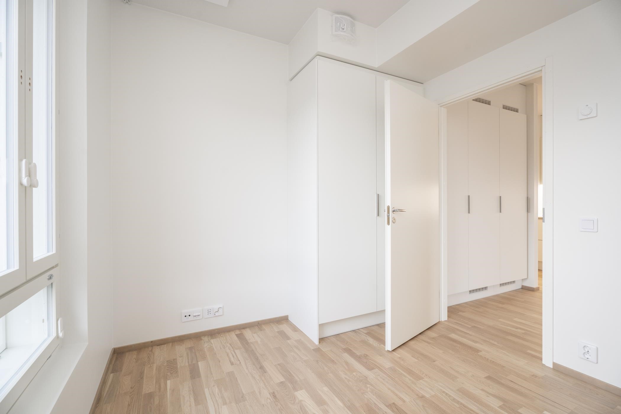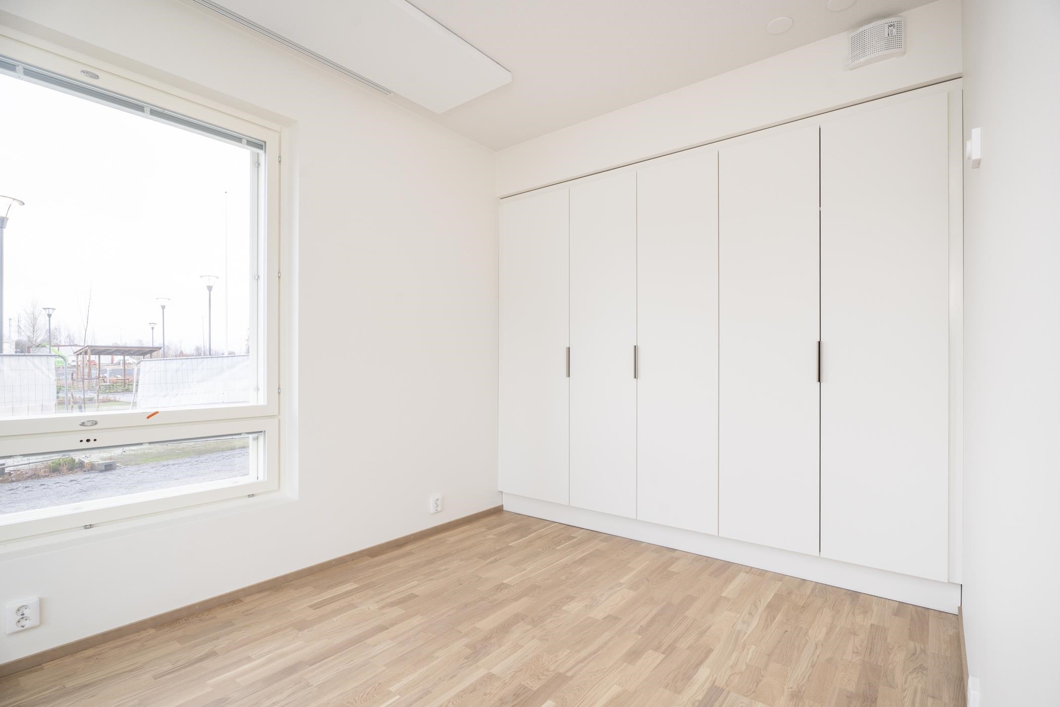Rakennusaikainen muutos: makuuhuoneen liukuoven tilalle otettu valkoinen sileä laakaovi.