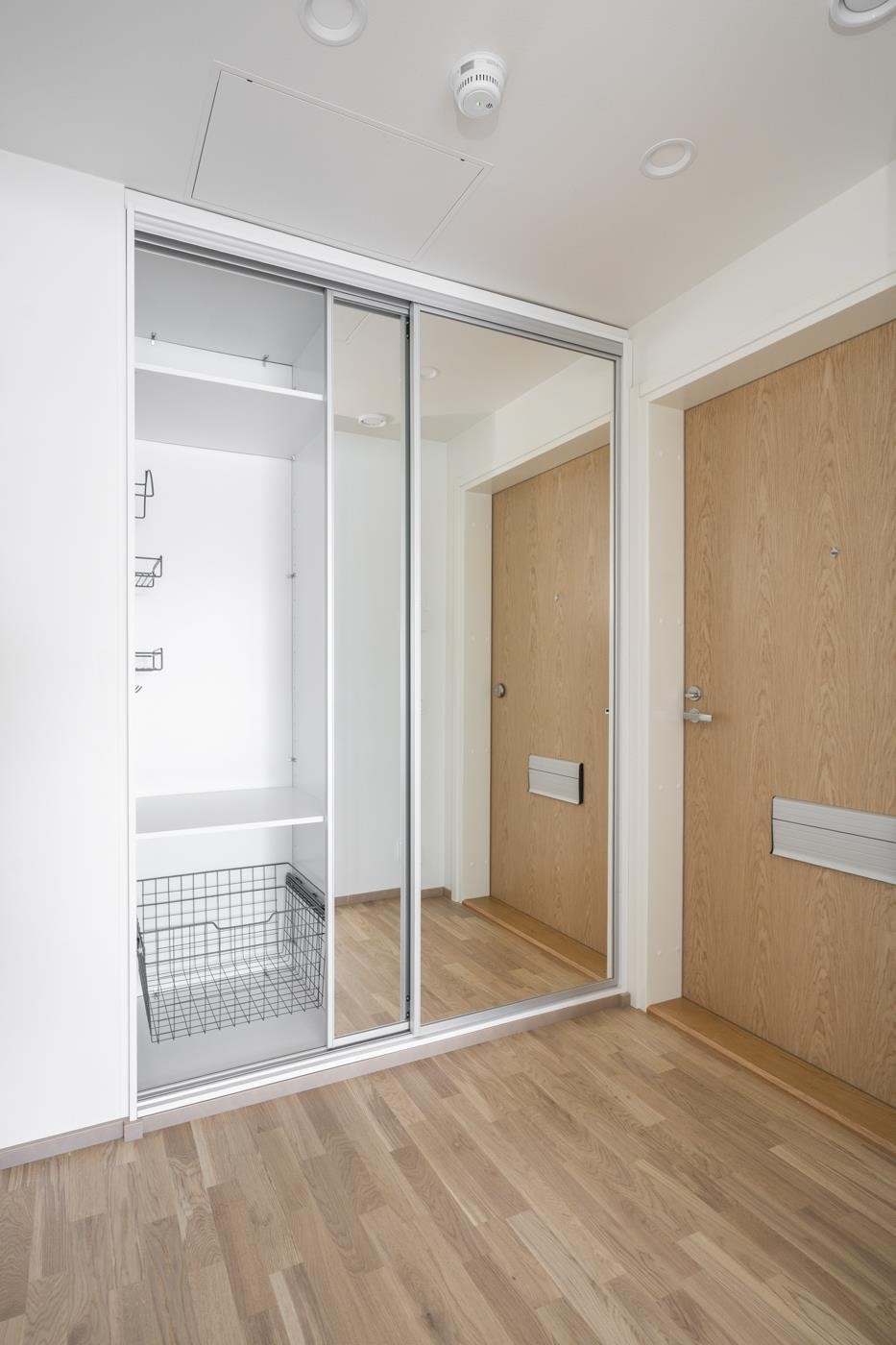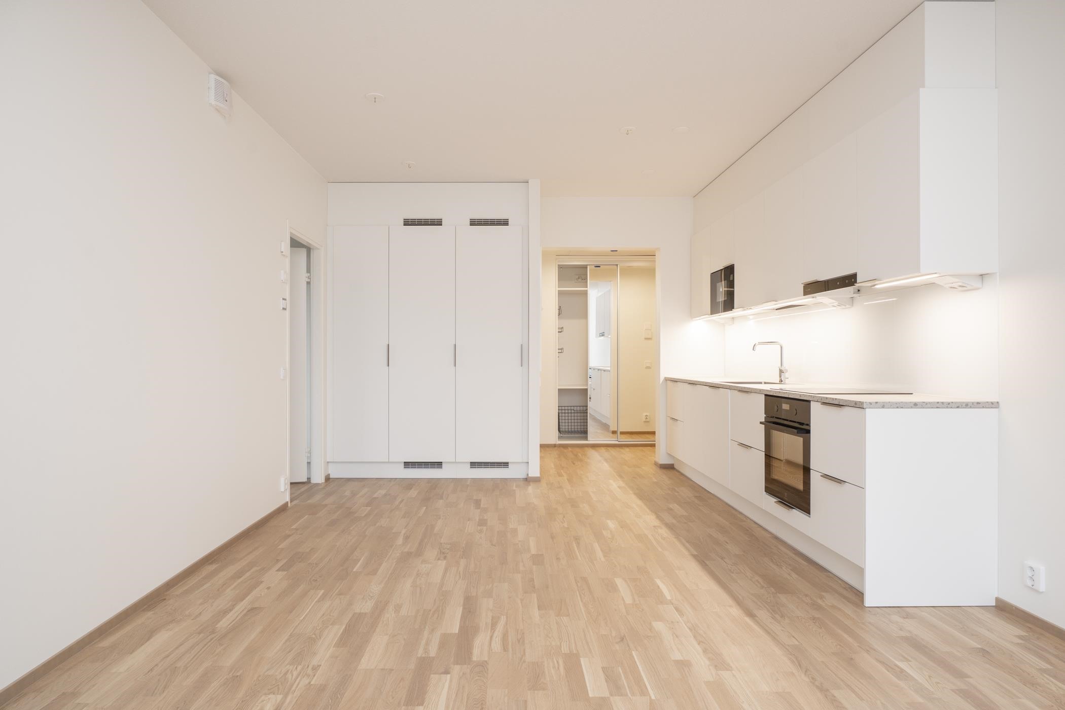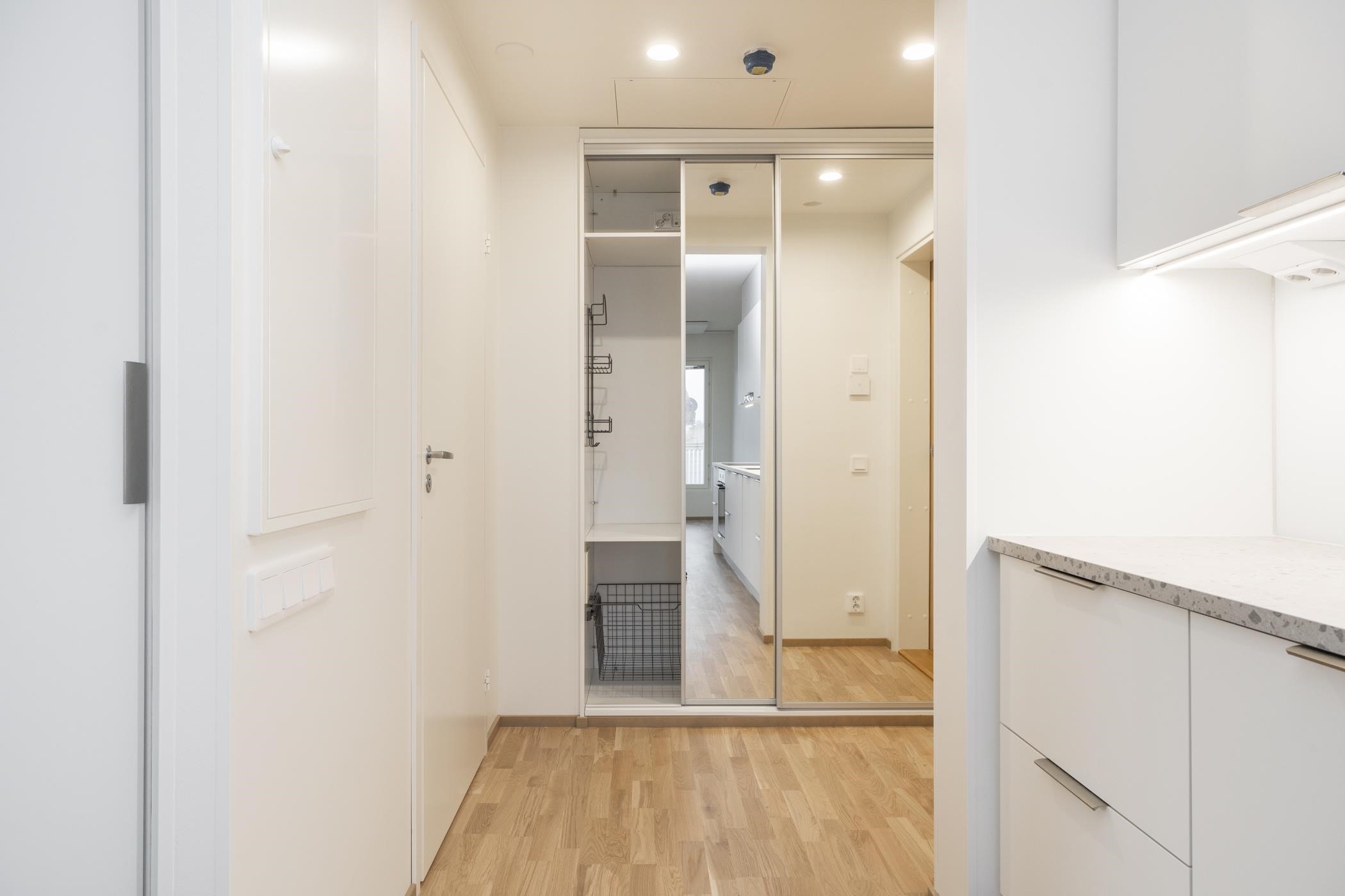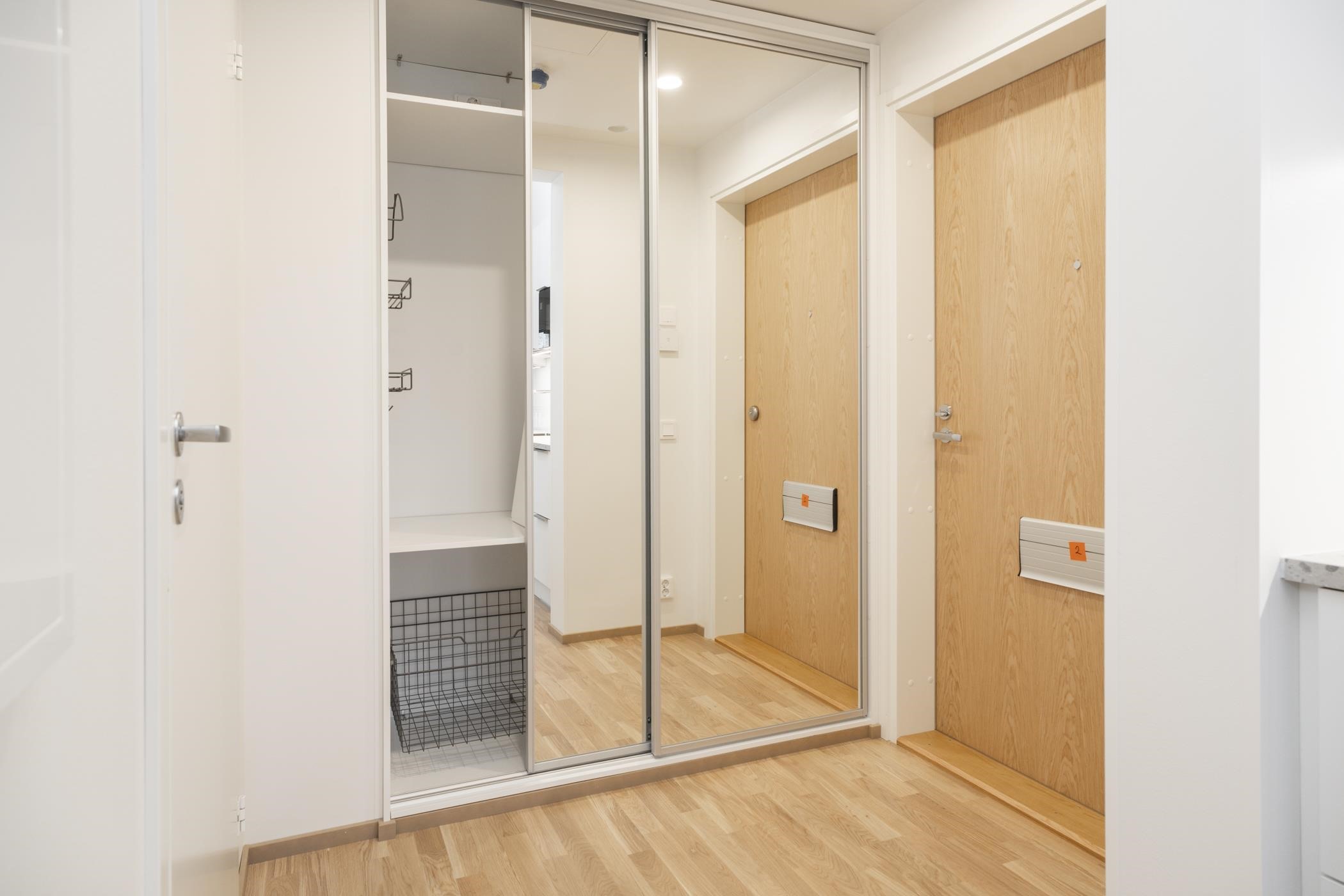 Rakennusaikainen muutos: makuuhuoneen liukuoven tilalle otettu valkoinen sileä laakaovi.