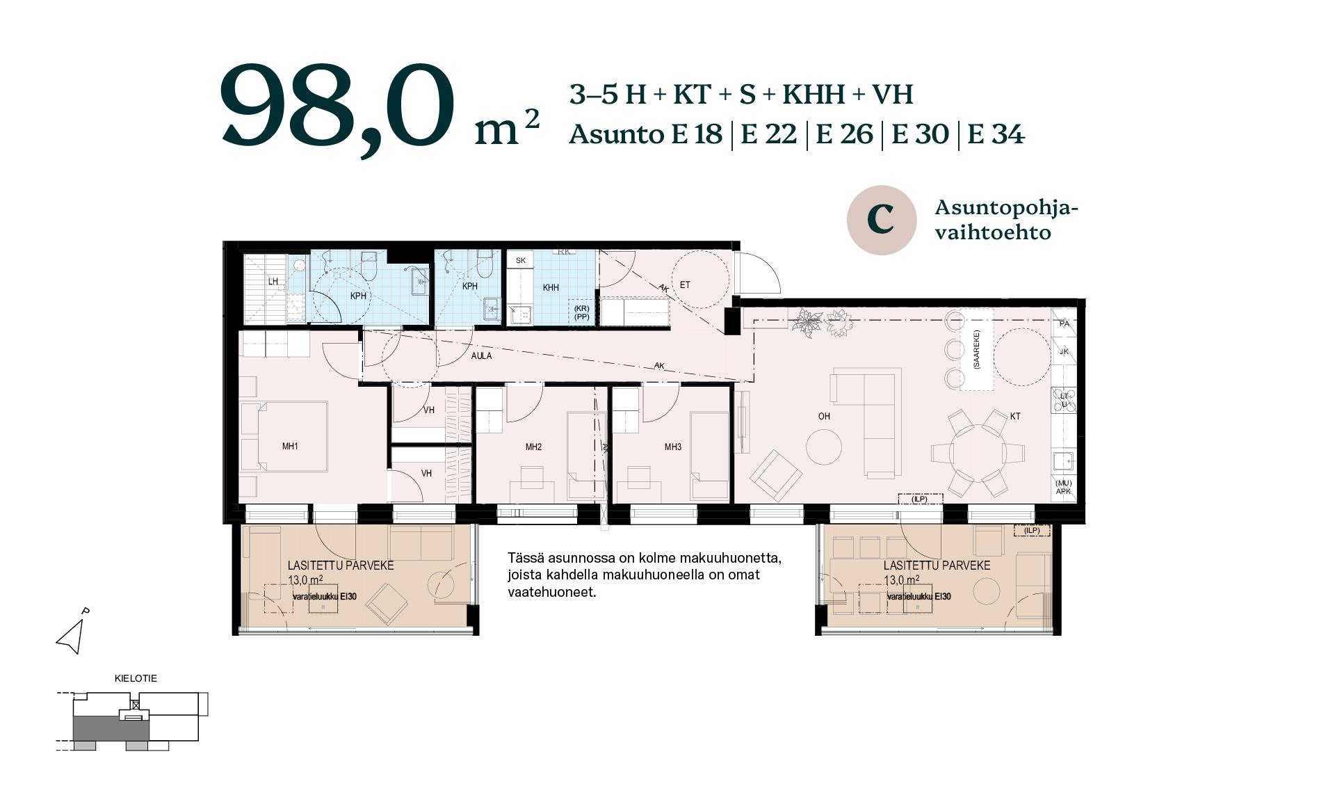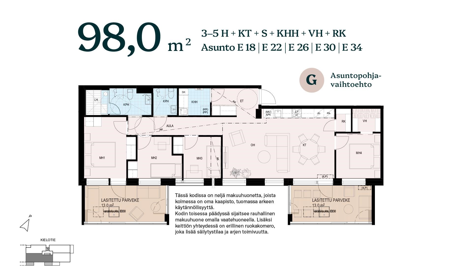 Koti on toteutettavissa kahden, kolmen tai jopa neljän makuuhuoneen kokonaisuutena, mahdollistaen sekä edustavan että perheystävällisen asumisen.