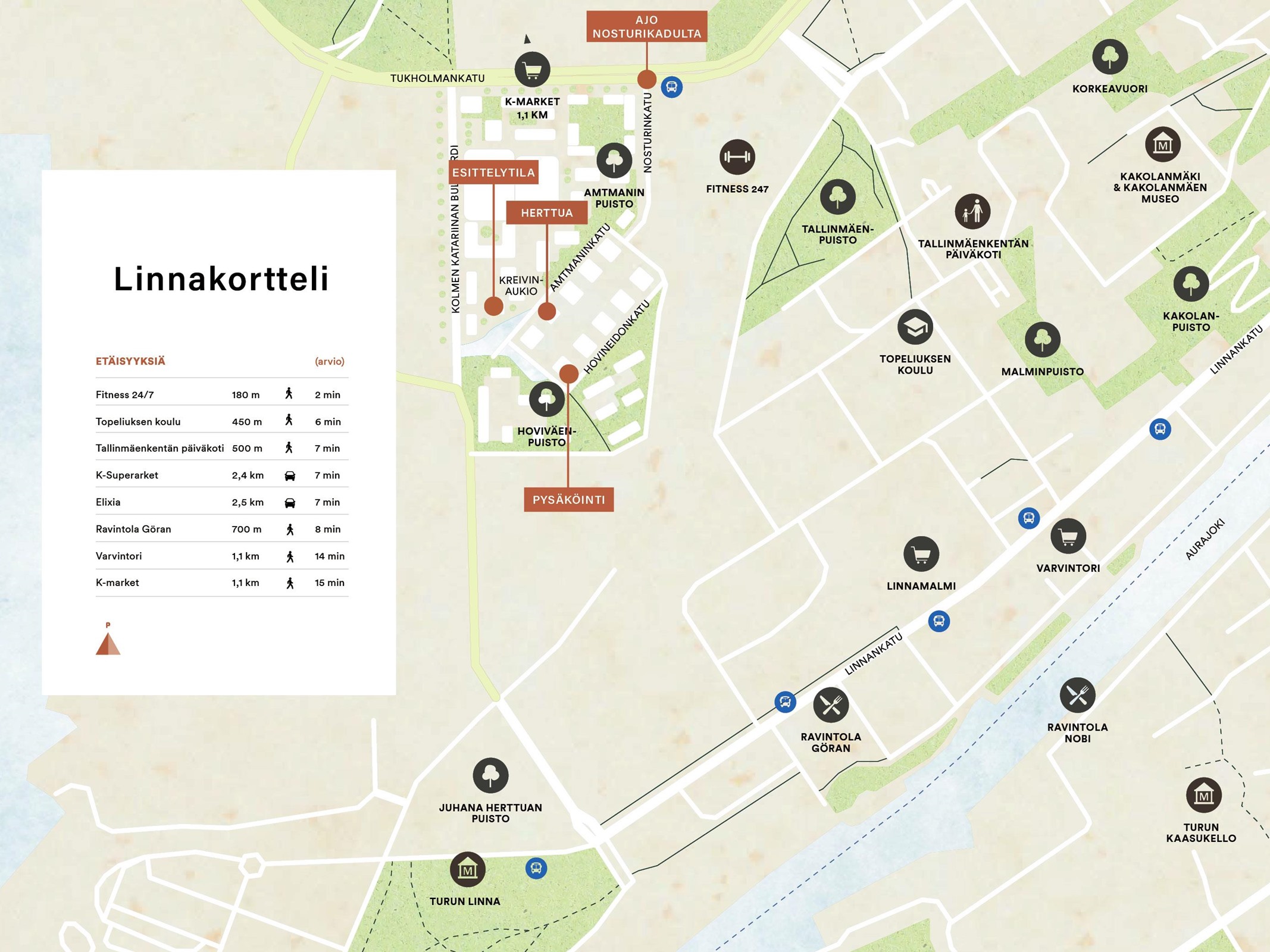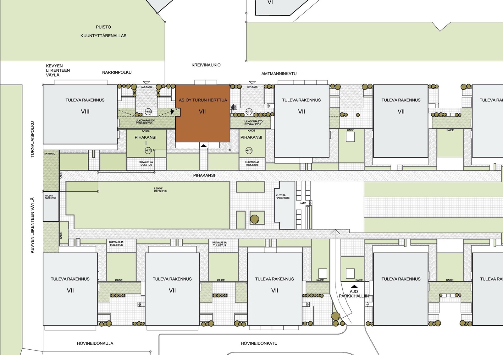 Autopaikat sijaitsevat talon yhteydessä erillisessä puolilämpimässä autotallissa (myydään erikseen omina osakkeina) Vieraspaikat rakentuvat pihakannelle. Ylimmän kerroksen asunnoissa ilmalämpöpumpulle sähkö- ja reikävaraus. Materiaalit ja laitteet voivat muuttua rakennusaikana tavarantoimittajasta johtuen. Tällöin muutos korvataan vastaavalla tuotteella. Asunto Oy Turun Herttuan hallitsema tontti on valinnainen vuokratontti, kiinteistötunnus 853-61-20-4.